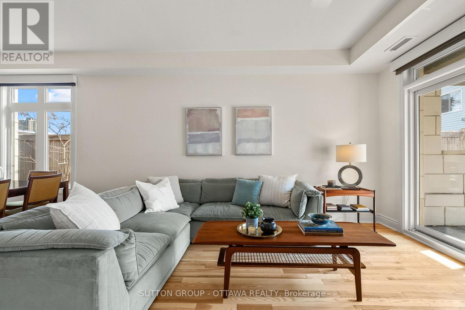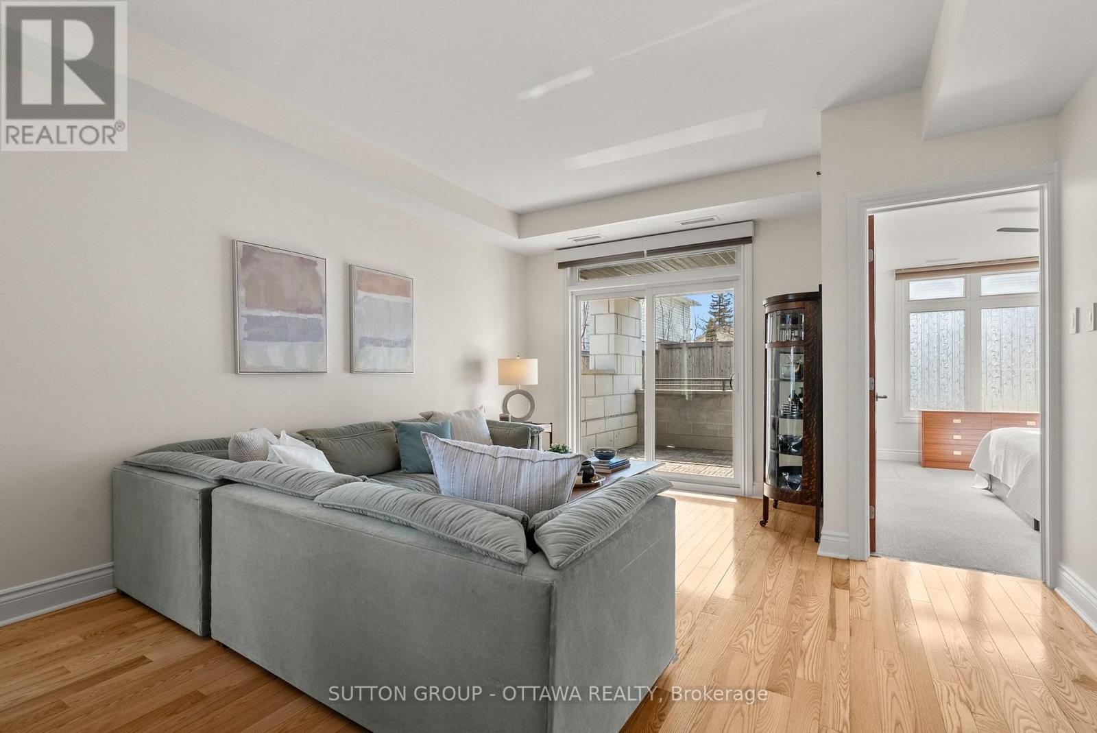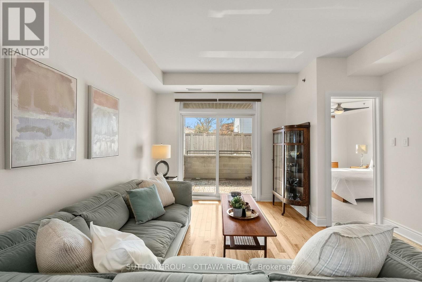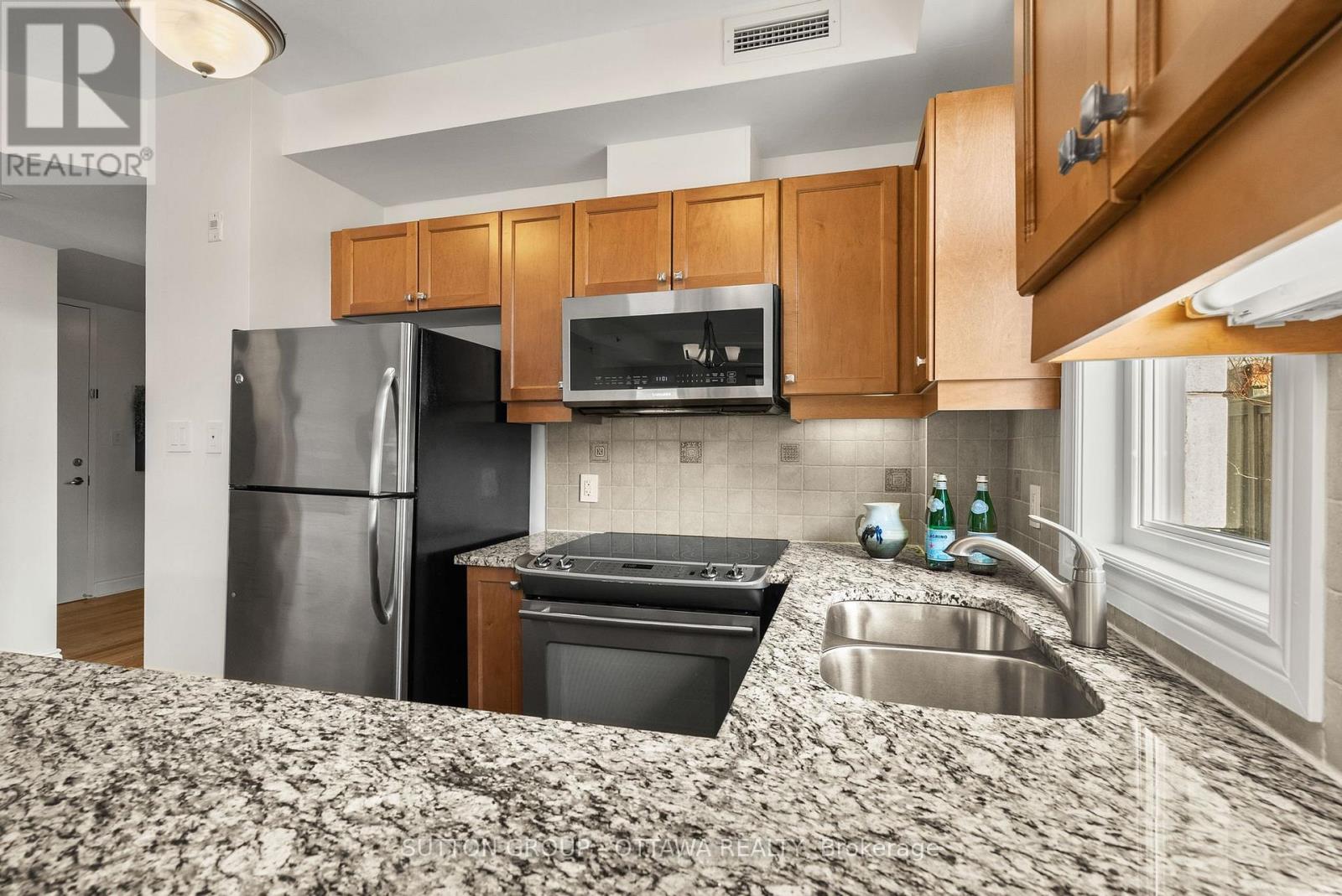 TASTEFULLY UPDATED CONDO IN THE HEART OF WESTBORO! This 2 bedroom+Den, 2 full bathroom main level unit is at the end of the first floor making it incredibly quiet and private, yet accessible for those with mobility needs! This unit is fitted with custom Lutron automated (programmable/remote controlled) blinds and lighting (2020) which is an added bonus for accessibility and overall convenience. The kitchen overlooking the living/dining area features granite countertops, stainless steel appliances, and a large peninsula offering additional seating. The spacious, open concept living/dining area features plenty of room for full size furniture making dinner parties a delight! The primary bedroom with a huge, sunny window, has a walk-in closet which leads the way to the fully renovated ensuite bathroom (2019). This ensuite was custom designed with accessibility in mind while maintaining a luxe feel (glass enclosed shower with no curb, comfort height toilet, etc.). The second bedroom is a great size and has access to the second full bath (with shower/tub combo) off the main space. Enjoy your morning coffee on the private, elevated balcony with entry from either the primary bedroom or living space. The bonus den is perfect as a reading nook or home office. To top it off, this unit features convenient in-suite laundry, plenty of closet space, as well as a designated storage locker and underground parking spot. Nothing is missing!! UPGRADES: Air Handler & On Demand Water Heater 2022, AC 2025, Professionally Painted 2026, Miele Dishwasher + Miele Stacking Washer & Dryer replaced within the last few years. Work out in the building's gym or host large gatherings in the fully equipped party room. In less than 10 minutes, walk to restaurants, coffee shops, grocery stores (Farm Boy!), recreation, future Westboro station & more! Book your showing today! (id:44758)