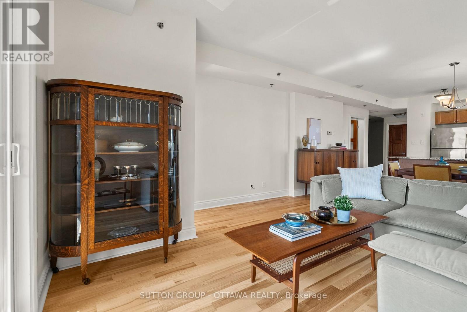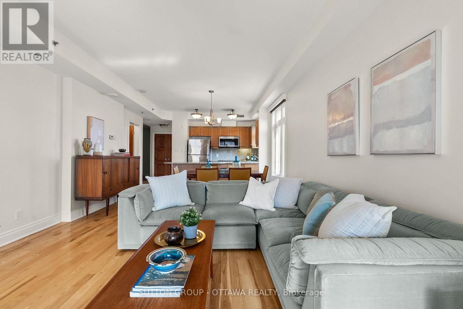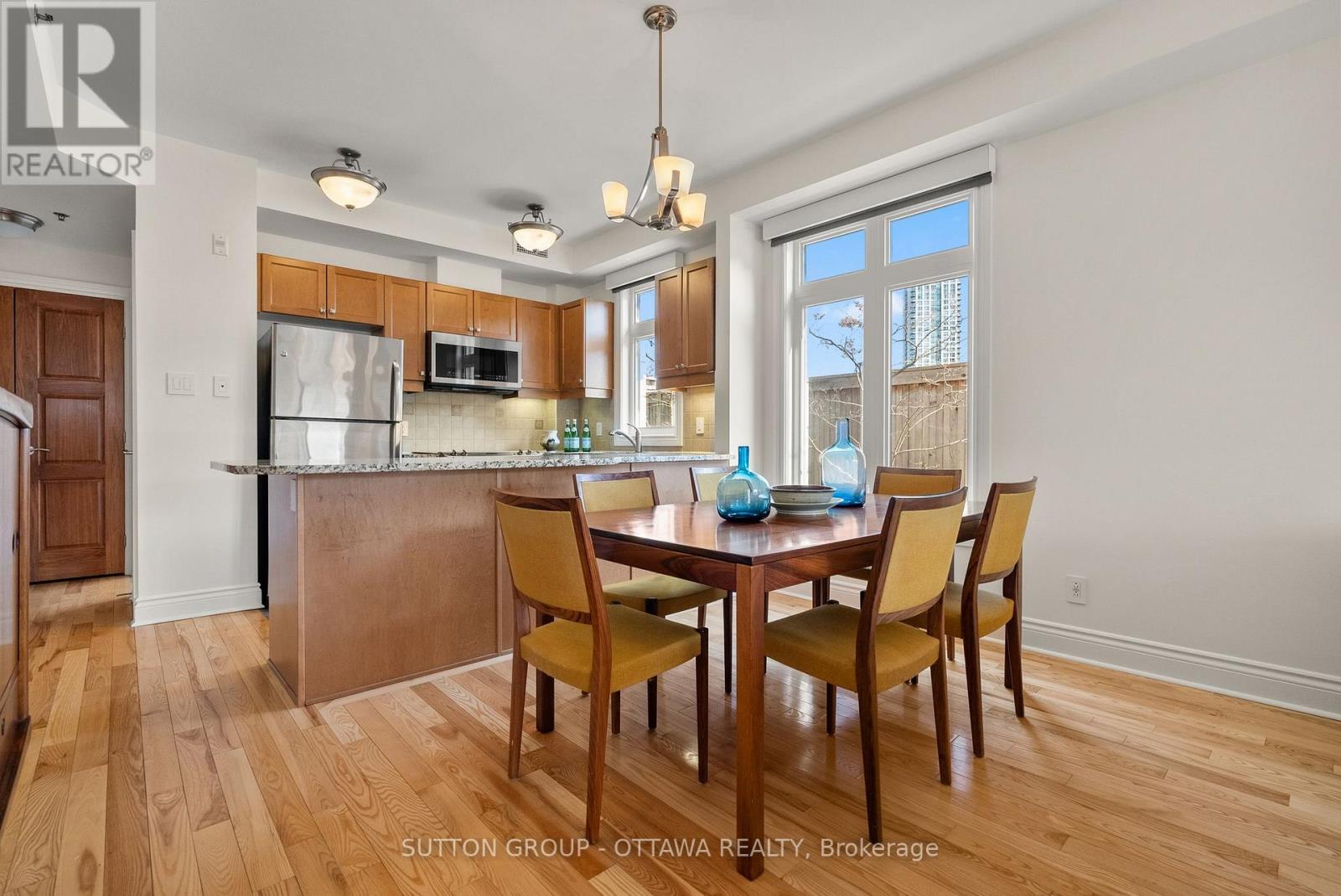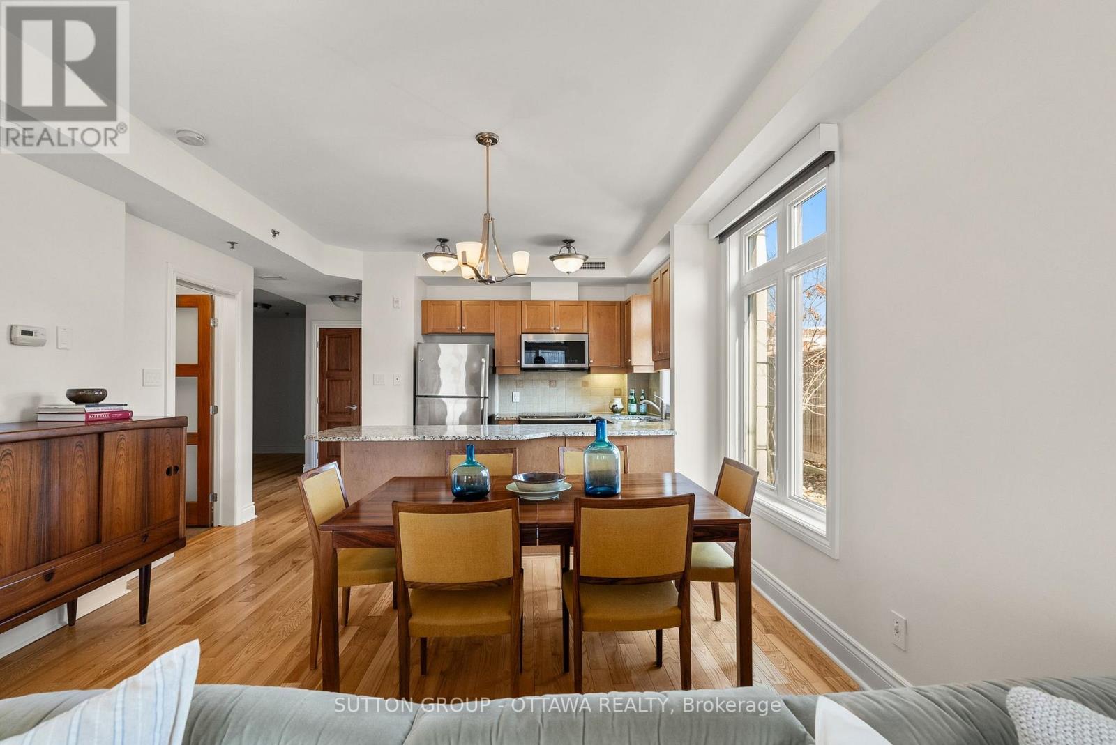 TASTEFULLY UPDATED CONDO IN THE HEART OF WESTBORO! This 2 bedroom+Den, 2 full bathroom main level unit is at the end of the first floor making it incredibly quiet and private, yet accessible for those with mobility needs! This unit is fitted with custom Lutron automated (programmable/remote controlled) blinds and lighting (2020) which is an added bonus for accessibility and overall convenience. The kitchen overlooking the living/dining area features granite countertops, stainless steel appliances, and a large peninsula offering additional seating. The spacious, open concept living/dining area features plenty of room for full size furniture making dinner parties a delight! The primary bedroom with a huge, sunny window, has a walk-in closet which leads the way to the fully renovated ensuite bathroom (2019). This ensuite was custom designed with accessibility in mind while maintaining a luxe feel (glass enclosed shower with no curb, comfort height toilet, etc.). The second bedroom is a great size and has access to the second full bath (with shower/tub combo) off the main space. Enjoy your morning coffee on the private, elevated balcony with entry from either the primary bedroom or living space. The bonus den is perfect as a reading nook or home office. To top it off, this unit features convenient in-suite laundry, plenty of closet space, as well as a designated storage locker and underground parking spot. Nothing is missing!! UPGRADES: Air Handler & On Demand Water Heater 2022, AC 2025, Professionally Painted 2026, Miele Dishwasher + Miele Stacking Washer & Dryer replaced within the last few years. Work out in the building's gym or host large gatherings in the fully equipped party room. In less than 10 minutes, walk to restaurants, coffee shops, grocery stores (Farm Boy!), recreation, future Westboro station & more! Book your showing today! (id:44758)