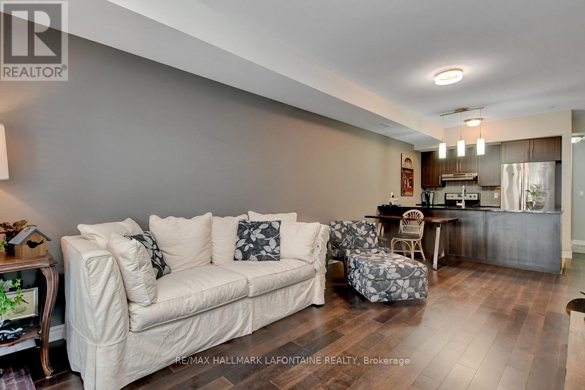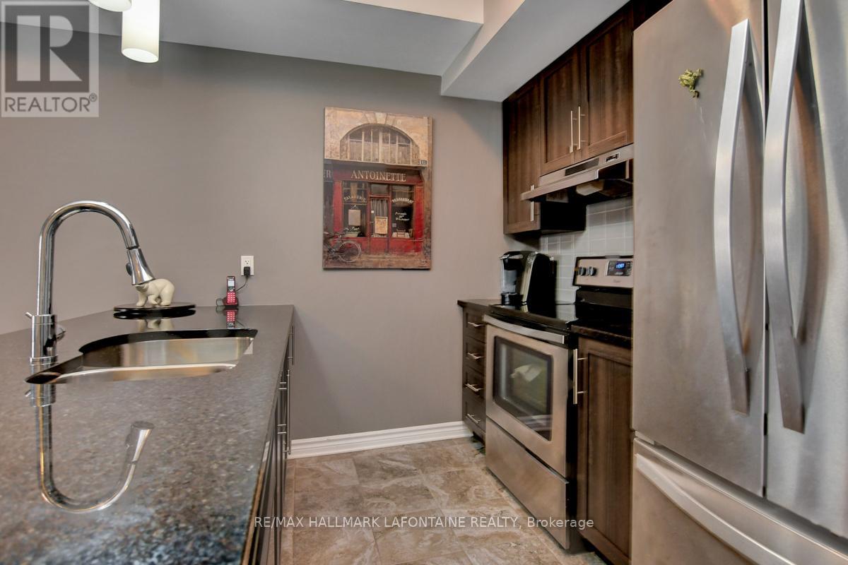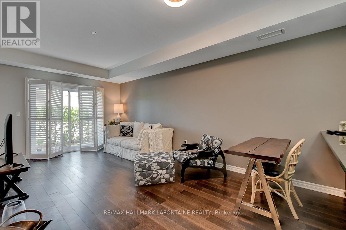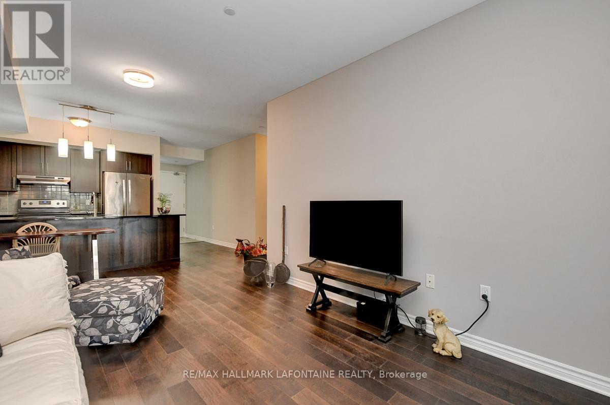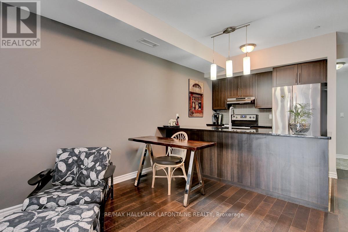 Welcome to Petrie's Landing! This spacious and thoughtfully designed 2-bedroom condo combines modern comfort with a fantastic location. Enjoy effortless access to transportation and the beautiful Ottawa River trails just steps from your door.The bright, open-concept living and dining area features engineered hardwood flooring, California shutters, and sliding doors that lead to your private terrace - perfect for morning coffee or evening relaxation. The kitchen boasts granite countertops, a breakfast bar, stainless steel appliances, and a stylish backsplash.The generous primary bedroom includes a luxurious ensuite with a soaker tub, separate shower, granite counters, and ceramic tile flooring. A second full bathroom with matching finishes conveniently connects to the in-unit laundry room.Nestled on the quiet side of the building, this condo is surrounded by greenery and even has a small park right out front. A wonderful blend of nature, style, and convenience - come see it for yourself! (id:44758)