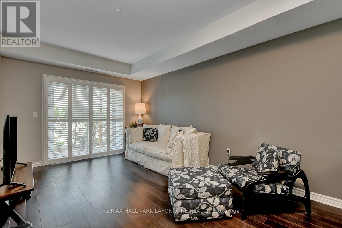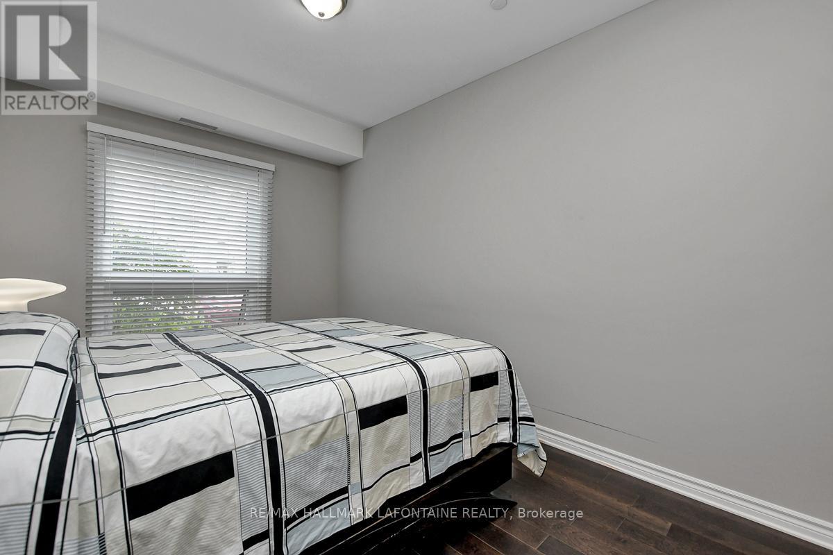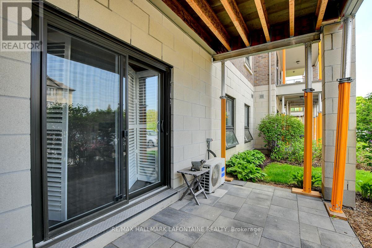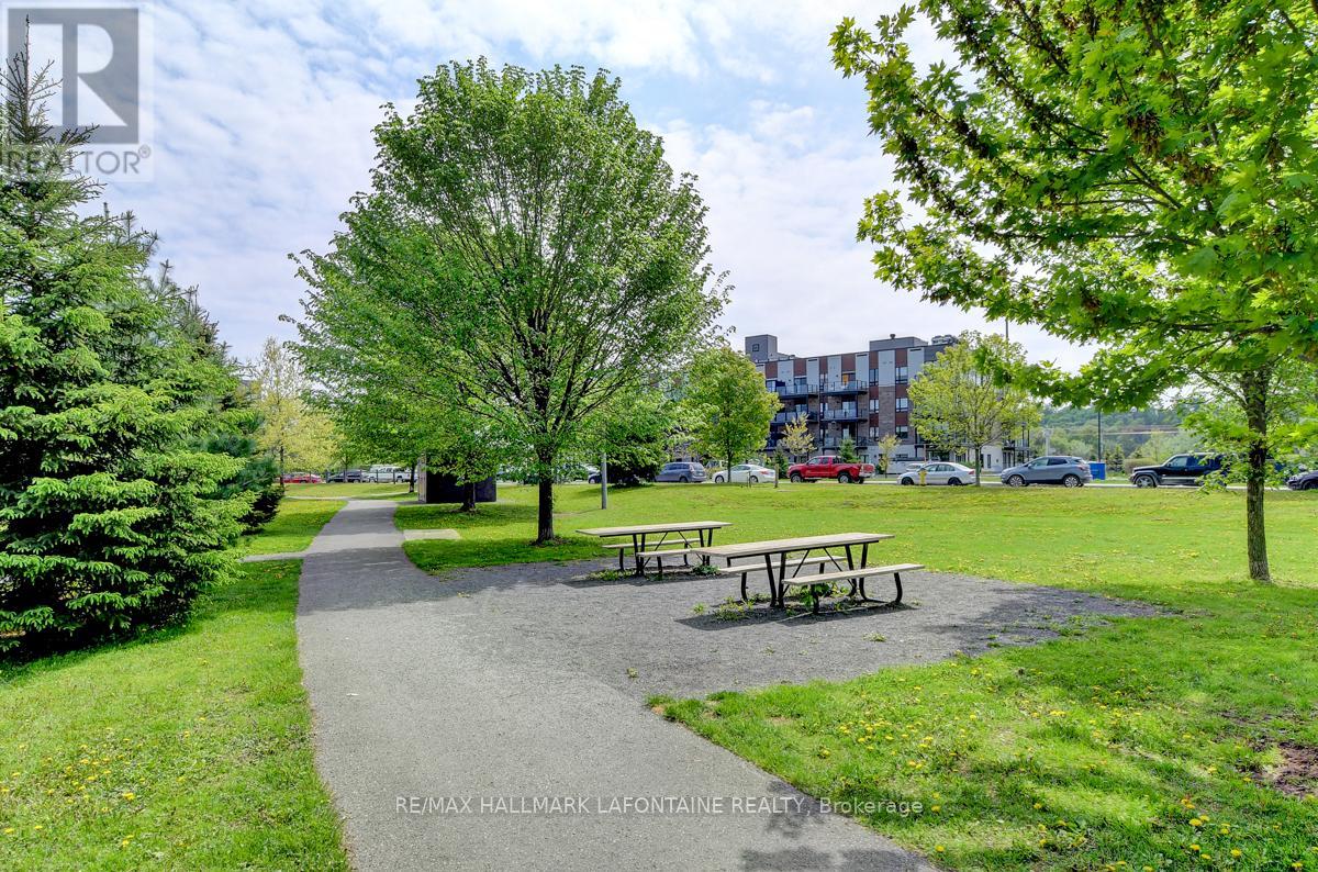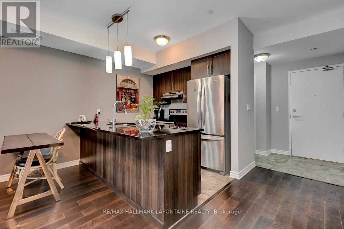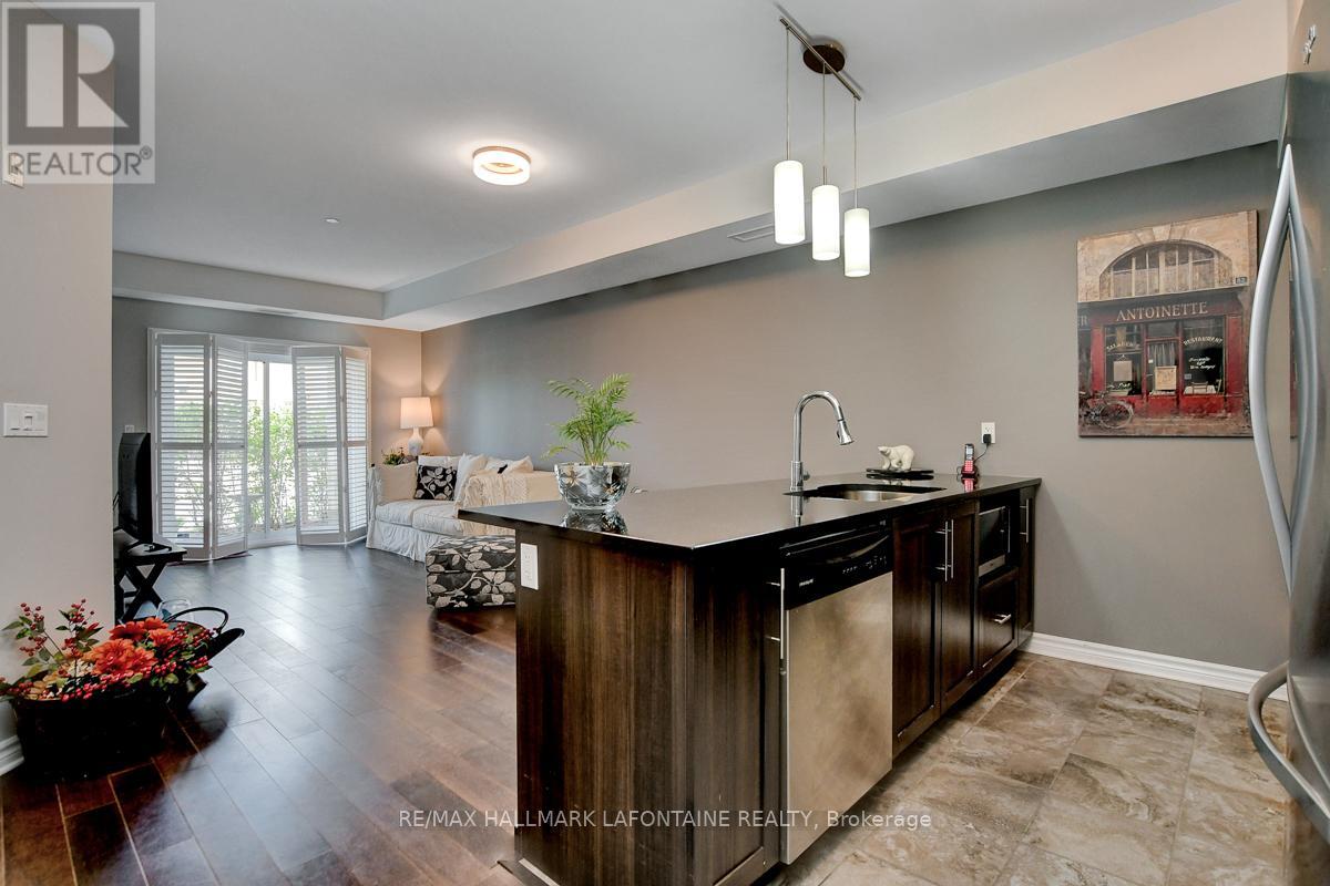 Welcome to Petrie's Landing! This spacious and thoughtfully designed 2-bedroom condo combines modern comfort with a fantastic location. Enjoy effortless access to transportation and the beautiful Ottawa River trails just steps from your door.The bright, open-concept living and dining area features engineered hardwood flooring, California shutters, and sliding doors that lead to your private terrace - perfect for morning coffee or evening relaxation. The kitchen boasts granite countertops, a breakfast bar, stainless steel appliances, and a stylish backsplash.The generous primary bedroom includes a luxurious ensuite with a soaker tub, separate shower, granite counters, and ceramic tile flooring. A second full bathroom with matching finishes conveniently connects to the in-unit laundry room.Nestled on the quiet side of the building, this condo is surrounded by greenery and even has a small park right out front. A wonderful blend of nature, style, and convenience - come see it for yourself! (id:44758)