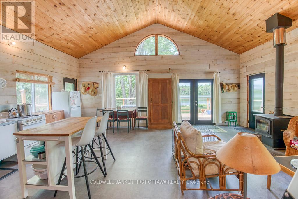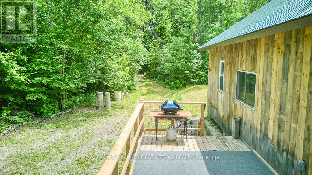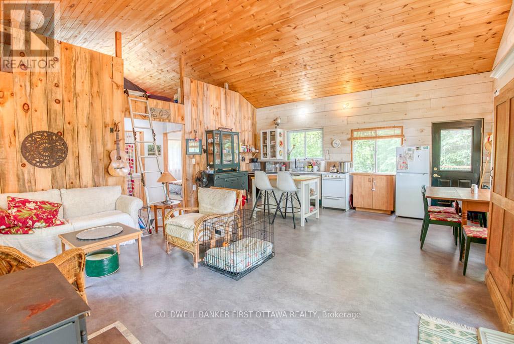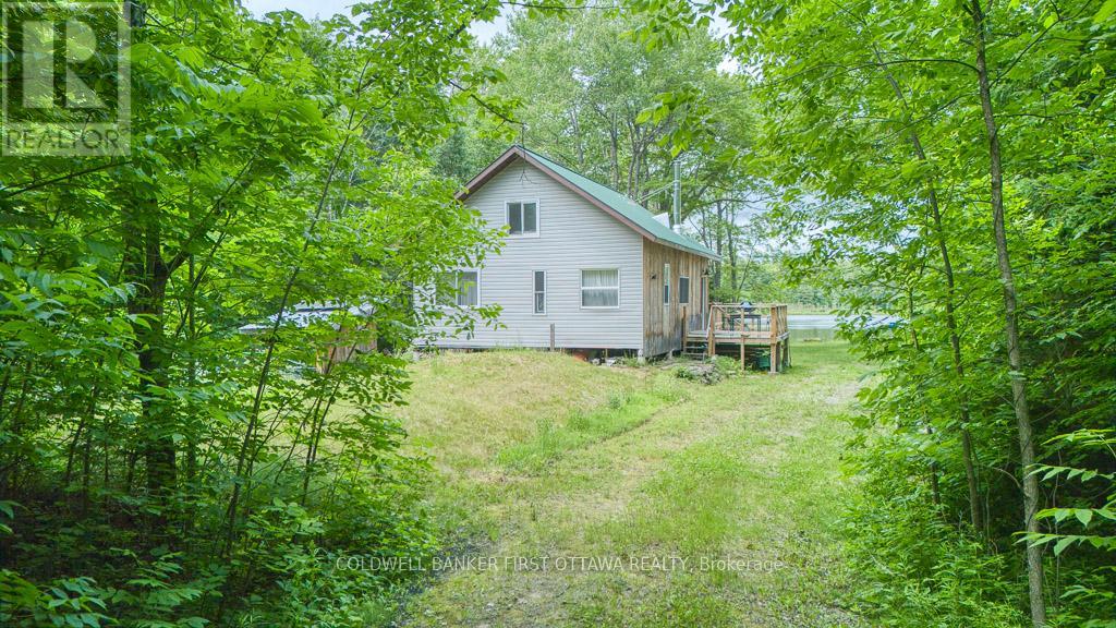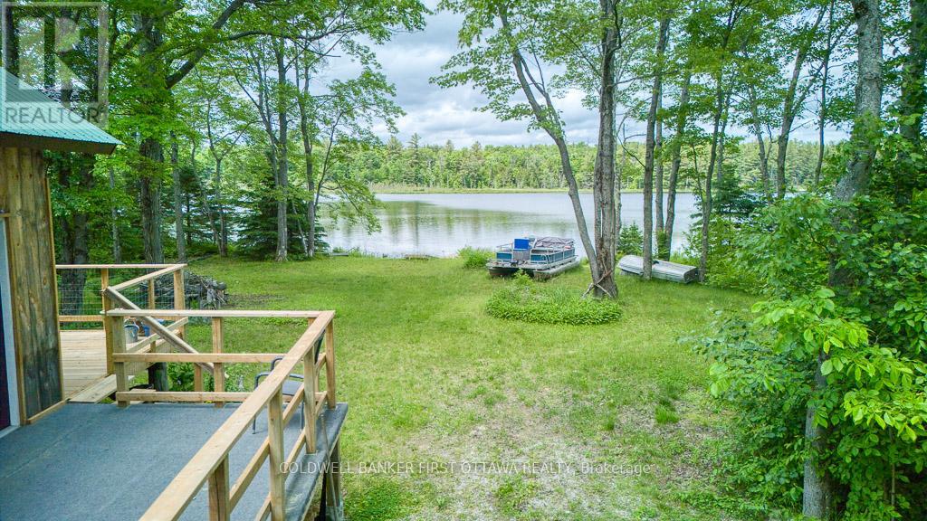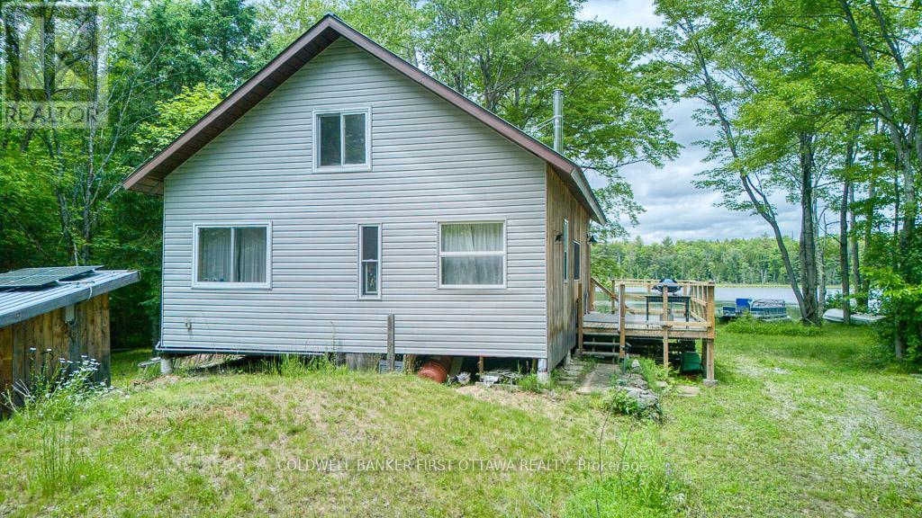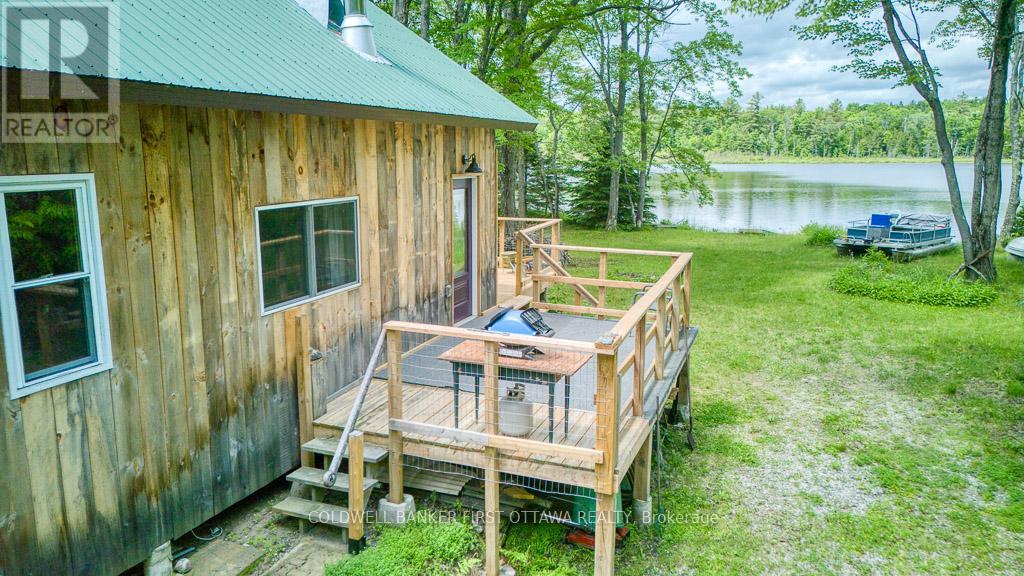 Welcome to 1305 Thunder Lane! Come discover this charming Off Grid, 2-Bedroom w/loft, 1 Bath cottage on Thompson Lake. Located approximately 1km off the main road, the lot offers 1.58 acres with dense trees on either side providing you with excellent privacy. The building constructed in 2004 has an open concept with a spacious kitchen, dining and living room for fun, family gatherings and plenty of sleeping space to accommodate your guest. The vaulted ceilings and insulated walls keep the cottage cool in the summer while offering a grand feeling inside. The cottage is powered with a 650-watt solar system with room to expand, lake intake and a septic system installed in 2019. The lot offers plenty of level space from the cottage to the waterfront which makes it ideal for family members of all ages and room for all your favourite outdoor activities. Sit out and enjoy the sun on the wrap around deck, enjoy a late-night bonfire or take advantage of being in a Dark Sky area to look up at the stars. The cottage comes with most furnishings....ready to enjoy the summer! Thompson Lake is excellent to enjoy fishing, leisure boat rides (electric motors recommended on the lake) or just a nice peaceful paddle in your canoe. The lake is home to only a handful of residence making it a real paradise to be able to sit back, listen to the Loons and take in the sounds and beauty that surrounds you. The town of Arden or Sharbot Lake are only a short drive away for all your essential amenities. (id:44758)