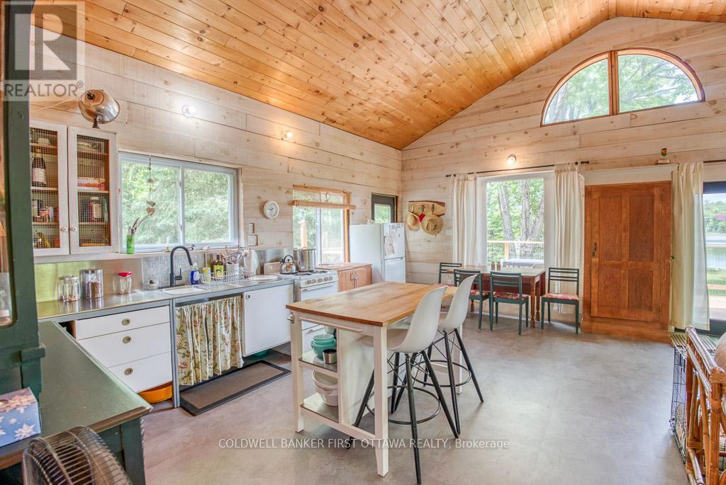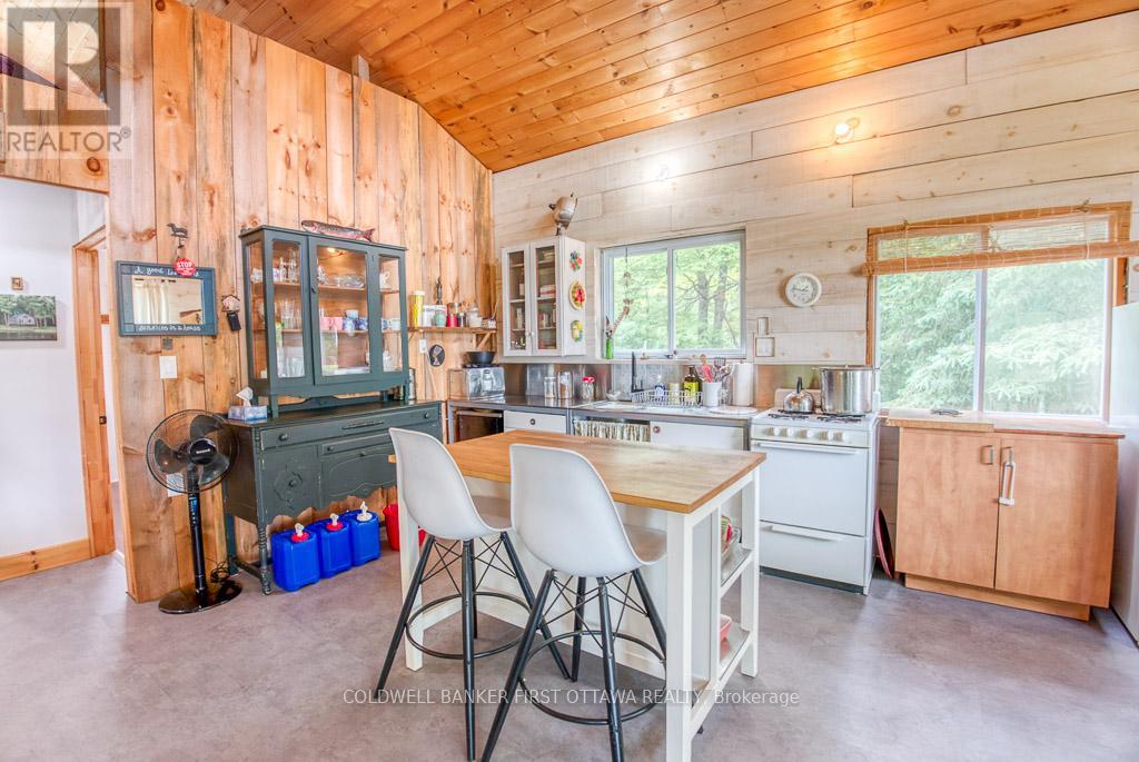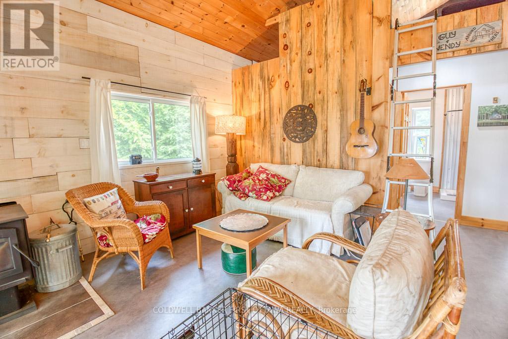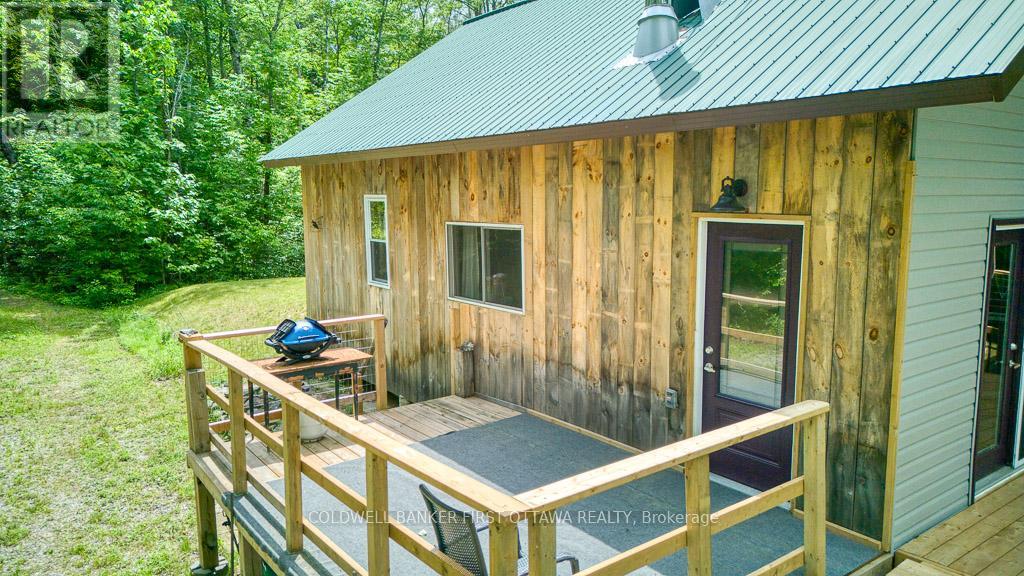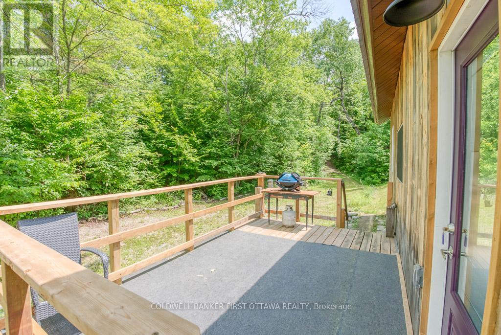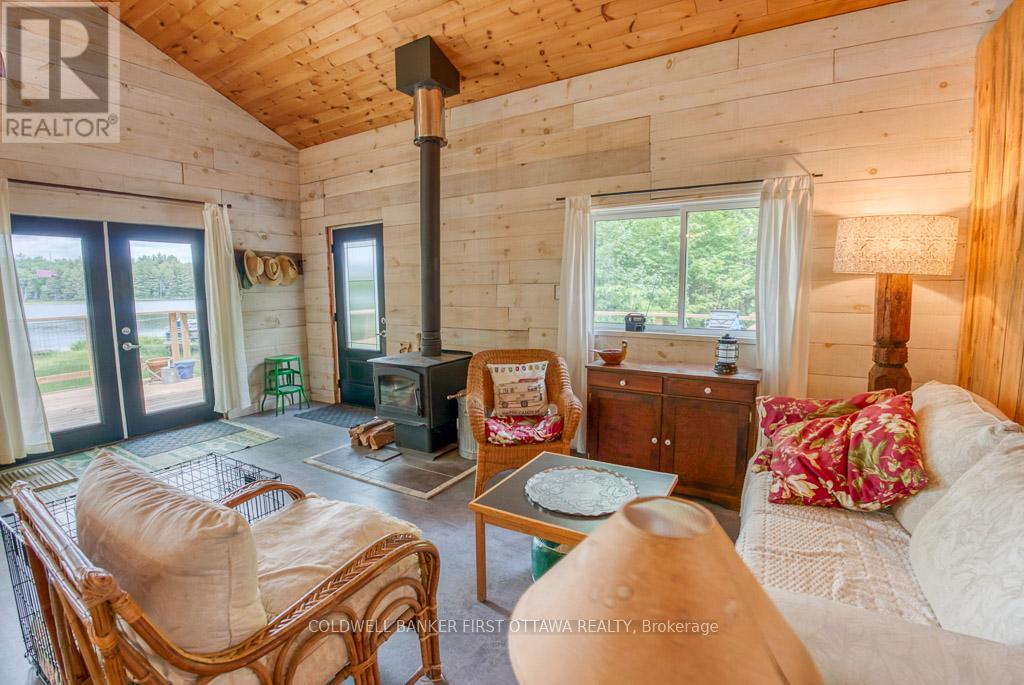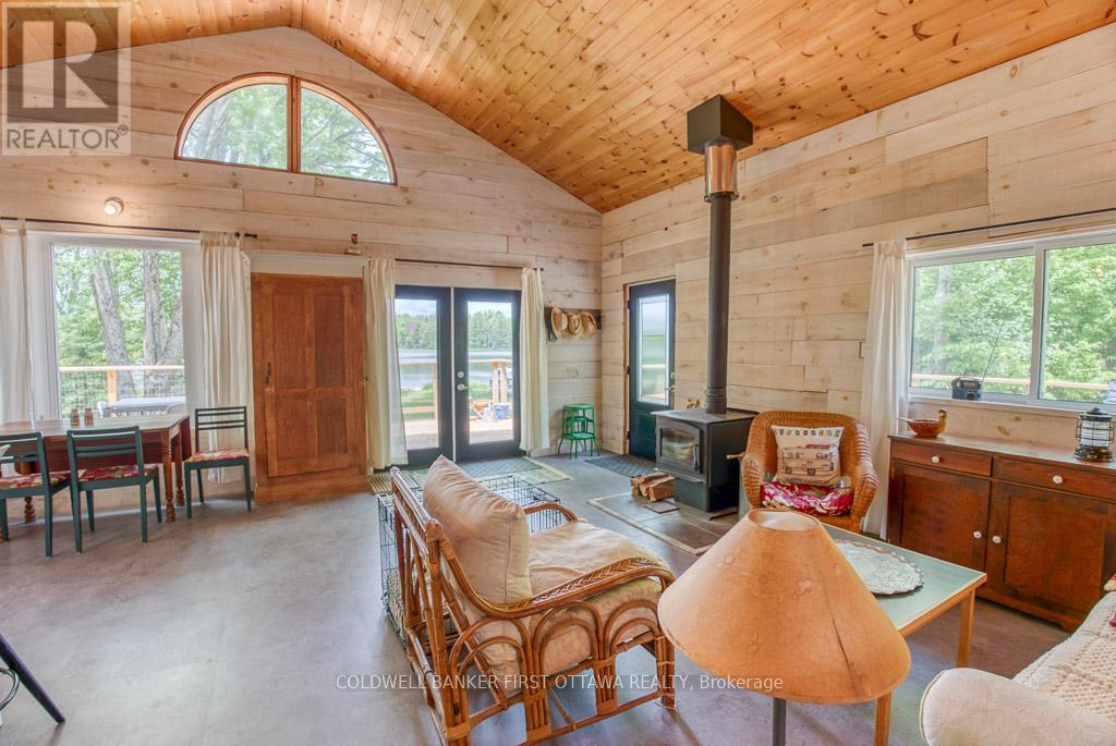 Welcome to 1305 Thunder Lane! Come discover this charming Off Grid, 2-Bedroom w/loft, 1 Bath cottage on Thompson Lake. Located approximately 1km off the main road, the lot offers 1.58 acres with dense trees on either side providing you with excellent privacy. The building constructed in 2004 has an open concept with a spacious kitchen, dining and living room for fun, family gatherings and plenty of sleeping space to accommodate your guest. The vaulted ceilings and insulated walls keep the cottage cool in the summer while offering a grand feeling inside. The cottage is powered with a 650-watt solar system with room to expand, lake intake and a septic system installed in 2019. The lot offers plenty of level space from the cottage to the waterfront which makes it ideal for family members of all ages and room for all your favourite outdoor activities. Sit out and enjoy the sun on the wrap around deck, enjoy a late-night bonfire or take advantage of being in a Dark Sky area to look up at the stars. The cottage comes with most furnishings....ready to enjoy the summer! Thompson Lake is excellent to enjoy fishing, leisure boat rides (electric motors recommended on the lake) or just a nice peaceful paddle in your canoe. The lake is home to only a handful of residence making it a real paradise to be able to sit back, listen to the Loons and take in the sounds and beauty that surrounds you. The town of Arden or Sharbot Lake are only a short drive away for all your essential amenities. (id:44758)