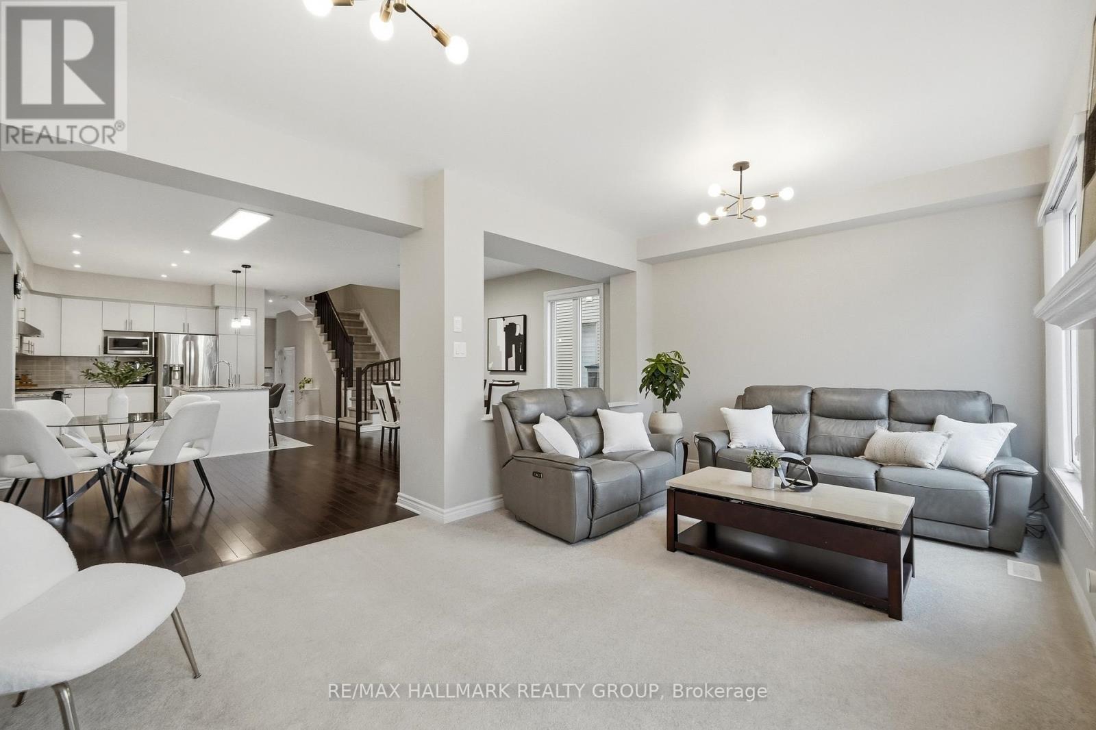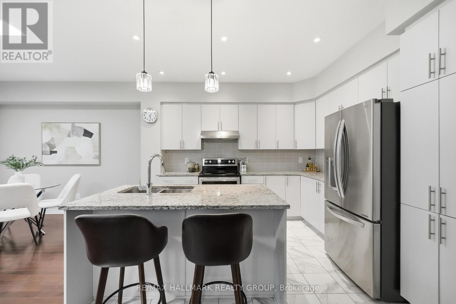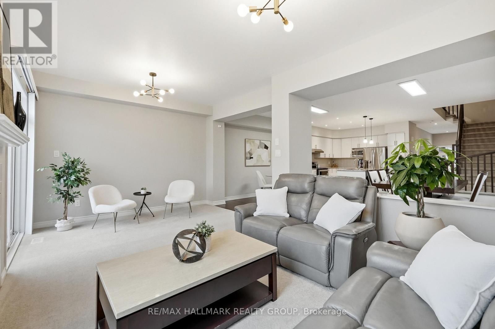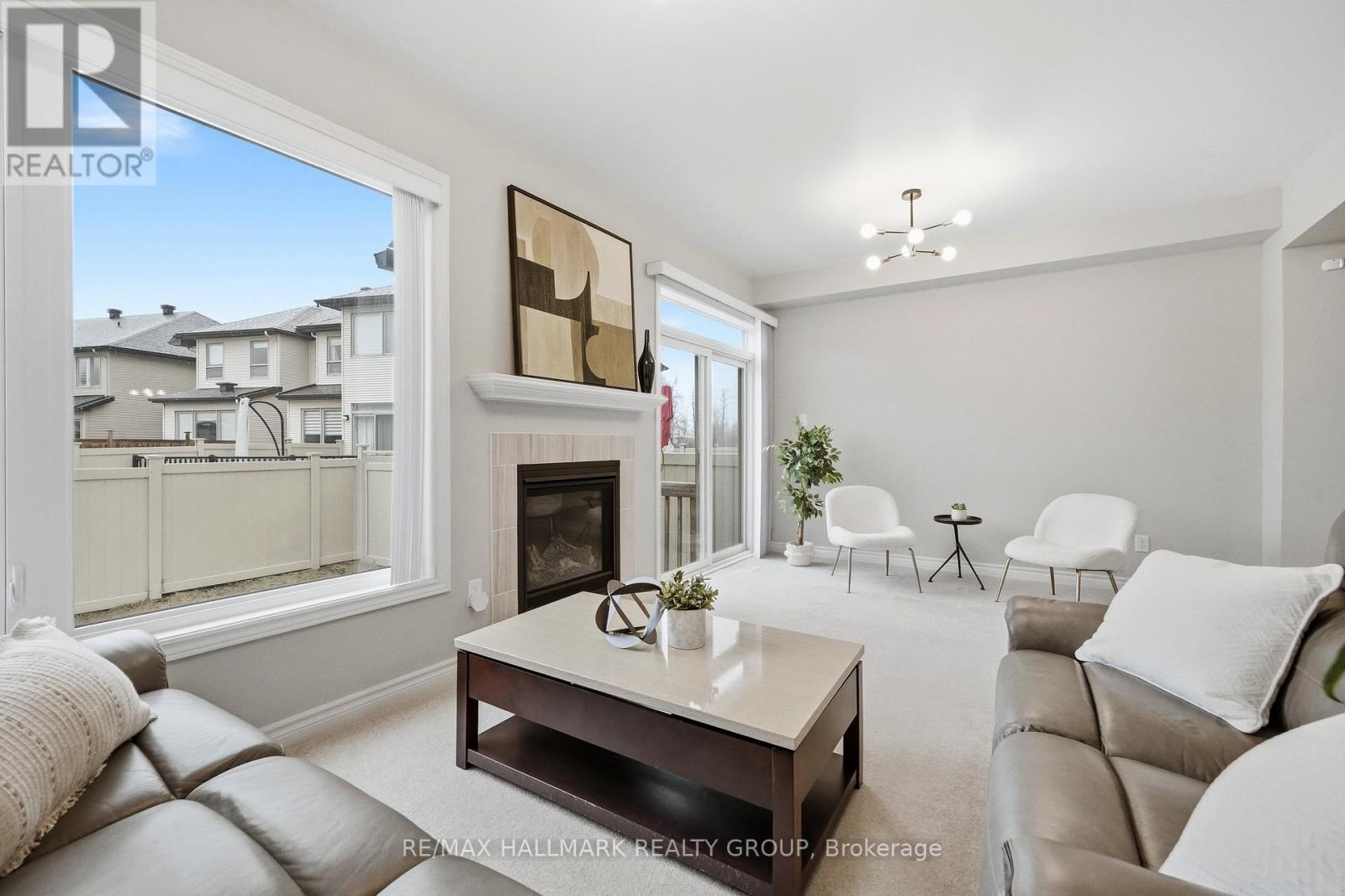 Welcome to 137 Wild Calla Way, a beautifully upgraded Richcraft Fairhaven End Unit townhome located in the desirable Bradley Estates community in Orleans. Offering a rare 4 bedroom layout with the builder loft professionally converted to a fourth bedroom and 3 bathrooms, this home provides both space and functionality for modern living. The main level features a bright open concept design with hardwood flooring throughout the main hallway and dining areas. The inviting living room is finished with cozy carpeting, a gas fireplace, and access to the backyard. The modern white kitchen overlooks the living space and includes stainless steel appliances, double oven, ice-maker fridge, centre island with double sink and breakfast bar, and plenty of cabinetry for storage. Upstairs you will find four spacious carpeted bedrooms including the primary suite, along with the convenience of second-floor laundry. All three bathrooms feature granite countertops, with upgraded power showers in the primary ensuite and second bathroom, and the main bath includes tile extended to the ceiling. Additional upgrades include oak stairs, modern light fixtures in the living room, kitchen island, dining room and primary bedroom, flow-through humidifier, central air conditioning, updated kitchen faucet, and plumbing improvements including new sink stoppers in all bathrooms and the powder room. The home has also been freshly painted throughout with updated baseboards. The finished lower level recreation room provides additional living space, while a large unfinished storage/utility area offers excellent storage potential. Outside, enjoy extended driveway parking with interlock for two vehicles, a single garage with inside entry featuring built-in tire rack and custom storage, plus a convenient side storage shed. Located close to parks, schools, transit, and everyday amenities, this move-in ready end unit offers comfort, upgrades, and an excellent family-friendly location! (id:44758)