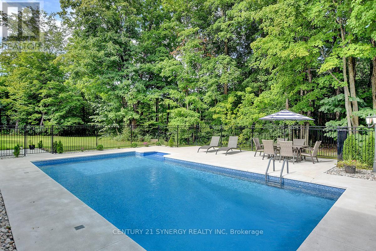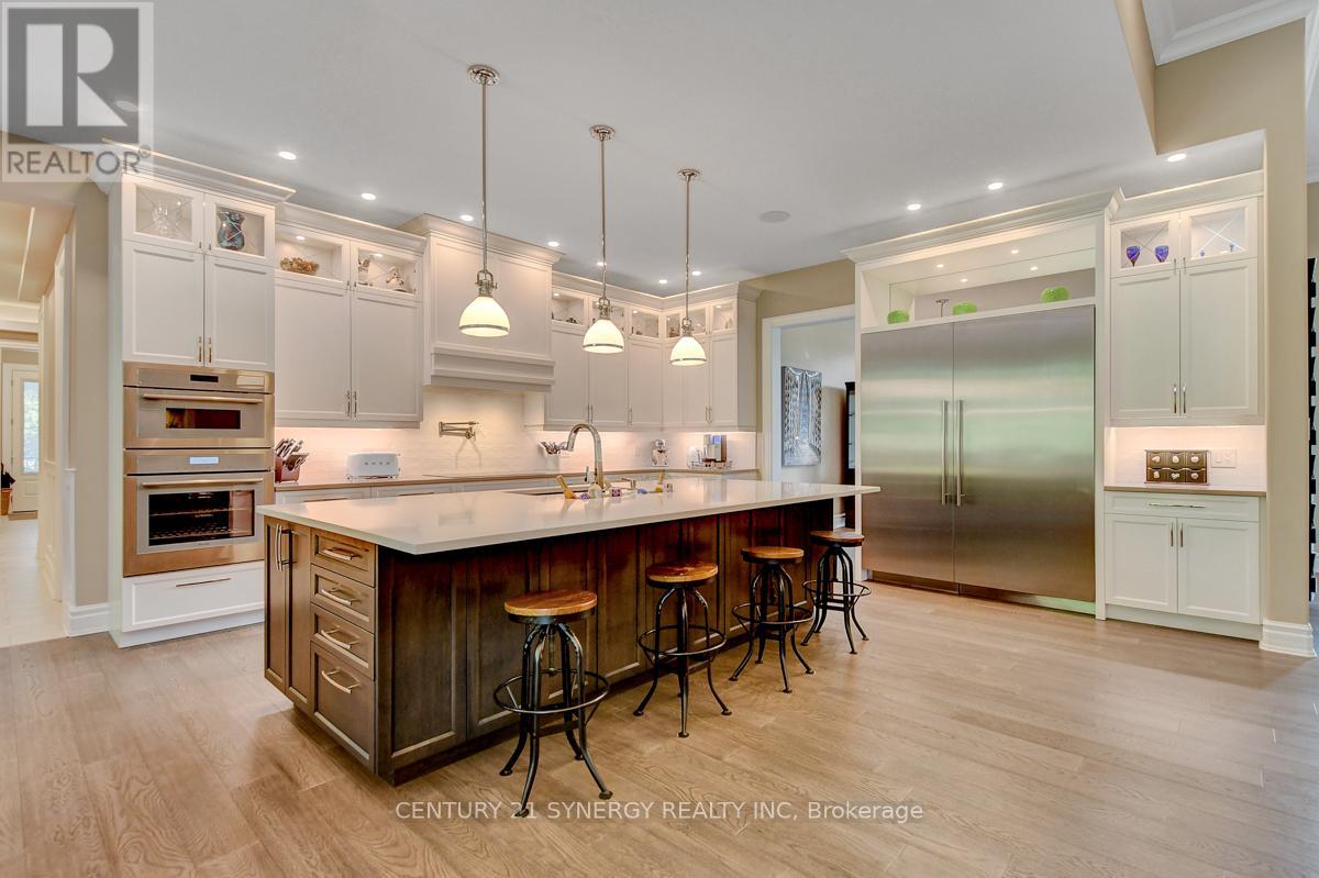 Experience refined living in this exquisite custom-built bungalow, showcasing exceptional craftsmanship, thoughtful design, and high-end finishes throughout. Located in the prestigious Rideau Forest community, this home offers the rare opportunity to own a newer home in one of Ottawa's most sought-after neighbourhoods. The open-concept layout welcomes you with a grand foyer, elegant dining room with built-in wine display, and a stunning living room featuring soaring 12-ft ceilings, intricate lighting details, a sleek fireplace, and an abundance of natural light. The gourmet kitchen is a true showpiece, complete with Thermador appliances, pot filler, large island with beverage sink, and a bright eating area that opens to a three-season screened-in porch with a gas fireplace - perfect for relaxed summer evenings. The luxurious primary suite offers a spacious walk-in closet and a spa-inspired 6-piece ensuite with heated floors. Two additional bedrooms each feature their own private ensuite, ensuring comfort for family and guests. A main floor office, powder room, laundry, and well-appointed mudroom complete the level. The fully finished lower-level impresses with a generous rec room, gas fireplace, full bar, gym, golf simulator, and guest bedroom with 3-piece bath. Direct access from the basement to the heated oversized 4-car garage adds convenience. Set on a beautifully landscaped, private, tree-lined lot, the backyard features a heated saltwater pool, irrigation system, and a separate heated oversized 2-car garage. A perfect blend of luxury, functionality, and tranquility - this home that truly has it all! (id:44758)