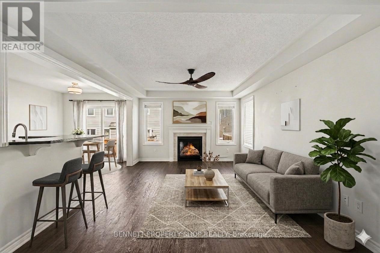 Say Goodbye to busy streets! Feel safe with your kids playing outside in this premium 3-bedroom, 2.5-bath end-unit townhome sitting on a quiet court with NO FRONT-FACING NEIGHBOURS. Enjoy vibrant sunsets right from your windows, offering a daily retreat from the hustle of city life. This carpet-free home features hardwood on both the main and upper level. With approximately 2,250 sq ft of bright, functional living space, the main level features a gas fireplace in the living area, an eat-in kitchen with a large island perfect for casual seating and entertaining, and a spacious dining room ideal for family gatherings. Upstairs, find a convenient, separate laundry room and comfortable bedrooms, while the finished basement includes an additional fireplace for cozy evenings. Step outside to a beautifully landscaped backyard; perfect for relaxation, play, or summer barbecues. With parking for 4 in the extra wide driveway, its proximity to Top-rated schools, neighbourhood grocery stores, parks, and community amenities makes this an ideal spot to start or raise a family. Commuting is seamless with quick access to major highways and the Hunt Club corridor. Kanata's core is under 10 minutes, and downtown Ottawa is a quick 15-20 minute drive. This exceptional townhome perfectly balances tranquility, space, and connectivity for those seeking the best of suburban and urban living. Don't miss this opportunity! Some photos are digitally enhanced. (id:44758)