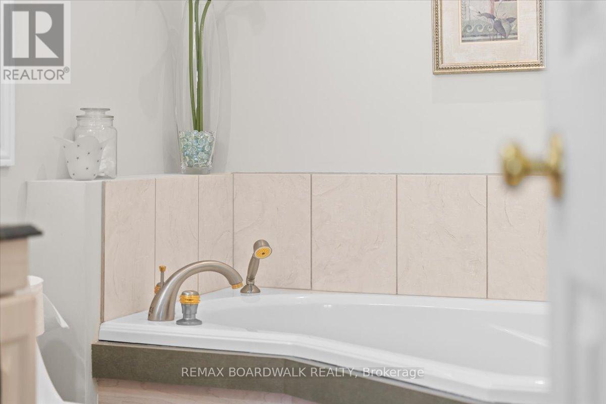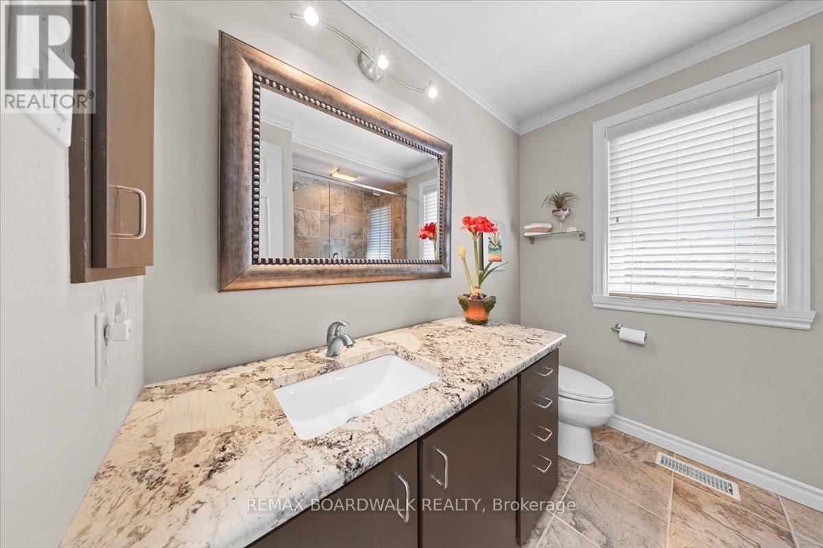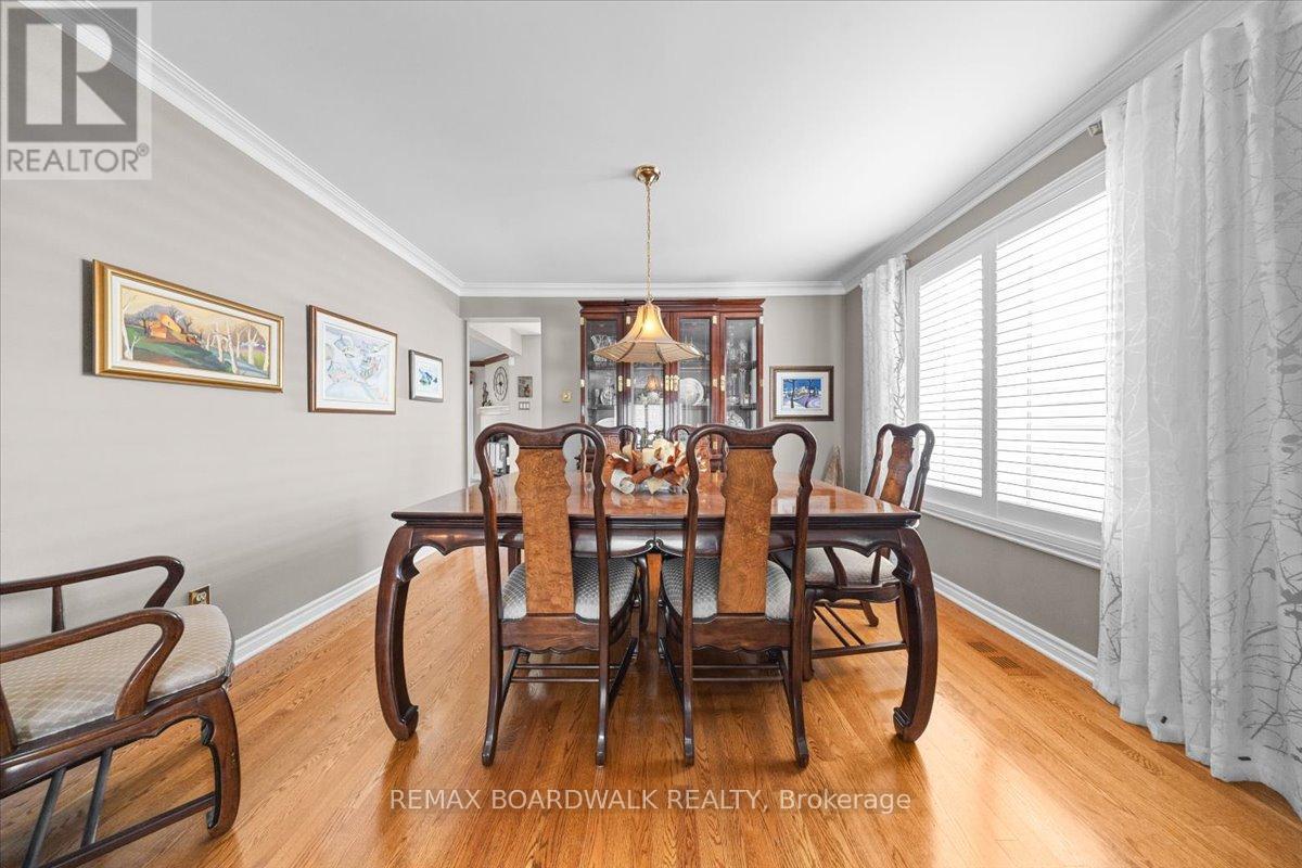 On a quiet street in Chapel Hill North, this 4-bedroom home offers a blend of traditional architecture & updates. The exterior presents w/an interlock driveway, garage door w/window inserts, shutters, & a front door w/full glass inlay & sidelights. The interior foyer w/ceramic tile flooring to site-finished hardwood, a Victorian-style staircase w/multi-tone wood finish & chair rail detailing. The living rm w/crown moulding, flat ceilings, & a window inlay w/California shutters. The dining rm is positioned w/a side window & pass-through access. The kitchen is central, featuring a centre island w/breakfast bar, granite countertops, a vegetable sink, bay window, 12" deep pantry, glass accents, backlighting, mouldings, ceramic tile backsplash, recessed sink beneath a greenhouse-style window, multiple drawer storage, integrated wine rack, & refrigerator w/ice & water service. The main floor family rm is anchored by a corner wood-burning fireplace & provides direct access to the rear yard through a 3 panel patio door. A back hall includes a two-piece powder rm, as well as a laundry area w/overhead cabinetry & secondary closet, plus side entrance access. The 2nd level features hardwood flooring on the landing, illuminated by a skylight & a linen closet. The primary bedroom includes a bay window, California shutters, crown moulding, high baseboards, & a walk-in closet. The 3-piece ensuite offers a moulded 2-person soaker tub w/European-style fixtures & granite-topped vanity. 3 additional bedrooms each provide full closet walls. The main bathroom has been updated w/a walk-in glass shower, tile finishes, & a granite vanity w/wave sink. A Hollywood staircase leads to the lower level, w/a recreation room w/horizontal window, walk-in pantry, workshop & a storage area complete w/soaker sink & built-in shelving. Fenced yard a two-tier deck, metal gazebo, storage shed, & mature trees. The garage provides inside entry for added convenience. 24 hour irrev on all offers. (id:44758)