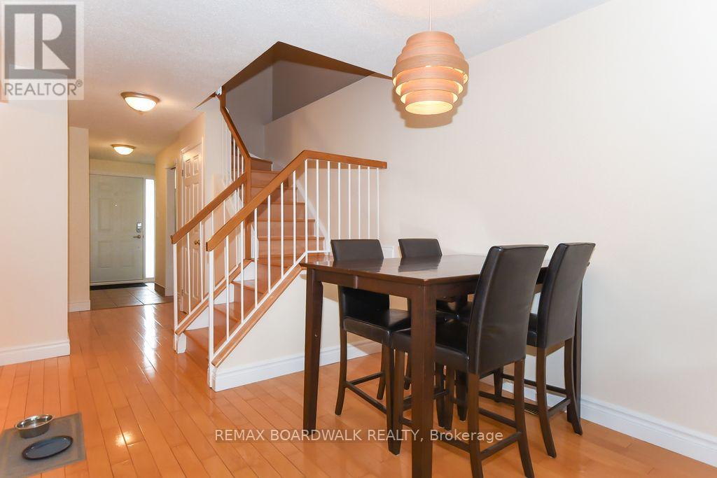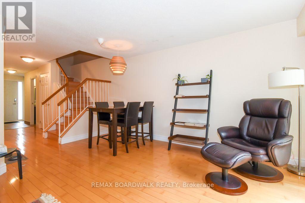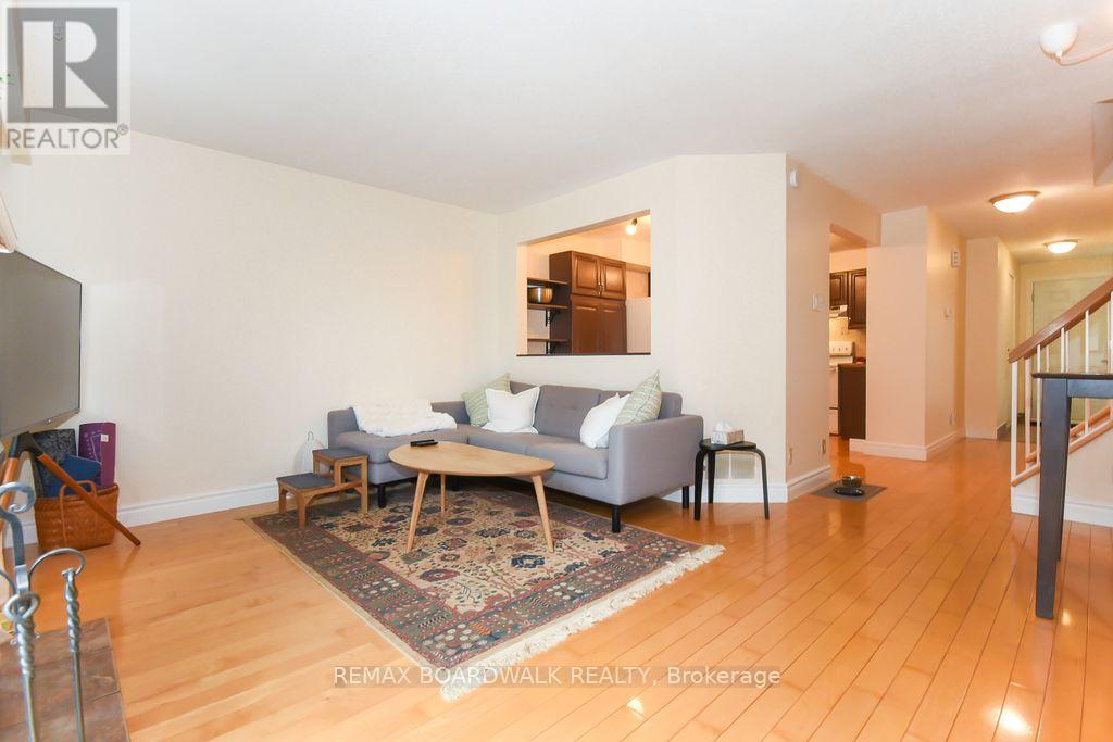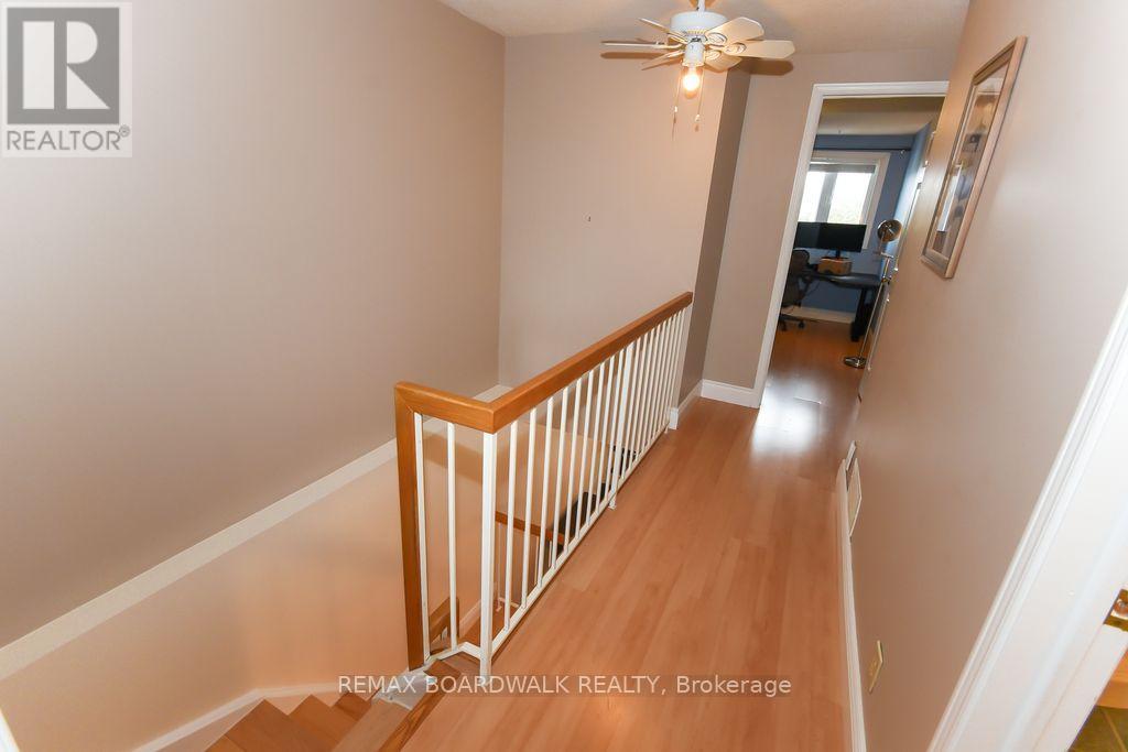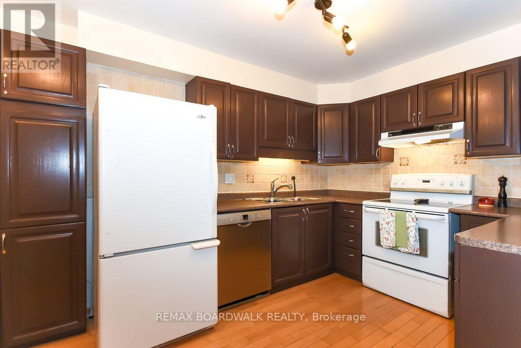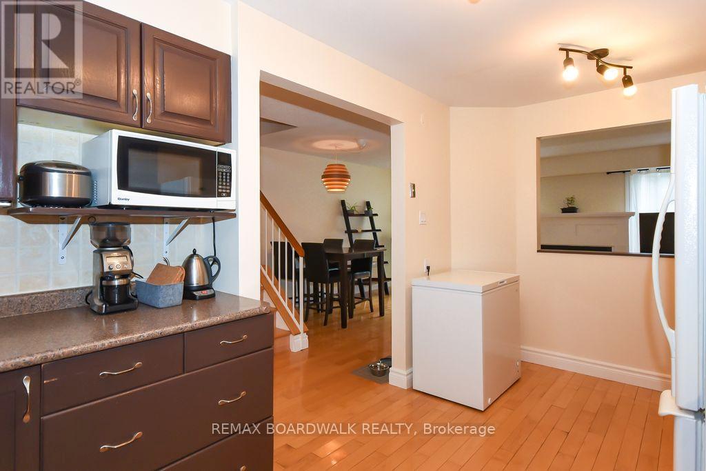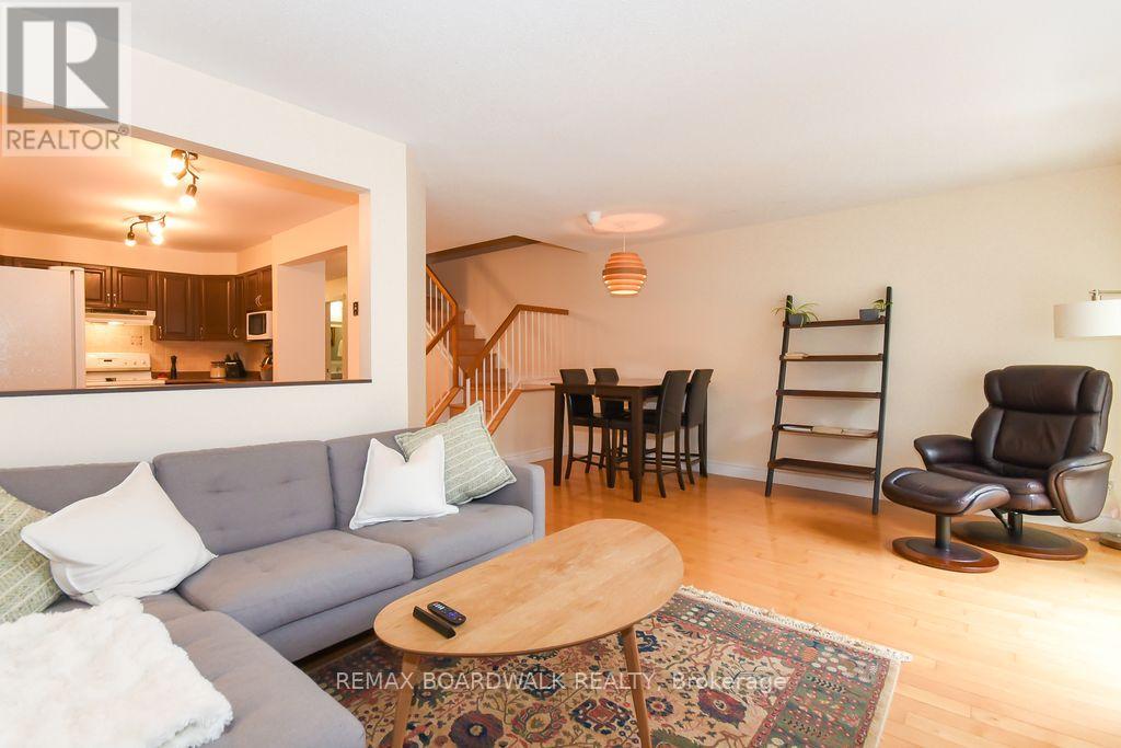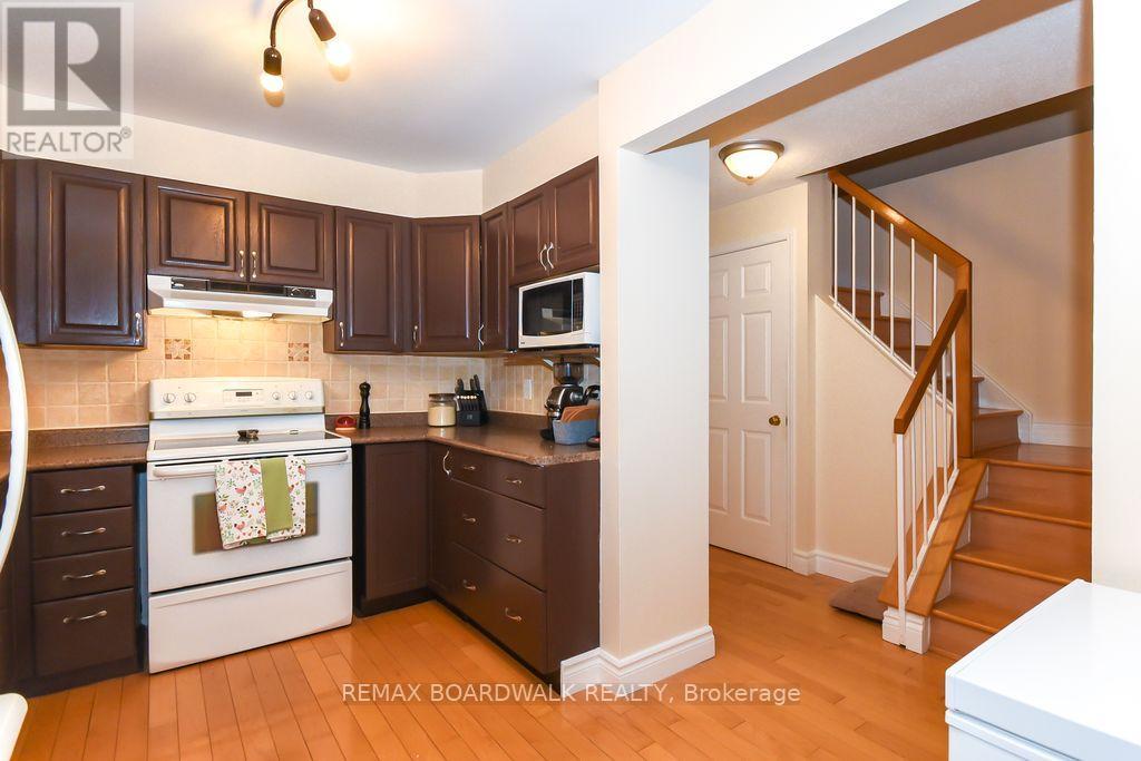 Location location! A walk to grocery shopping, bus service, library, restaurants, school, parks and much more. End unit with garage + 2 parking spaces at the door. Fenced back yard. Visitors parking. 5 appliances included. All rooms are generous in size. Wood burning fireplace. Beautiful 4 piece bathroom on the second level with soaking tub and separate shower. Lots of closet space. Finished rec room in lower level. Beautiful hardwood on main floor and stairs leading to second level. Laminate flooring on second level. As per form 244: 24 hours irrevocable on all submitted offers (no exceptions). Furnace and central air replaced in 2024. Please note that garage door is being replaced by Condo corporation this year. Main floor has just been professionally repainted in neutral tones. Just move into this beautiful place to call "home"! (id:44758)