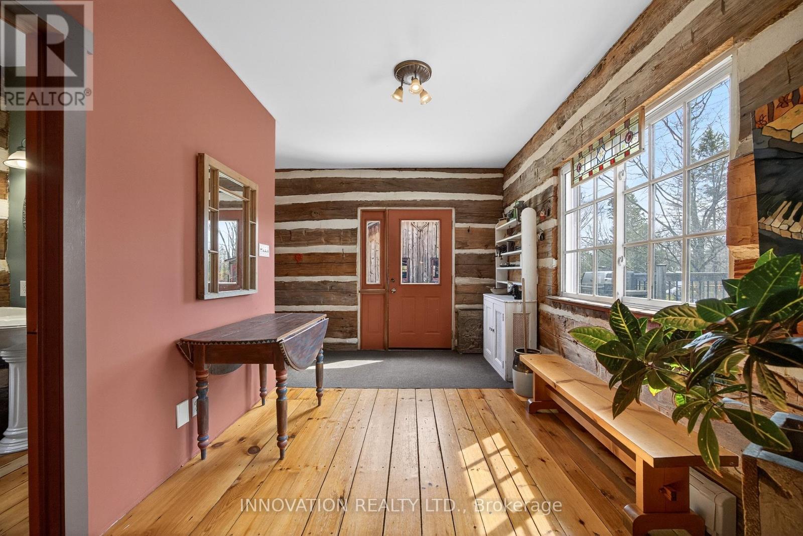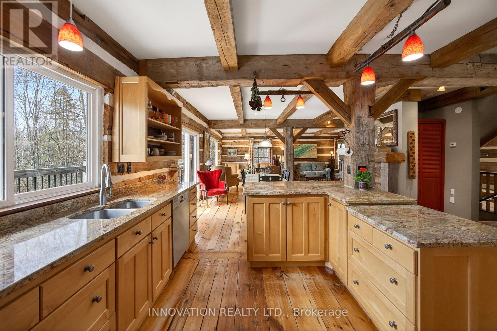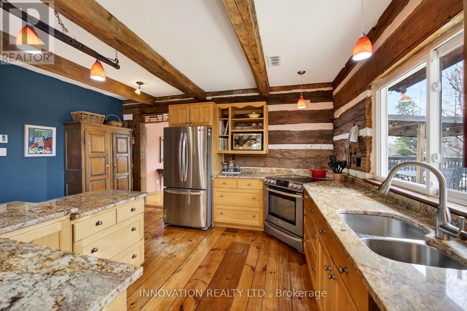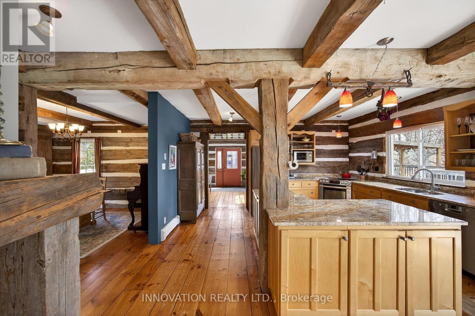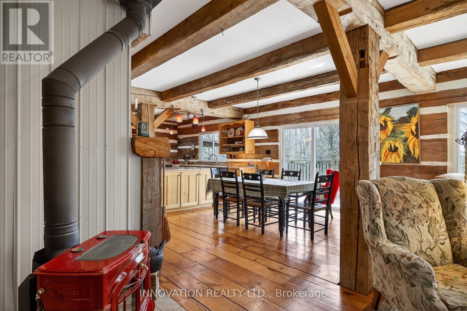 In a word-exceptional. Opportunities like this rarely come along. Nestled on 33.9 acres of mature forest and open fields near the charming Town of Almonte, just west of Ottawa, this beautiful 5-bedroom, 4-bathroom log home offers over 2,600 square feet of beautifully finished living space and a lifestyle that seamlessly blends comfort, craftsmanship, and nature. Built in 1998 using reclaimed hewn logs dating back to the 1850s, the home showcases timeless character with 12"x12" ash timber post-and-beam construction, wide plank flooring, and reclaimed pine barn board accents throughout.Thoughtfully designed for modern living, the spacious floor plan features a bright, open-concept layout with a well-appointed kitchen. Expansive south-facing windows flood the home with natural light overlooking the expansive deck, screened in porch while offering breathtaking views of the surrounding forest and wildlife.The fully finished walk-out basement provides excellent potential for an in-law suite, guest retreat, or teen getaway. Zoned heating and cooling systems ensure year-round comfort and energy efficiency, complemented by impressive insulation values.Outdoors, the property is nothing short of extraordinary. Explore over 3 km of private trails ideal for hiking, horseback riding, or cross-country skiing. Enjoy peaceful mornings watching deer and birds from your backyard, relax by the swimming pool, or make use of the charming timber frame barn & fenced sand riding ring. Perfectly positioned for both privacy and convenience, this remarkable estate is just a short drive to Kanata, Almonte, and Pakenham, with easy access to local recreation including nearby whitewater in Blakeney, multi-purpose trail and Burnt Lands Provincial Park. This is more than a home, it's a retreat, a lifestyle, and a rare opportunity to live with modern comfort in harmony with nature. (id:44758)