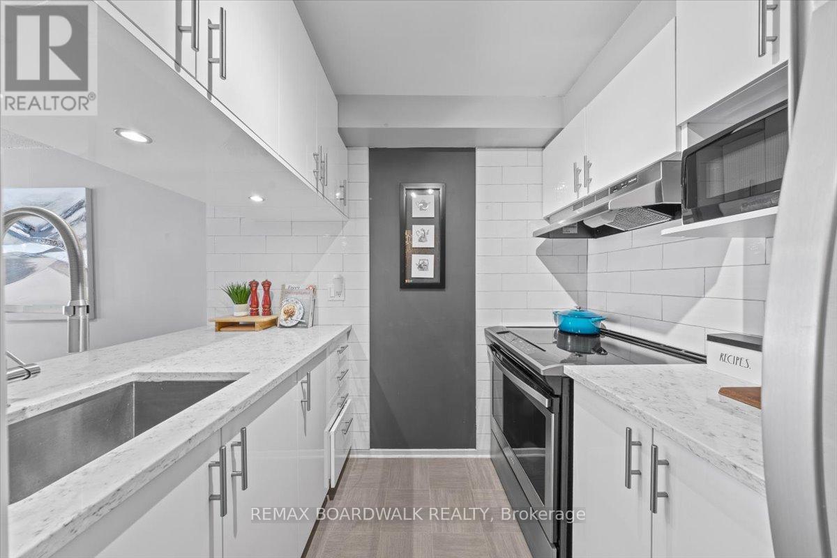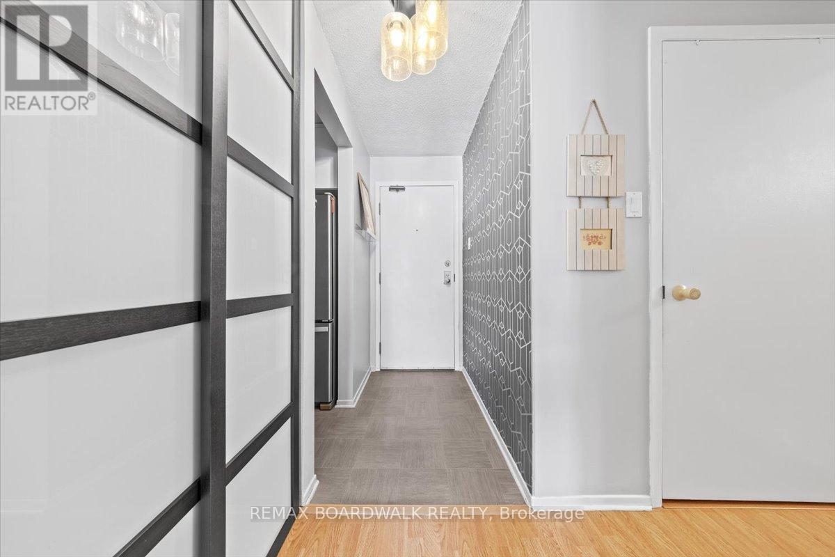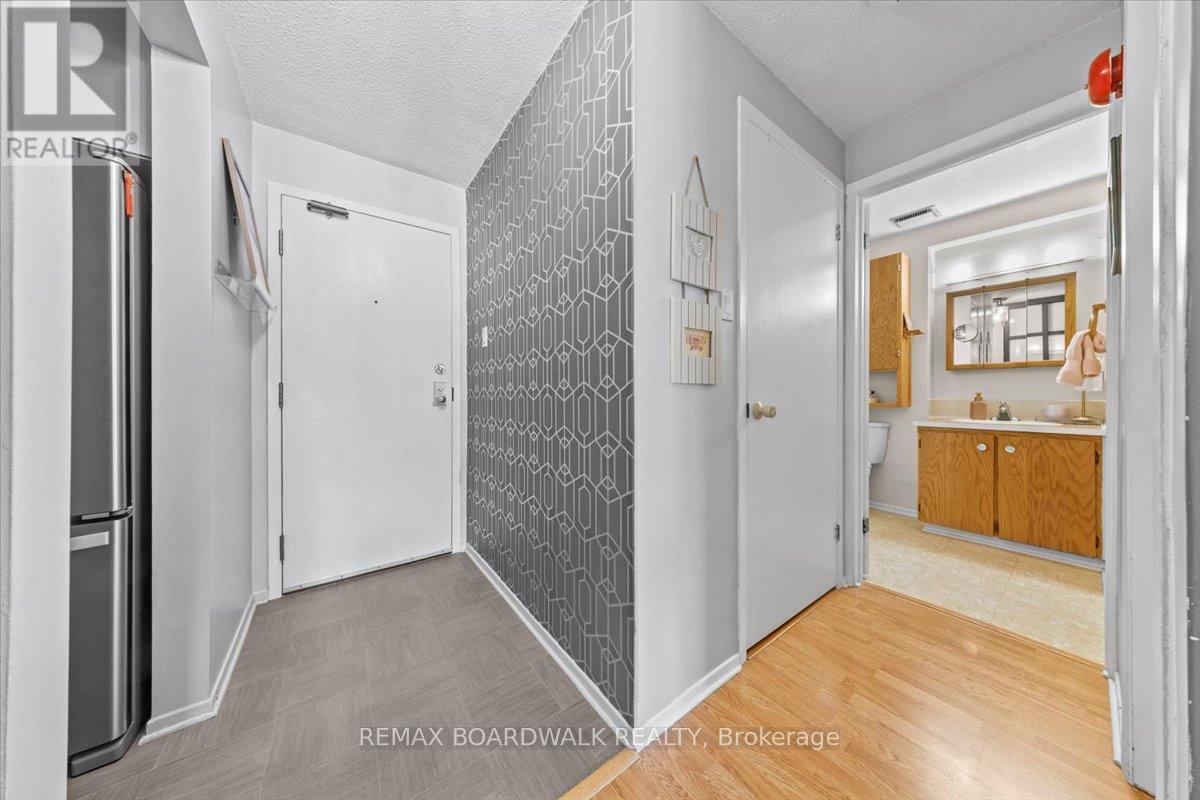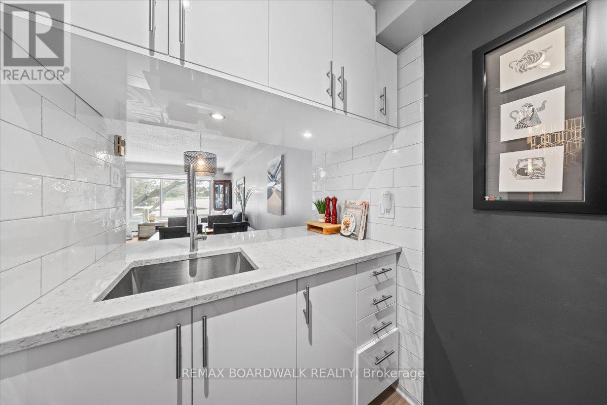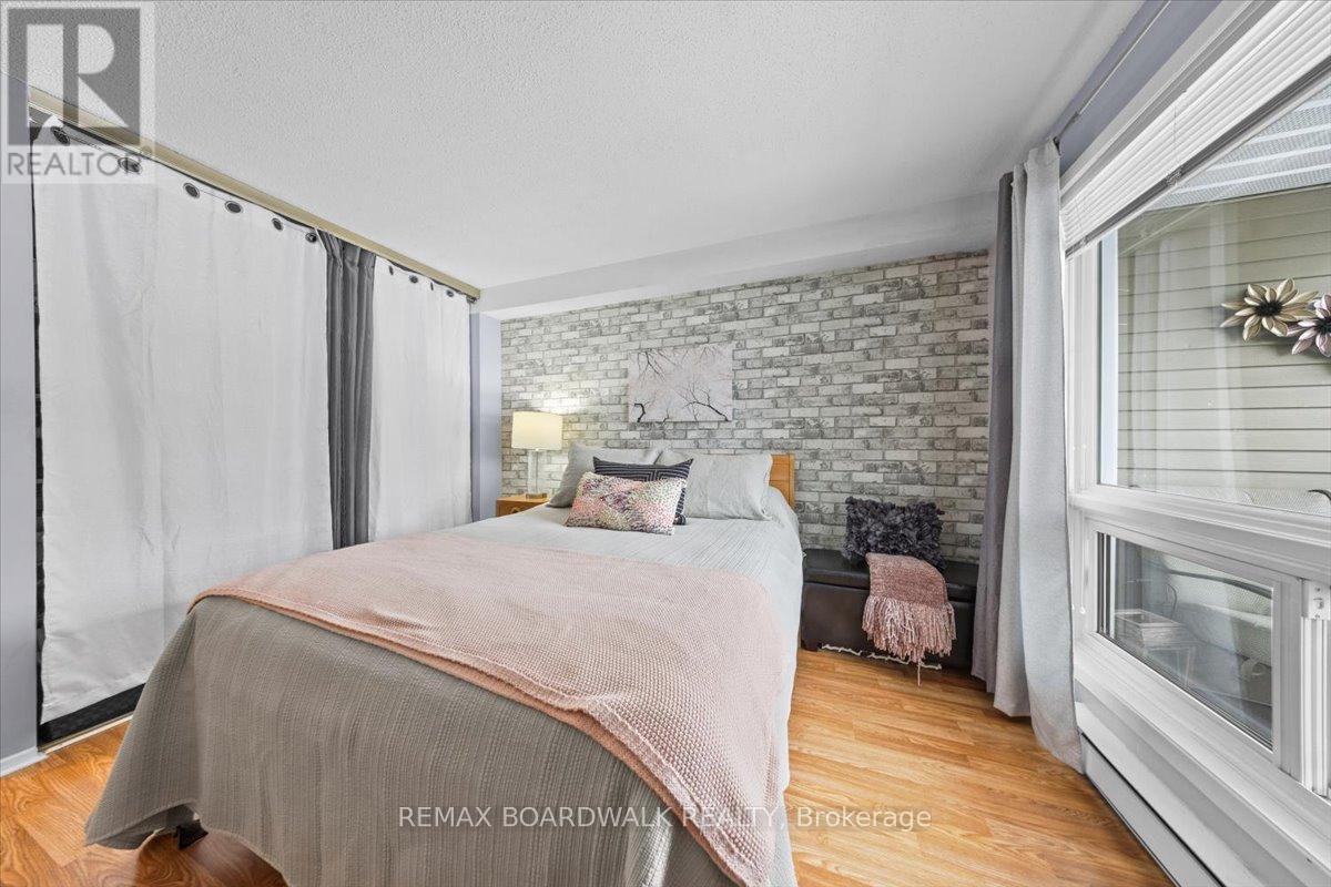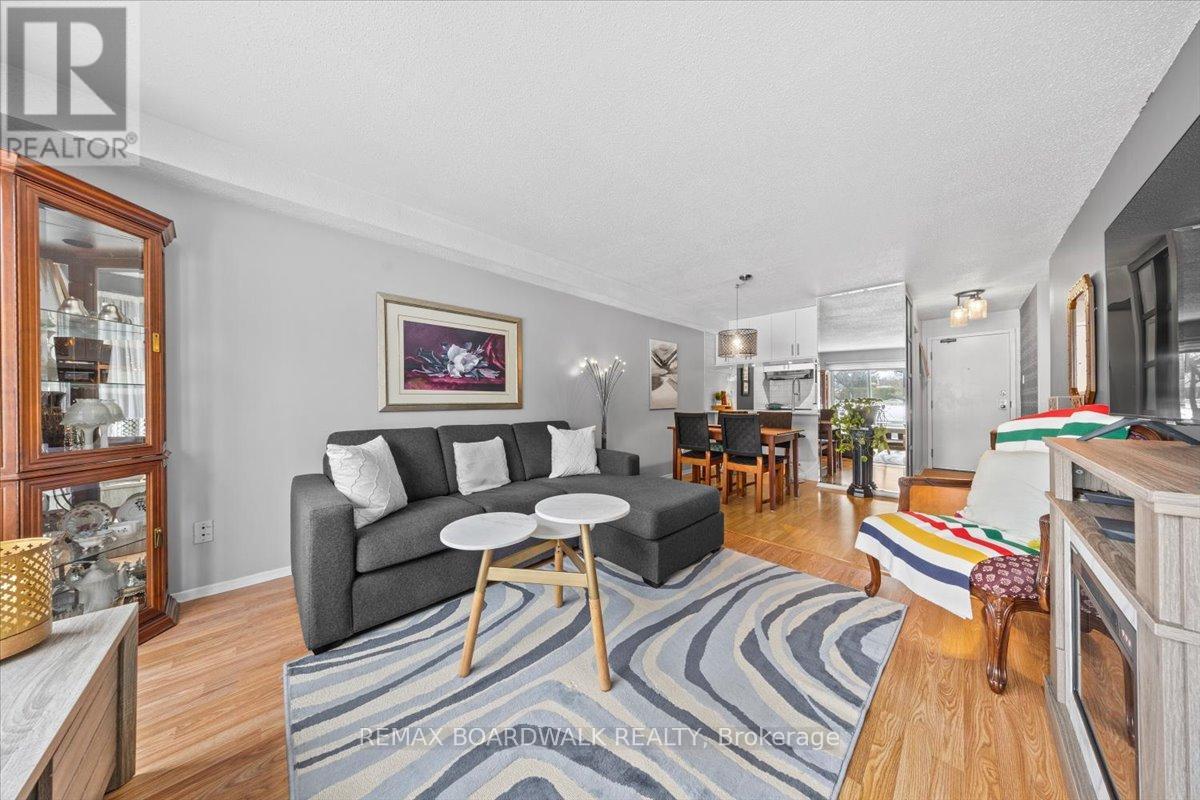 Set along the peaceful surroundings of Bilberry Creek & moments from the Ottawa River pathways, this beautifully updated one bedroom condominium offers a rare blend of nature, comfort & everyday convenience. A secure front entrance welcomes you into a bright foyer w/five panel door closet. The European inspired kitchen, features quartz countertops, horizontal subway tile backsplash, stainless steel refrigerator & an open breakfast bar w/recessed sink & accent pot lighting. The open living & dining area is filled w/natural light from an oversized picture window overlooking tranquil green space. Wide plank flooring & a mirrored accent wall add brightness, while the patio door leads to a screened & covered balcony where you can enjoy morning coffee surrounded by trees and peaceful views. The primary bedroom offers a double wide closet, distinctive faux brick accent wall, & calming views toward the balcony and greenery beyond. A four piece bathroom w/ceramic tile tub surround & medicine cabinet completes the space. Additional features include underground parking, shared laundry, in unit walk in storage, & a location within walking distance to bike trails, transit & everyday amenities.A home where nature, convenience & quiet living come together in one welcoming place to call home. 24 Hour irrevocable on all offers. (id:44758)