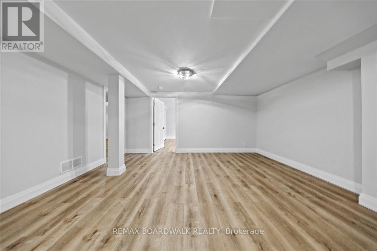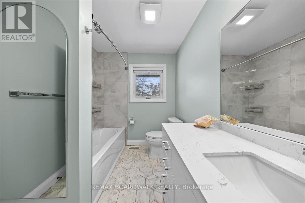 Graceful brick bungalow positioned on a wide lot w/warm southern exposure. A double wide driveway & covered front entrance lead to a welcoming foyer finished w/oversized tile & a front hall closet. The main level presents a refined architectural palette w/site finished hardwood flooring, high profile baseboards, flat ceilings & classic two panel interior doors that create a clean & timeless interior. The living room is bright & composed, framed by oversized windows, plaster crown moulding & subtle pot lighting that enhances the natural light. The dining room offers an elegant transition to the outdoors w/a chandelier, pantry storage & a patio door that opens to the rear deck & garden. The kitchen has been thoughtfully updated w/quartz countertops, recessed sink, two tone shaker cabinetry w/glass door accents, pot drawers & an oversized subway tile backsplash. Multiple windows introduce soft daylight, creating a space that is both functional & visually balanced. Two well proportioned bedrooms complete the main level. The primary bedroom enjoys southern exposure & features a double wide closet. The main bathroom presents quartz countertops, a multi drawer vanity, octagon tile flooring & a moulded tub with tiled surround. A side entrance leads to the rear hallway w/direct access to the lower level & a convenient parcel delivery cabinet. The finished lower level expands the living environment w/a spacious recreation room finished in wide plank flooring & centred around a gas fireplace. Additional spaces include a third bedroom, a den or office w/closet storage & a three piece bathroom w/stand up shower & laundry. The utility room offers generous storage, a soaker sink & two walk in closets. The garage provides inside access & natural light. The private rear yard enjoys southern exposure & is framed by mature trees, w/a deck & hot tub creating a quiet outdoor retreat. 24 Hour irrevocable on all offers. (id:44758)