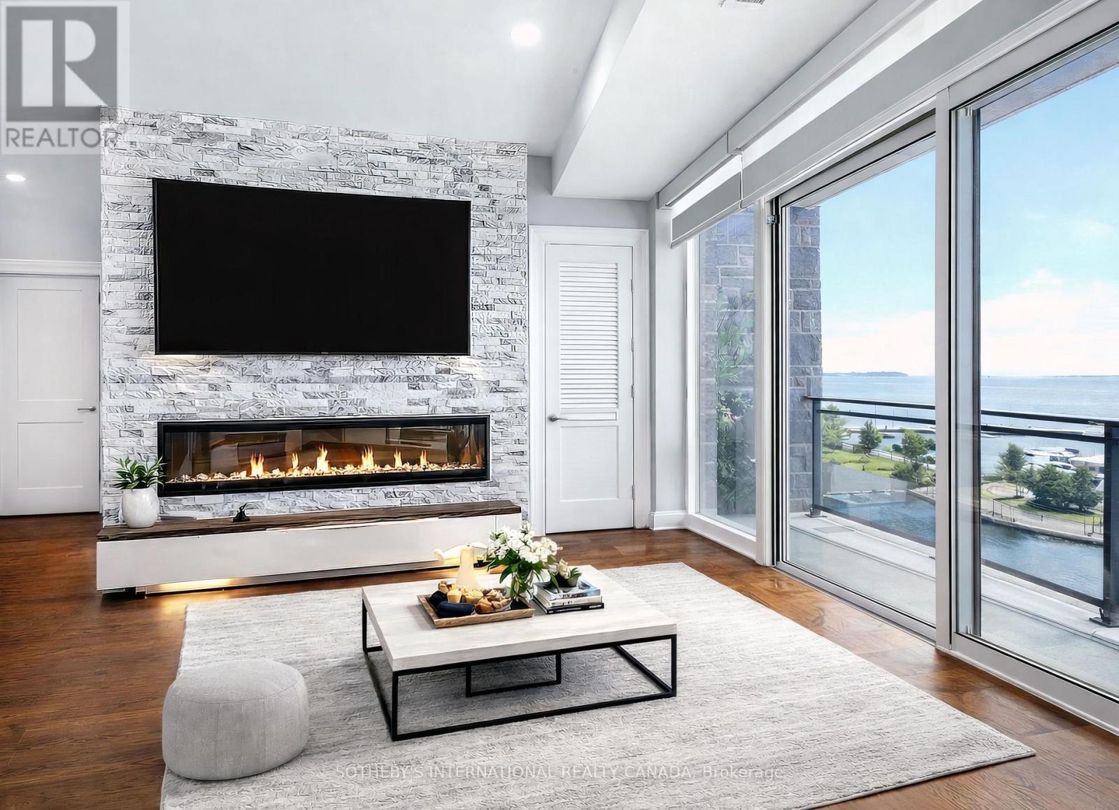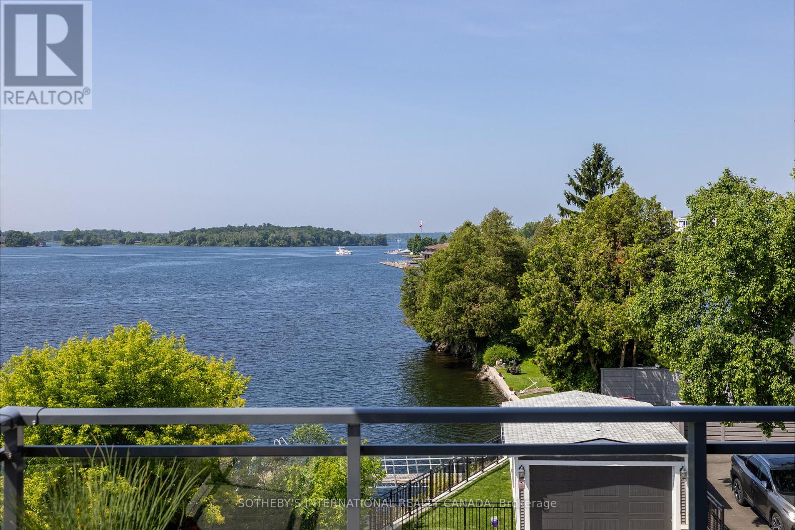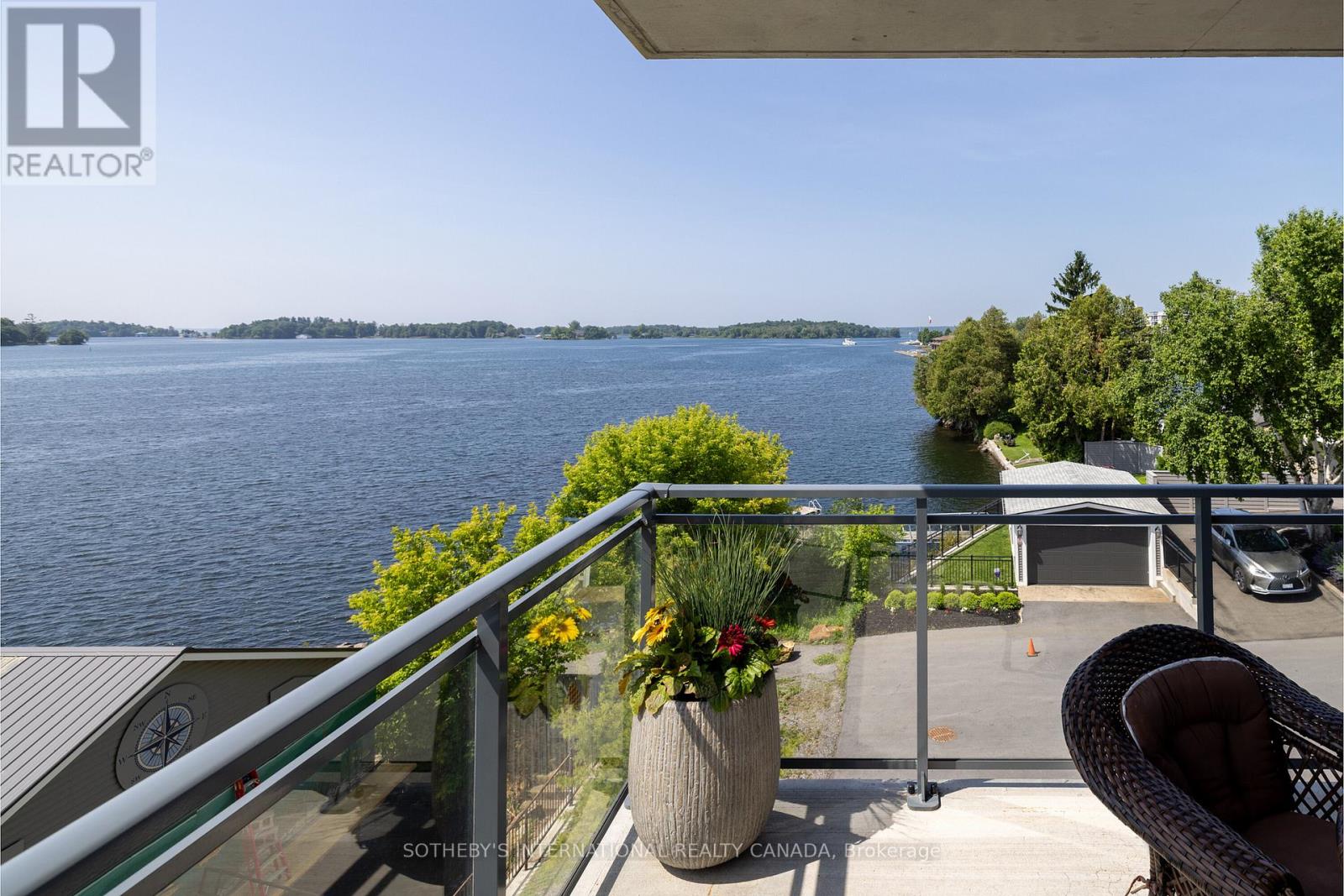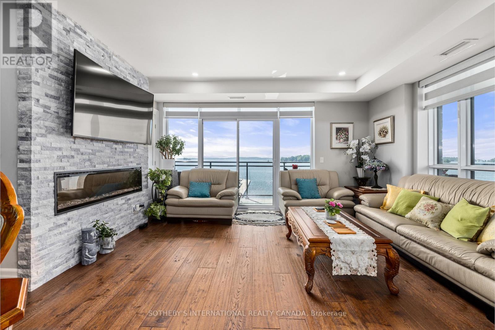 Experience refined waterfront living along the iconic St. Lawrence River in this exceptional 2-bedroom, 2-bathroom corner residence. Showcasing sweeping 270-degree panoramic views to the south, west, and north, this home captures ever-changing skies, sparkling water, and unforgettable sunsets from nearly every vantage point. Designed for those who appreciate both luxury and lifestyle, this residence offers a rare and coveted 44-foot private boat slip-inviting you to move seamlessly from elegant everyday living to effortless escapes on the water. Inside, a thoughtfully designed open-concept layout blends sophistication with comfort. A striking stone accent wall anchors the living space, where a sleek fireplace and curved 60" television create a warm, contemporary focal point-perfect for both intimate evenings and elevated entertaining. The gourmet kitchen is a statement in both form and function, featuring high-end appliances, marble countertops, a custom backsplash, and a layout designed to maximize space and flow. Throughout the home, upgraded hardwood flooring, motorized smart blinds, and curated lighting enhance the sense of modern luxury. The primary suite offers a tranquil retreat, complete with a spa-inspired ensuite and serene water views-an ideal place to unwind and recharge. Additional features include two parking spaces and a generous storage locker, ensuring convenience matches the home's elegance. This is more than a residence-it is a rare opportunity to embrace a sophisticated waterfront lifestyle, where luxury, comfort, and natural beauty converge. Please note that some photos have been virtually staged. (id:44758)