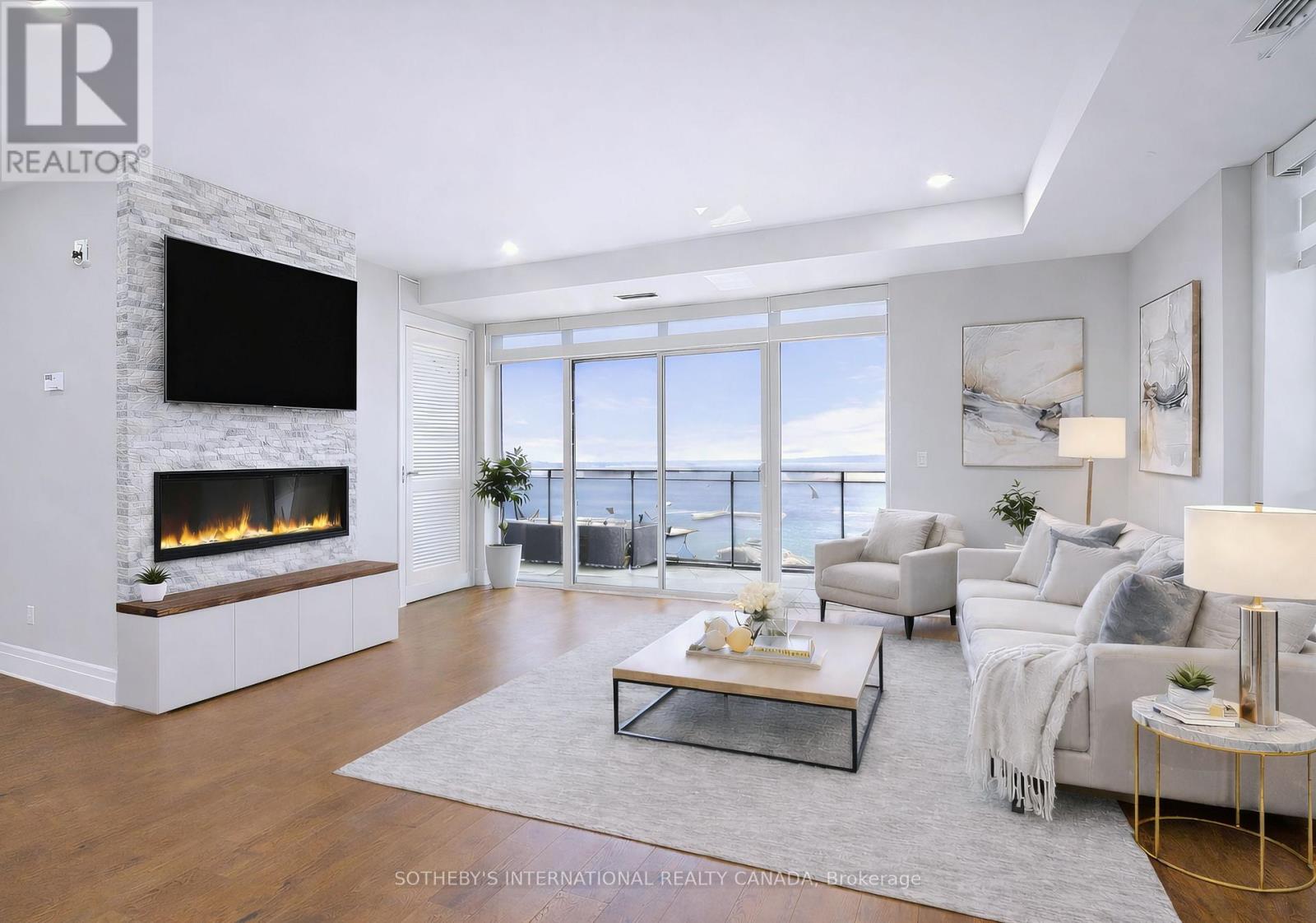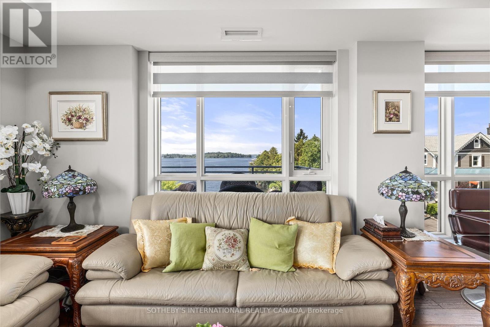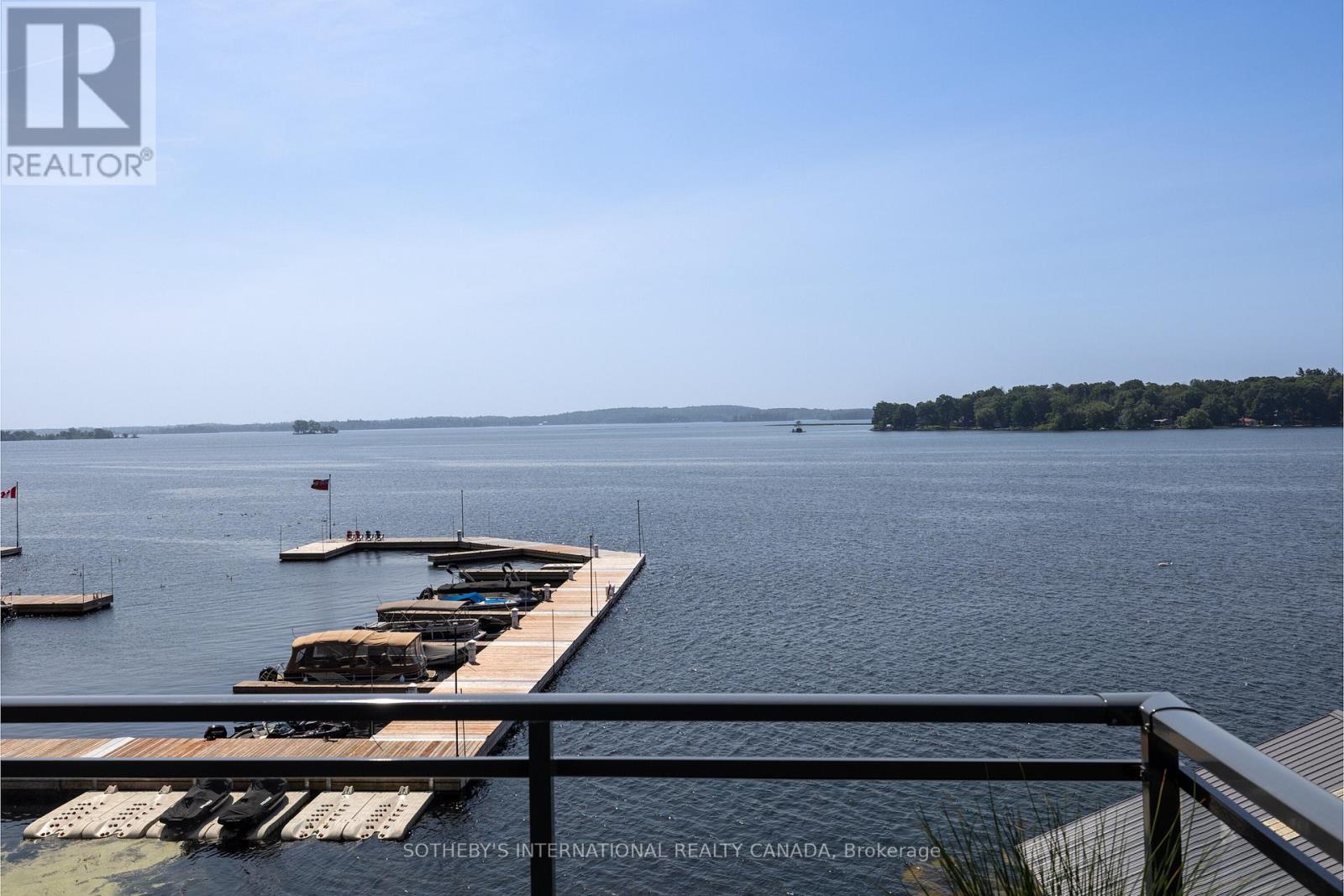 Experience refined waterfront living along the iconic St. Lawrence River in this exceptional 2-bedroom, 2-bathroom corner residence. Showcasing sweeping 270-degree panoramic views to the south, west, and north, this home captures ever-changing skies, sparkling water, and unforgettable sunsets from nearly every vantage point. Designed for those who appreciate both luxury and lifestyle, this residence offers a rare and coveted 44-foot private boat slip-inviting you to move seamlessly from elegant everyday living to effortless escapes on the water. Inside, a thoughtfully designed open-concept layout blends sophistication with comfort. A striking stone accent wall anchors the living space, where a sleek fireplace and curved 60" television create a warm, contemporary focal point-perfect for both intimate evenings and elevated entertaining. The gourmet kitchen is a statement in both form and function, featuring high-end appliances, marble countertops, a custom backsplash, and a layout designed to maximize space and flow. Throughout the home, upgraded hardwood flooring, motorized smart blinds, and curated lighting enhance the sense of modern luxury. The primary suite offers a tranquil retreat, complete with a spa-inspired ensuite and serene water views-an ideal place to unwind and recharge. Additional features include two parking spaces and a generous storage locker, ensuring convenience matches the home's elegance. This is more than a residence-it is a rare opportunity to embrace a sophisticated waterfront lifestyle, where luxury, comfort, and natural beauty converge. Please note that some photos have been virtually staged. (id:44758)