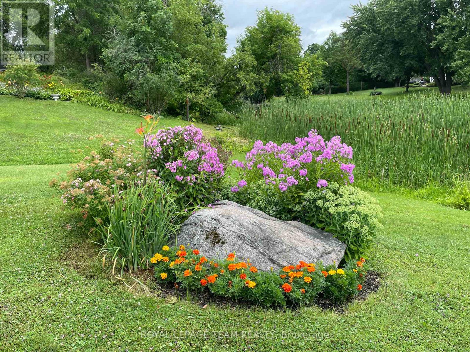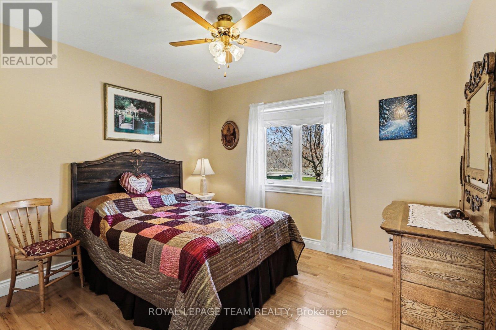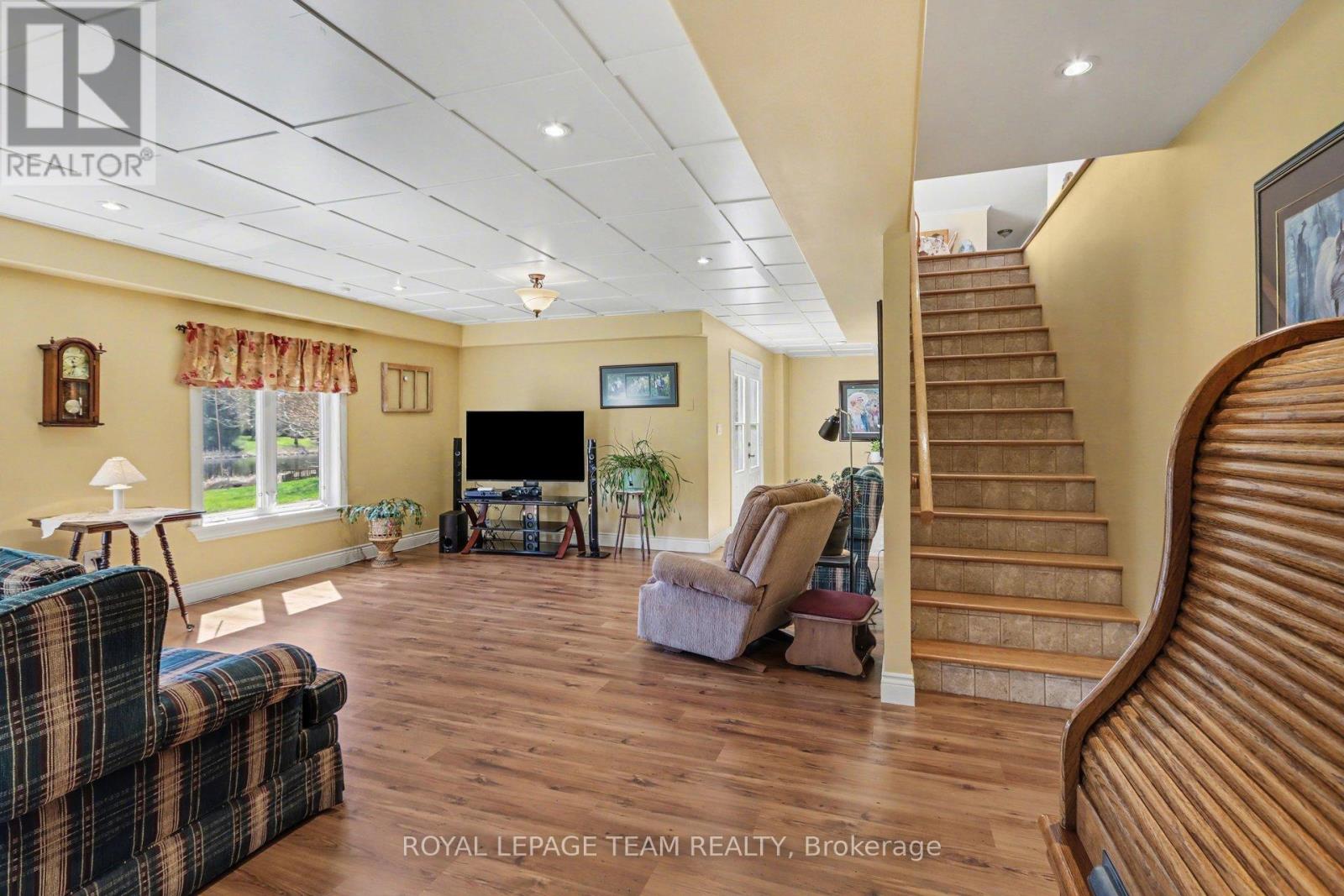 Set on a picturesque acre of waterfront land, this beautiful stone bungalow offers the perfect balance of peaceful rural living and convenient access to Kemptville's amenities. Step inside to a bright, open-concept main level featuring rich hardwood floors and an inviting layout ideal for both everyday living and entertaining. The spacious kitchen provides ample counter space and a generous pantry, while the dining area opens onto a back deck-perfect for enjoying morning coffee or evening sunsets by the water. A sun-filled den or sitting nook boasts plenty pf natural light. a great space to relax and take in the serene waterfront views.The main floor includes three well-appointed, soundproofed bedrooms, ensuring comfort and privacy for the whole family. The primary suite is a true retreat, complete with his-and-hers walk-in closets and a luxurious 4-piece ensuite featuring a large soaker tub. Convenient main-floor laundry adds to the home's thoughtful design.The fully finished lower level expands your living space with a bright family room featuring heated floors-ideal for cozy comfort year-round. This level also includes a walkout den to the backyard, a large fourth bedroom, a half bathroom, and abundant storage, including a cold room. Additional highlights include a double attached garage with both interior and exterior access, beautifully landscaped perennial gardens, a charming stone walkway, and a circular driveway that enhances both curb appeal and functionality.This exceptional waterfront property is a rare opportunity to enjoy privacy, space, and natural beauty-without sacrificing proximity to town. conveniences. (id:44758)