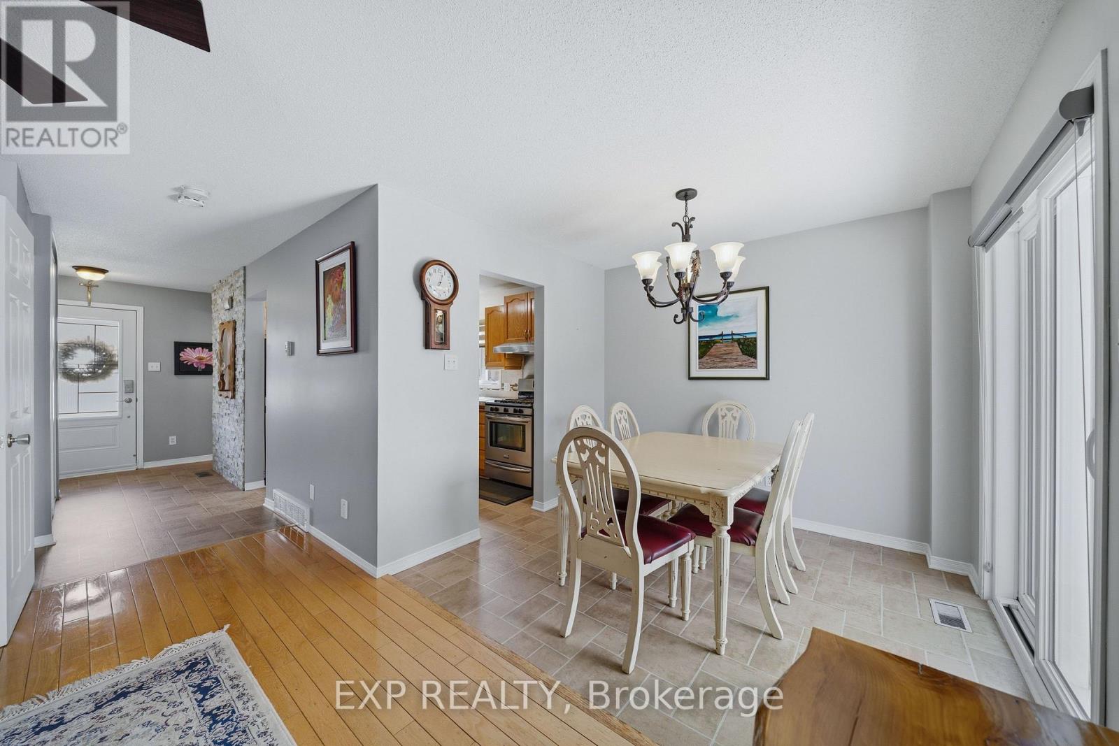 This bright and spacious 3-bedroom, 3-bath home sits on a pie-shaped lot in Rockland and features a welcoming front porch that leads into a large entry with a generous closet, opening into a living room filled with natural light. The kitchen, equipped with stainless steel appliances, flows seamlessly into the dining area, which offers walk-out access to the fully fenced rear yard - a perfect space for entertaining or relaxing. A convenient powder room completes the main level. Upstairs, the primary bedroom is accompanied by two additional bedrooms and a full bathroom, providing ample space for family living. The finished basement adds extra living space with a family room, a laundry area/powder room with a rough-in for a second full bathroom, plus a cozy pellet stove for warmth. Outside, the fully fenced backyard includes a gazebo for outdoor enjoyment. With plenty of living space, this home is ideal for families seeking comfort and convenience in Rockland. (id:44758)