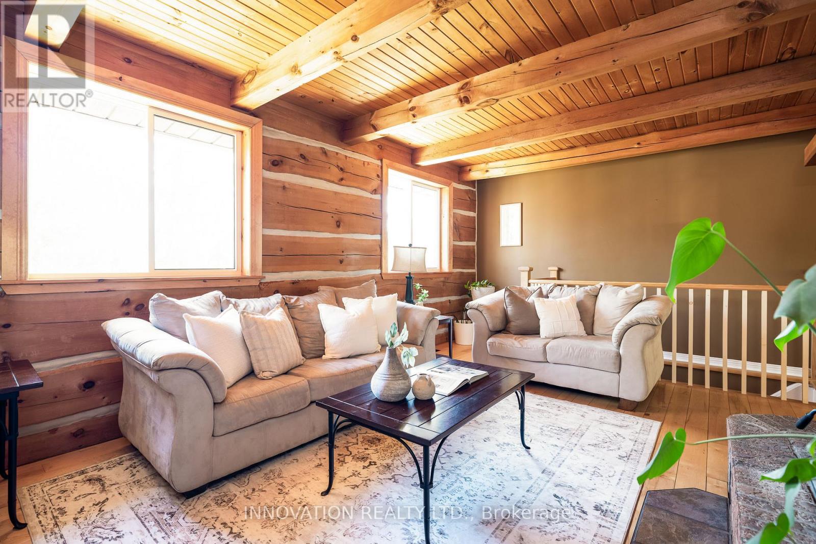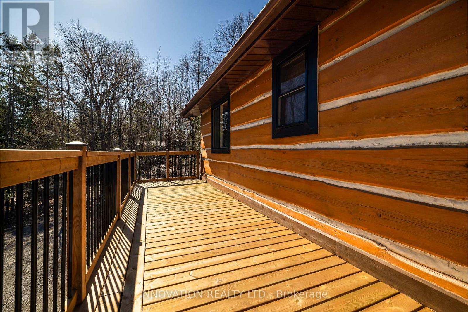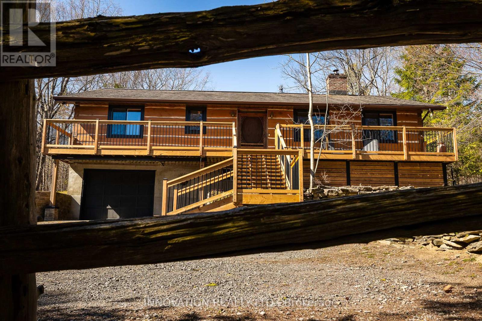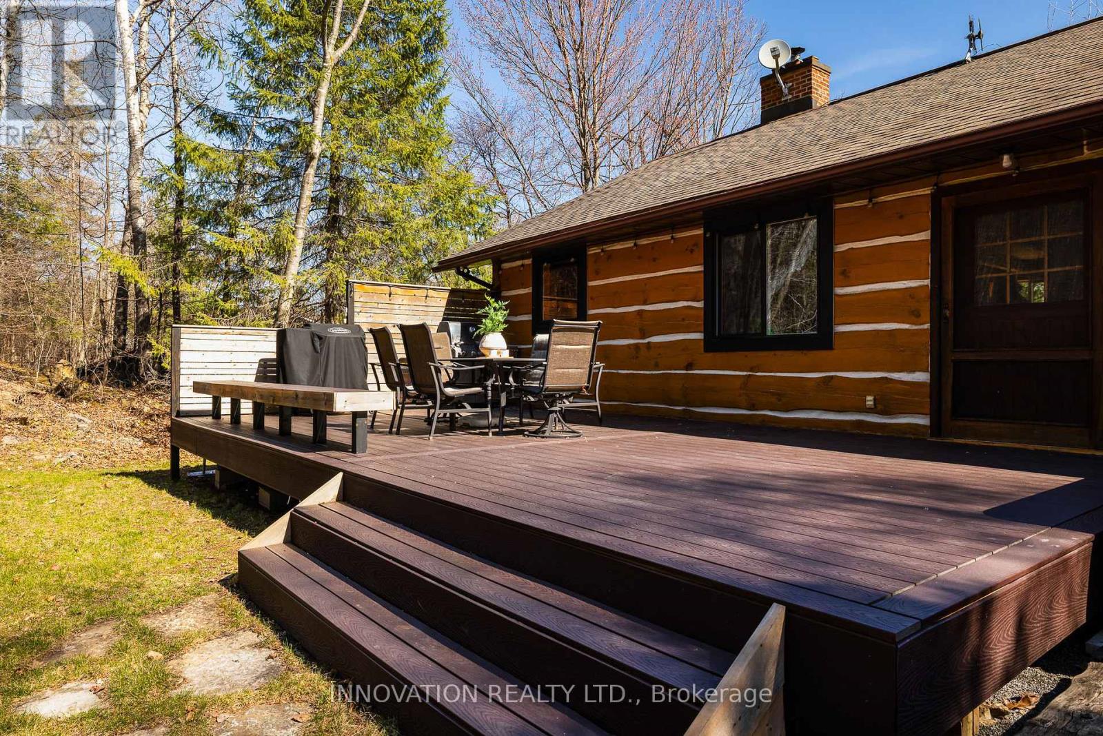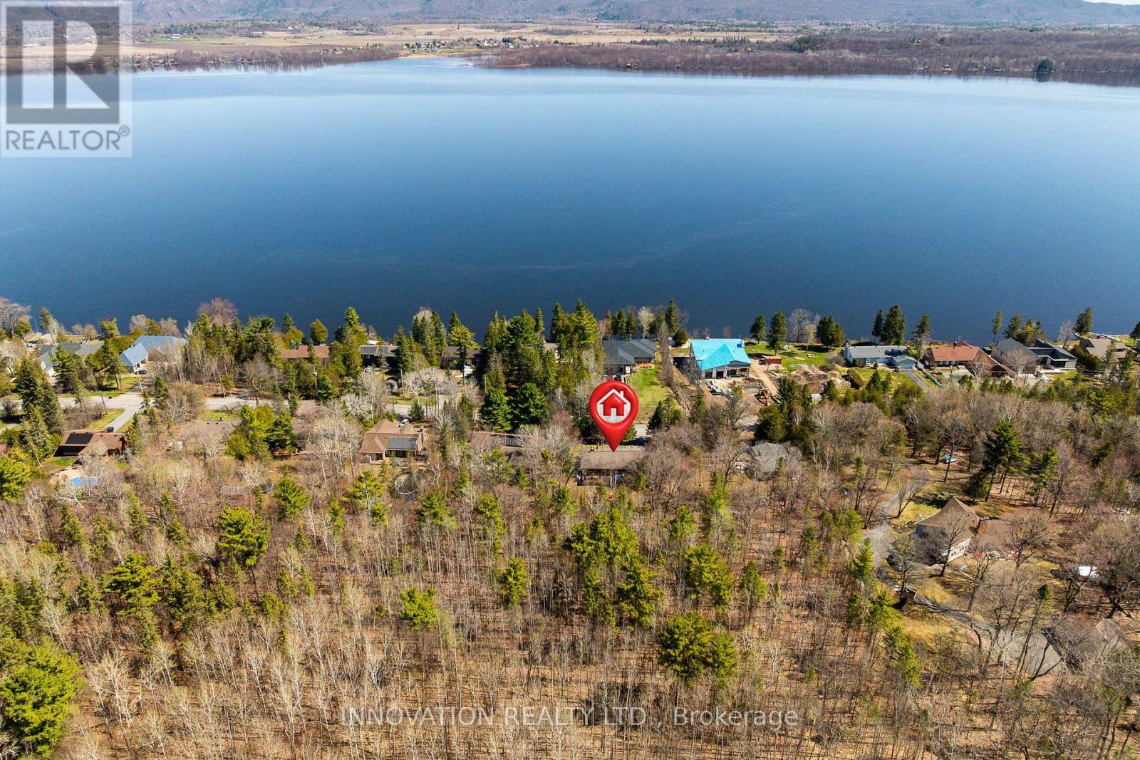 Welcome to Prestigious Barlow Crescent in Dunrobin Shores. Set on a scenic stretch with views of the Gatineau Hills and the Ottawa River, this distinct log home combines rustic charm with unforgettable curb appeal.Black-trimmed windows frame the exterior beautifully, while a full-length front deck invites you to take in the peaceful surroundings. Step inside to a spacious foyer with oversized pine doors that make a striking first impression.The open-concept kitchen and dining area feature warm hardwood flooring that flows seamlessly into the living space-anchored by an airtight wood-burning fireplace, perfect for cozy evenings.The generous primary bedroom includes a private 2-piece ensuite, while a second bedroom overlooks the beautifully treed backyard. A large family bathroom also offers the convenience of an integrated laundry area.The lower level adds valuable flex space great for a home office, a gym, or additional living area-along with inside entry from the garage and access to the abundant raised crawl space storage.Out back, enjoy a spacious south-facing deck, private yard, and firepit-ideal for entertaining or unwinding outdoors.This one-of-a-kind home offers a rare blend of comfort, character, and natural surroundings in one of Ottawa's most sought-after waterfront communities. (id:44758)