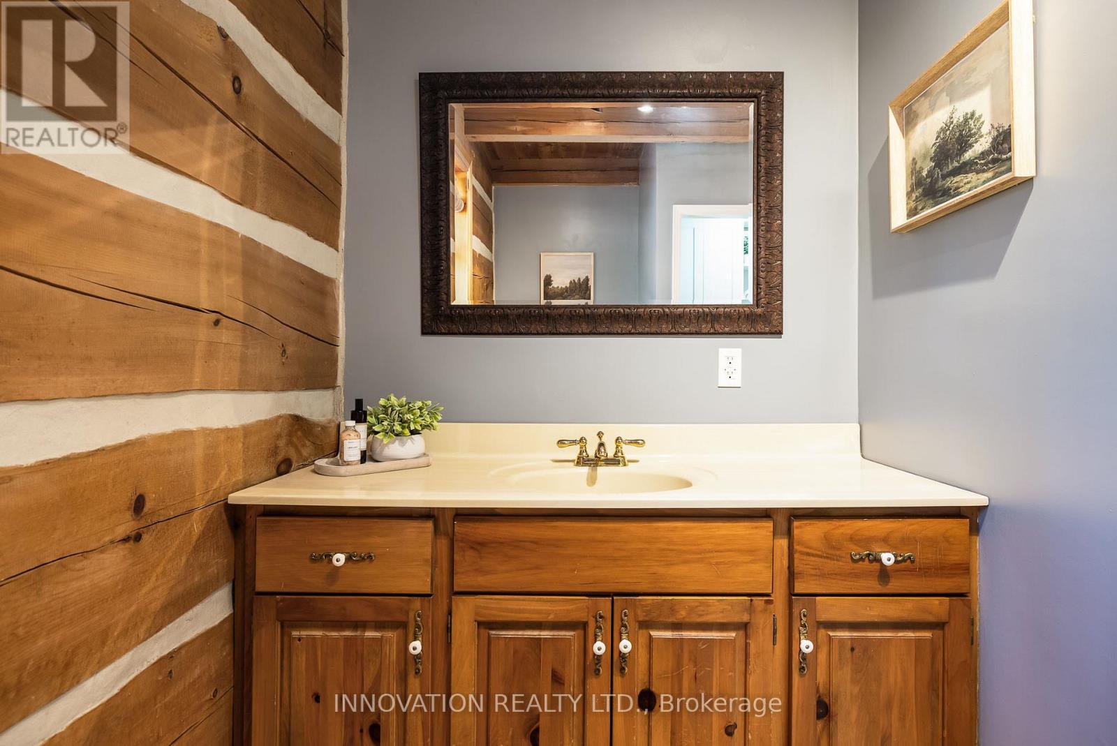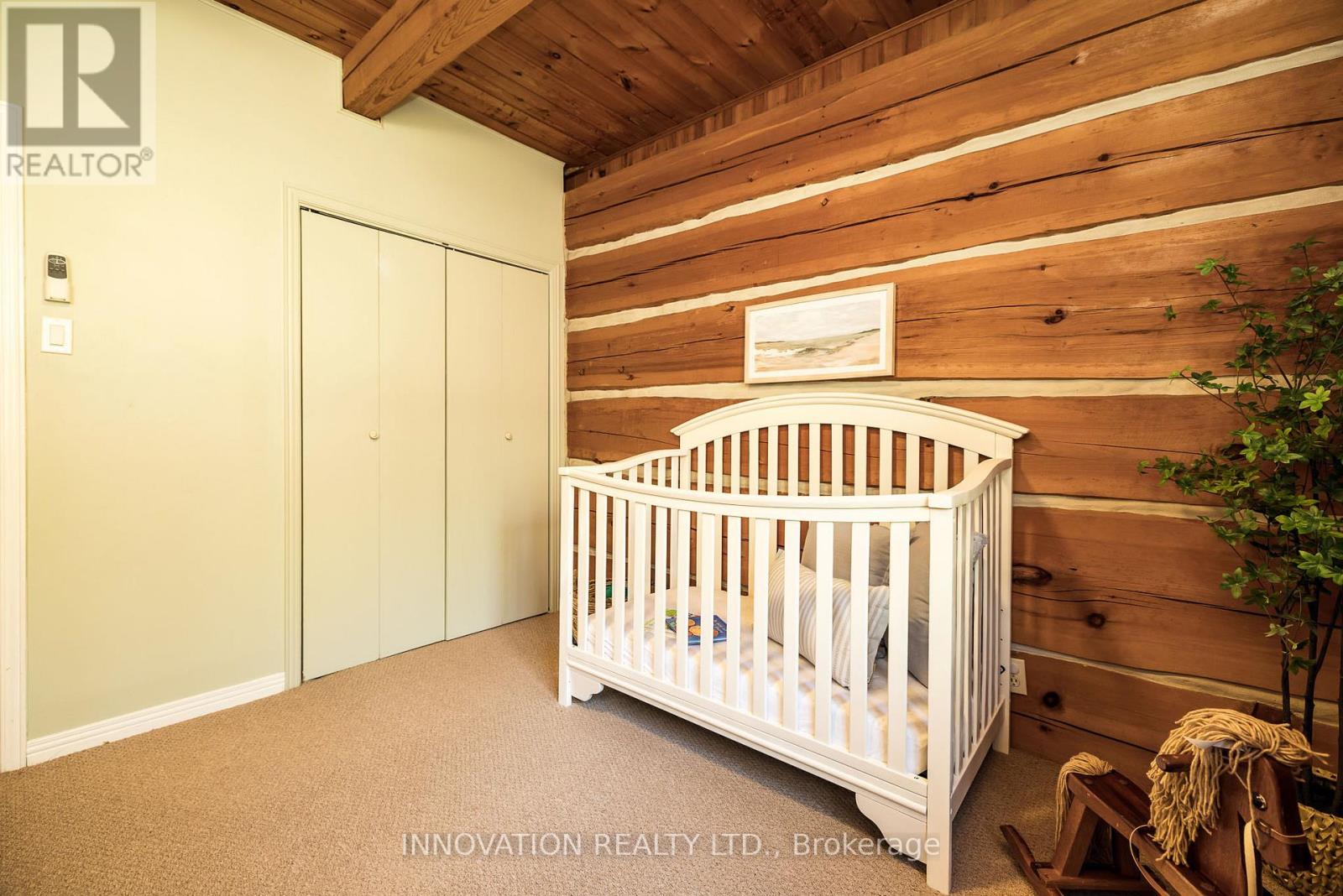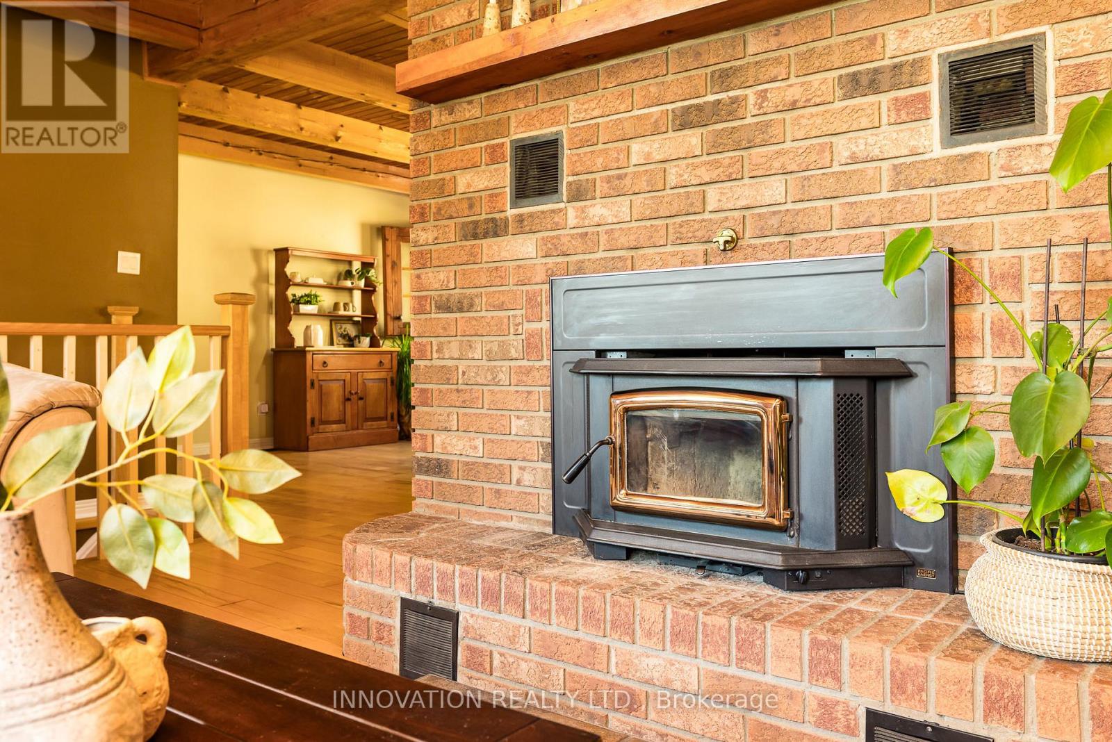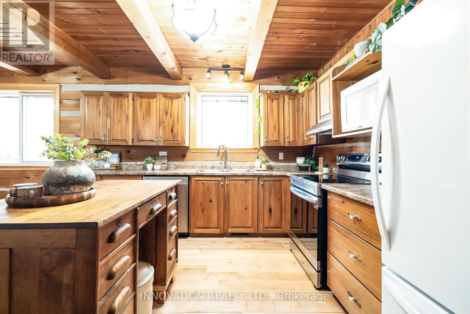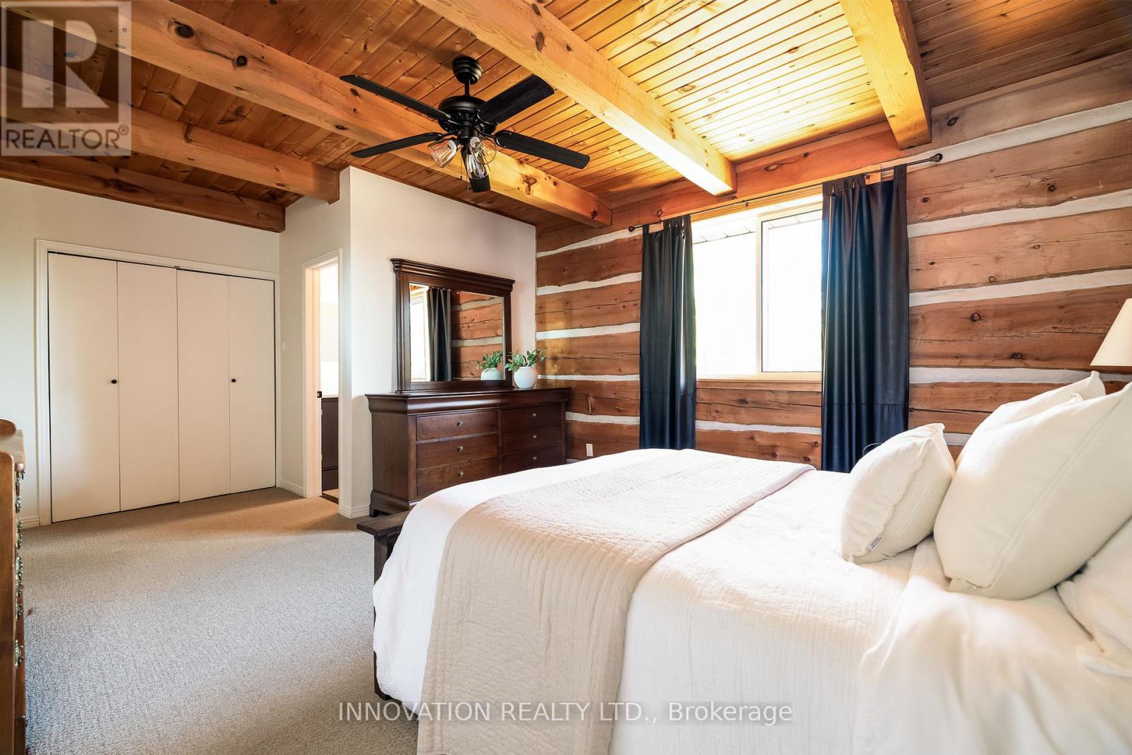 Welcome to Prestigious Barlow Crescent in Dunrobin Shores. Set on a scenic stretch with views of the Gatineau Hills and the Ottawa River, this distinct log home combines rustic charm with unforgettable curb appeal.Black-trimmed windows frame the exterior beautifully, while a full-length front deck invites you to take in the peaceful surroundings. Step inside to a spacious foyer with oversized pine doors that make a striking first impression.The open-concept kitchen and dining area feature warm hardwood flooring that flows seamlessly into the living space-anchored by an airtight wood-burning fireplace, perfect for cozy evenings.The generous primary bedroom includes a private 2-piece ensuite, while a second bedroom overlooks the beautifully treed backyard. A large family bathroom also offers the convenience of an integrated laundry area.The lower level adds valuable flex space great for a home office, a gym, or additional living area-along with inside entry from the garage and access to the abundant raised crawl space storage.Out back, enjoy a spacious south-facing deck, private yard, and firepit-ideal for entertaining or unwinding outdoors.This one-of-a-kind home offers a rare blend of comfort, character, and natural surroundings in one of Ottawa's most sought-after waterfront communities. (id:44758)