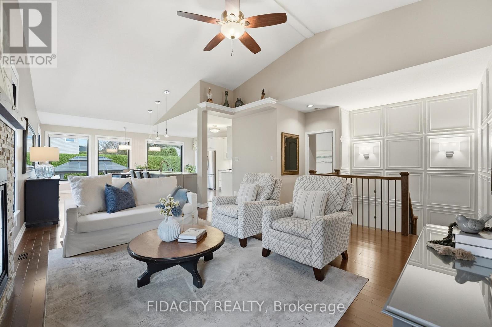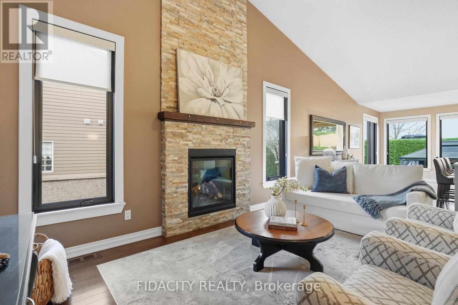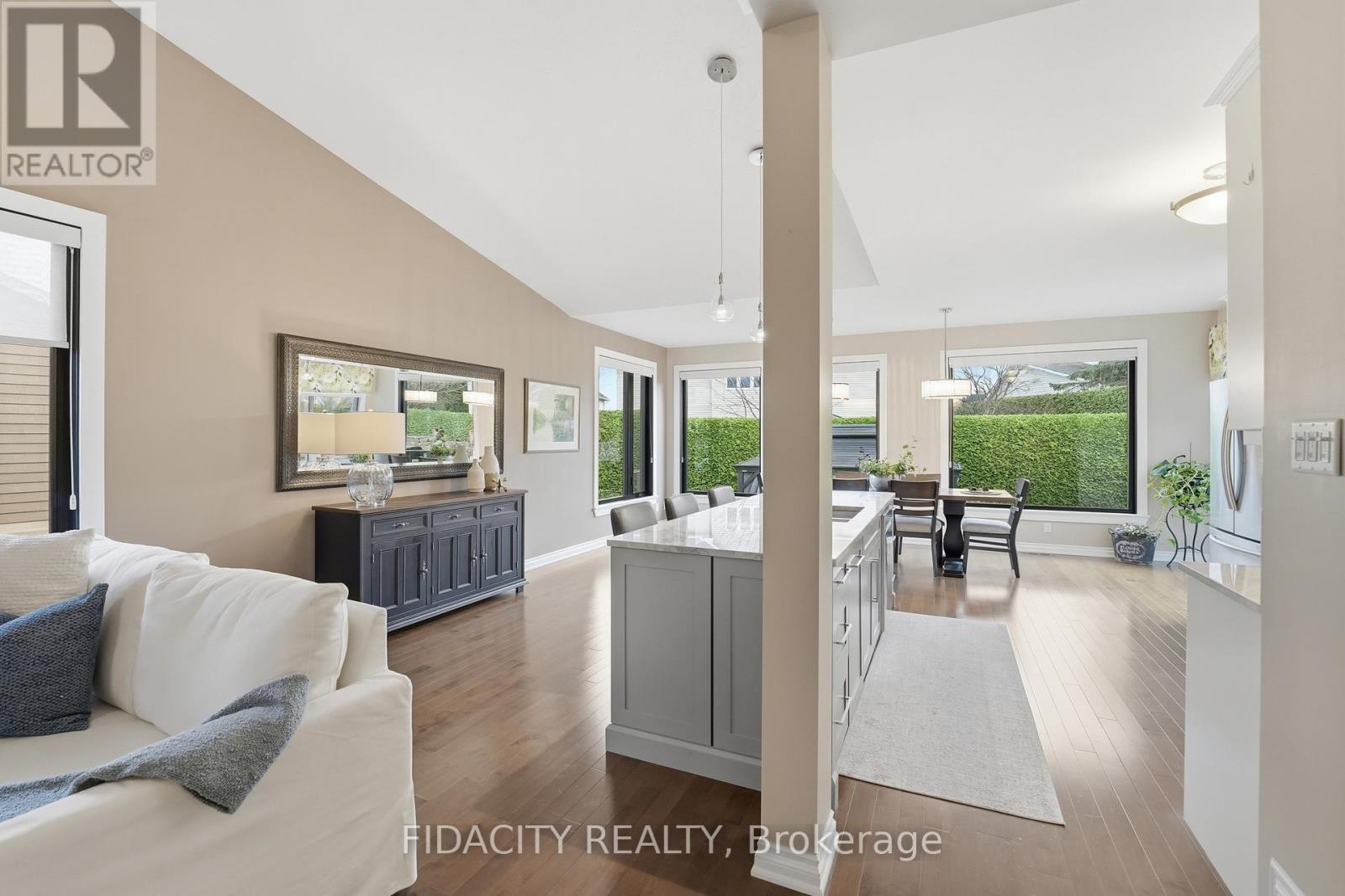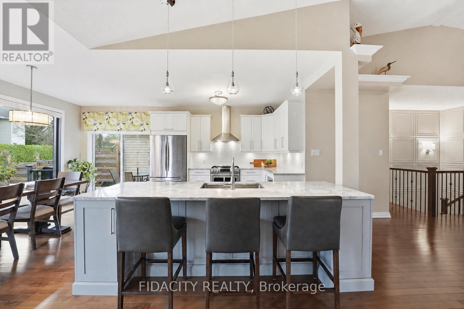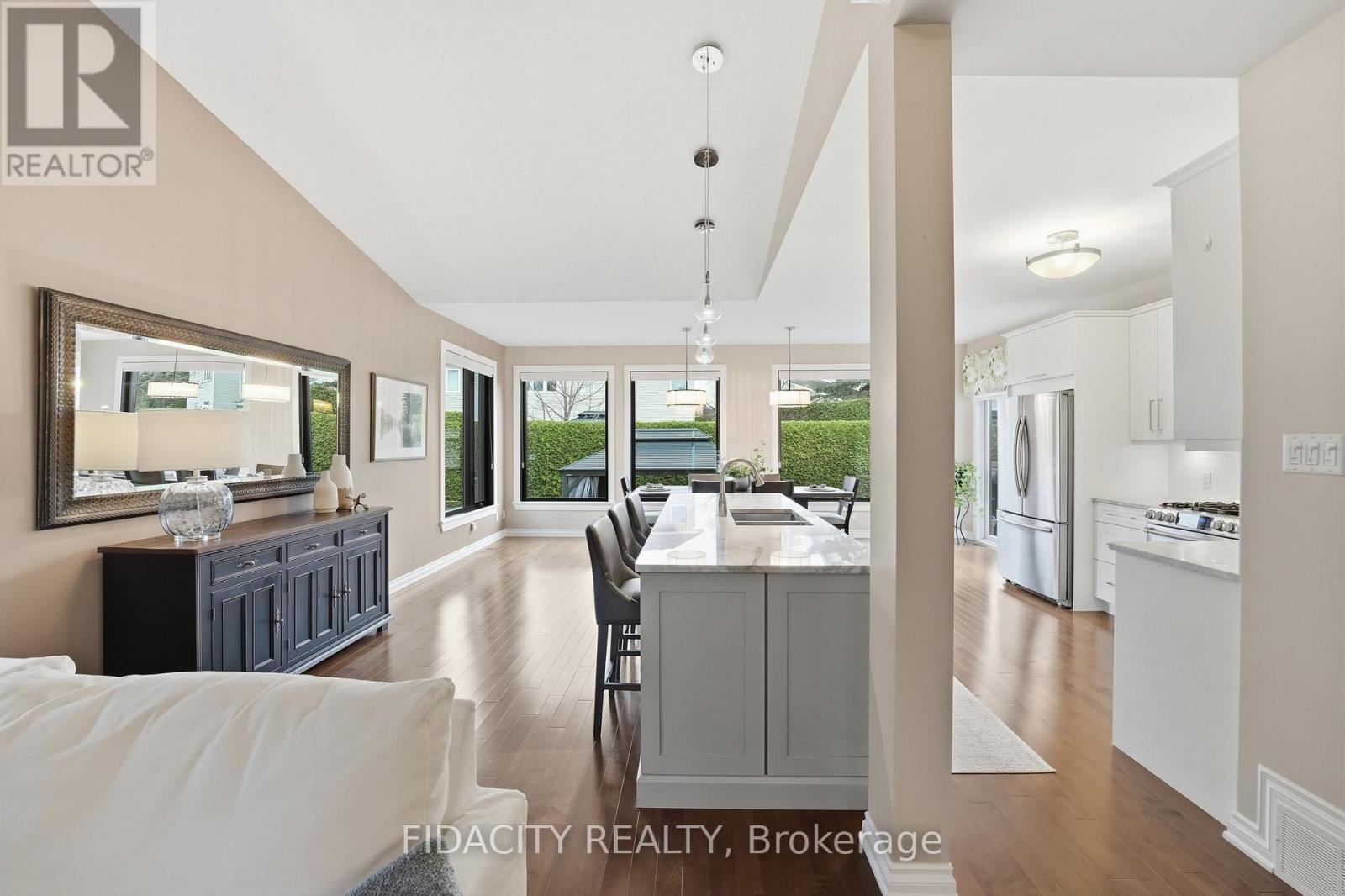 Welcome to 31 Sable Run, a beautifully renovated Holitzner end-unit bungalow with a double car garage, located in the highly sought-after Crossing Bridge community in Stittsville. This 3-bedroom, 3 full bathroom home has been meticulously maintained by its owners-and it shows.Stunning hardwood flooring welcomes you through the main level, where you'll find a front bedroom or office alongside a full bathroom with a stand up glass shower. The main level features an open-concept layout with vaulted ceilings and striking black-framed picture windows that truly take your breath away.The living room showcases a beautiful fireplace feature, with stone extending up to the high ceilings and mantle, creating a warm focal point. The Laurysen kitchen is fit for a chef, complete with an oversized island with breakfast bar seating, extra storage, marble countertops, stainless steel appliances, a built-in microwave, and an open hood range. It overlooks a large dining space with surrounding views of the yard and mature hedges.New patio doors lead to the deck and finished interlock area, perfect for all your entertaining needs! The primary bedroom offers ample space to accommodate any furniture setup and features double walk-in closets and Ensuite. The renovated ensuite includes a larger tub insert and a linen closet, completing this comfortable retreat. An accent stairwell leads to the lower level, which does not disappoint, featuring a spacious rec room with high ceilings and an oversized bedroom or secondary rec space. A third finished room provides extra finished storage area, along with a walk-in laundry room and a full bathroom with a stand-up shower. Located close to walking trails, parks, shopping, recreation, and highway access, this home is in the perfect location. 24hrs irrevocable on offers as per form 244 (id:44758)
