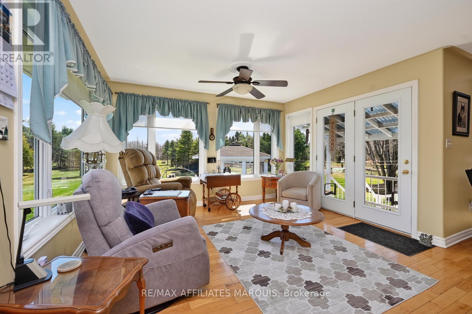 Custom-Built Home on 22+ Acres - Welcome to this exceptional, one-owner 3+1 bedroom custom-built home, perfectly nestled on over 22 acres of pristine forested land. A true showcase of pride of ownership, this property has been meticulously maintained and thoughtfully cared for, offering a rare opportunity to own a private retreat with an extensive trail system winding throughout the acreage. Ideal for outdoor enthusiasts, the established network of trails invites year-round enjoyment-whether it's walking, snowshoeing, cross-country skiing, or exploring your own backyard wilderness. With three hunting stands and a private range already in place, this property is perfectly suited for those seeking a recreational escape without sacrificing proximity to town. Located just 5 minutes from Smiths Falls, 15 minutes to Carleton Place, and with a short commute to Ottawa, you'll enjoy the perfect balance of peaceful country living and everyday convenience. Step inside to a spacious open-concept main floor featuring gleaming hardwood floors, a welcoming great room, formal dining area, cozy sitting nook, and an expansive kitchen designed for entertaining. Two full bathrooms on the main level-a 4-piece and a 3-piece-offer added functionality. The generous primary bedroom includes a walk-in closet, while two additional bedrooms provide flexibility, including one currently used as an office. The lower level extends your living space with a large family room warmed by a wood stove, a fourth bedroom, and ample space for a workshop, hobby room, home gym, or storage. Outdoors, the beautifully landscaped setting continues to impress with an oversized 2-car garage, a fully enclosed gazebo (2015), and a large patio (2014) perfect for entertaining or relaxing in nature. Recent updates include roof shingles (2021), ensuring peace of mind for years to come. A truly special property where acreage, and an exceptional lifestyle come together (id:44758)