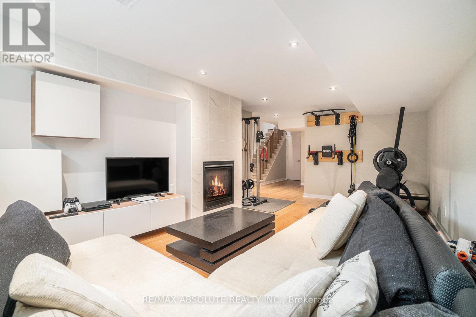 Welcome to this stunning corner-unit townhome in the heart of Stittsville. From the moment you enter this bright, sun-filled home, you'll notice the upscale finishes, soaring ceilings, and thoughtfully designed layout that blends style with everyday comfort.The main level features a tiled foyer and convenient powder room, leading into an open-concept living space highlighted by rich hardwood flooring throughout two levels. The dramatic living room boasts floor-to-ceiling windows and an impressive open-to-above design that fills the home with natural light, while a cozy electric fireplace creates a warm and inviting atmosphere.The chef-inspired kitchen is perfect for entertaining, offering quartz countertops, stainless steel appliances, a gas stove, pot lighting, a spacious island with breakfast bar seating, and generous pantry cabinetry. The adjacent dining area opens through sliding doors to a fully fenced private backyard with a gas BBQ hookup-ideal for outdoor dining and relaxing.Upstairs, the spacious primary suite features a large walk-in closet and a spa-like ensuite complete with an oversized glass and tile shower. Two additional bedrooms, a modern 4-piece bathroom, and convenient second-floor laundry provide both functionality and comfort for family living.The finished basement adds valuable living space with a versatile recreation room perfect for a home gym, media room, or play area, along with ample storage.Additional highlights include Smart Home features such as a Nest thermostat. As a corner unit, the property offers extra windows for abundant natural light, a private driveway, enhanced privacy, and a larger outdoor area.Ideally located just steps from trails, parks, schools, shopping, and dining, this home offers the perfect balance of tranquility and convenience in one of Stittsville's most desirable communities. (id:44758)