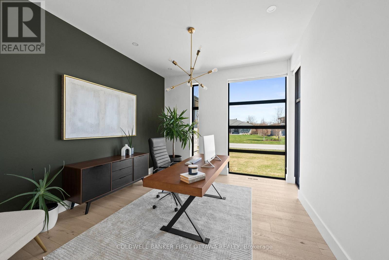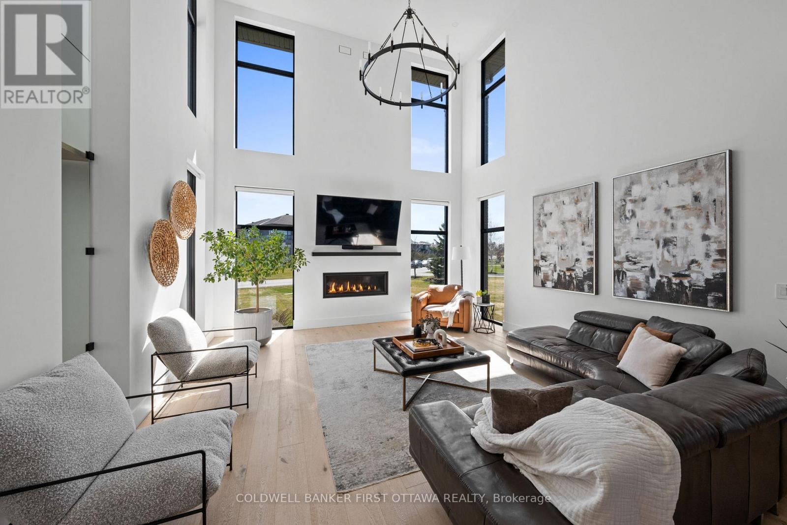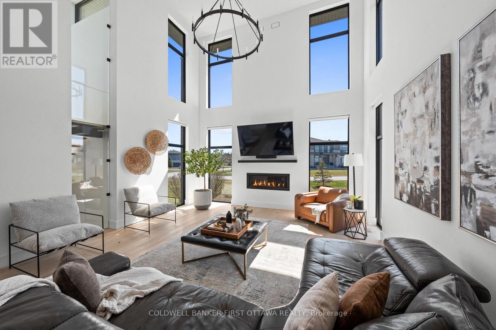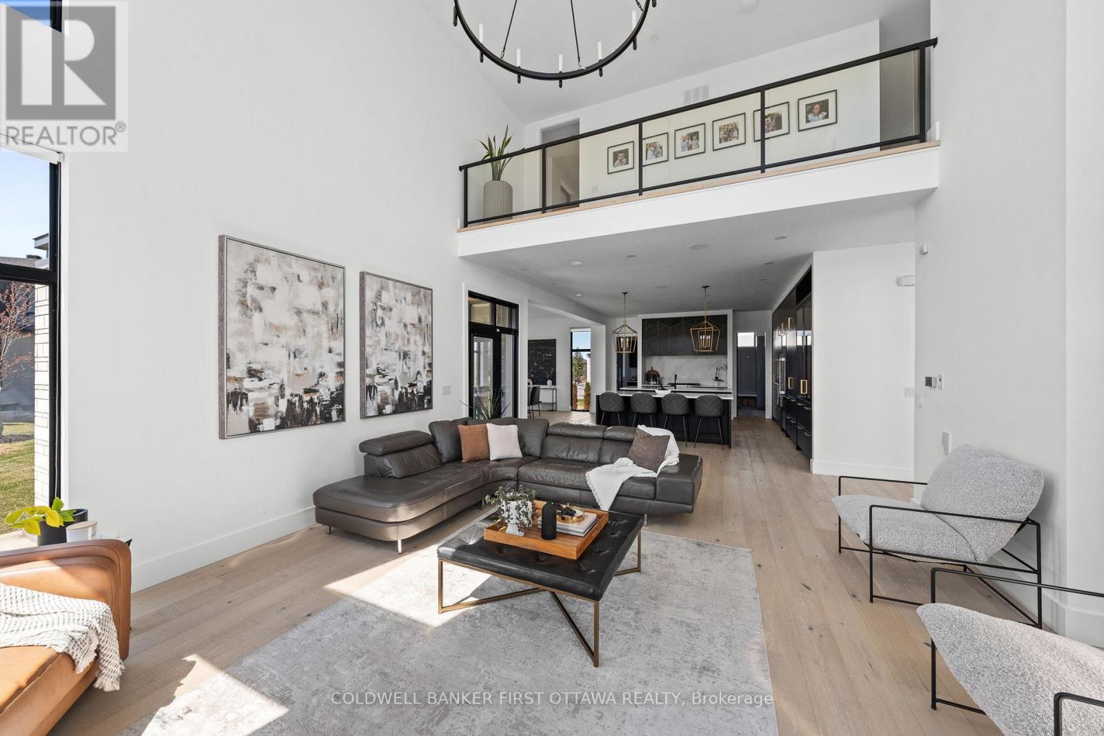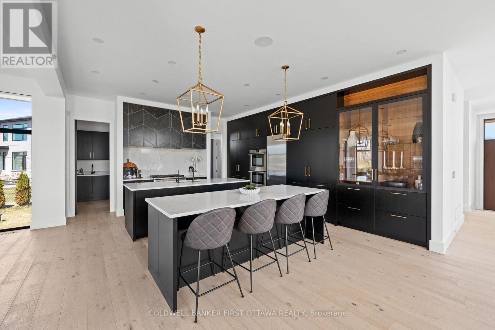 Welcome to 'The Monarch' on McManus, a custom-built residence curated by award-winning O'Keefe-Fiorenza Design Group & completed in 2021 by Relm Construction. Offers 5,600+ sq.ft. of living space w/ premium craftsmanship & attention to detail t/o. Step into a grand foyer & the sun-filled main lvl feat. 10 ft ceilings, wide-plank white oak hardwood & a striking open-concept layout anchored by the 20ft vaulted great room w/ gas fireplace, floating mantle & statement chandelier. The chef & entertaining-inspired kitchen is impressive, showcasing dual oversized islands (one is a true serving island seating for SIX) w/ quartz counters, custom cabinetry, high-end Fisher & Paykel appliances incl. a 6-burner gas range, double wall ovens & integrated fridge, along w/ a serving pantry, wine display & dining area w/ expansive windows. A private front office (or add'l bedroom) w/ floor-to-ceiling windows, a designer 3pc bath, WIC front closet, fully outfitted mudroom w/ custom storage & inside access to the oversized 3 car garage w/ 14ft ceilings. On the 2nd lvl, 9ft ceilings continue alongside a glass-railed private hallway overlooking the great room. The primary suite offers a private & luxe retreat w/ floor-to-ceiling windows, massive custom WIC w/ built-in shelving & drawers, & a luxurious 6pc ensuite feat. a standalone soaker tub, dual rain shower, floating vanity & radiant in-floor heating. Add'l bedrooms are ample in size, incl. a Cheater Ensuite & a separate Bed w/ Ensuite/Guest Suite, while a dedicated laundry suite & linen closet adds convenience. The finished LL expands the living space w/ a rec room feat. fireplace, home health & wellness rm, add'l bed, spa 3pc bath & inside access to garage. Exterior highlights incl. a striking stone/brick/stucco façade & extended driveway. This is a rare opportunity to own a thoughtfully & beautifully designed, turnkey home in a highly sought-after community of Manotick Estates. Love where you live with 'The Monarch'! (id:44758)