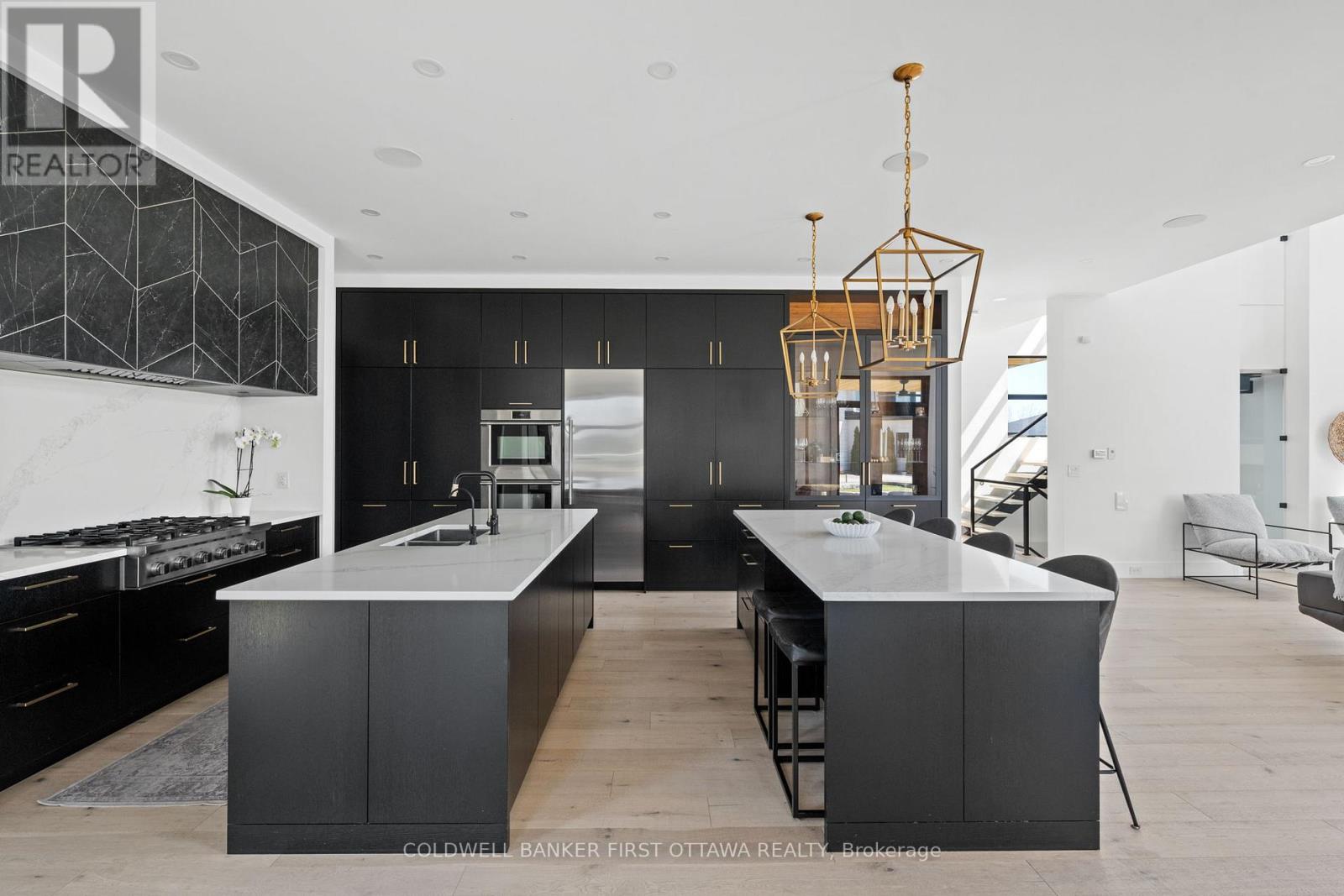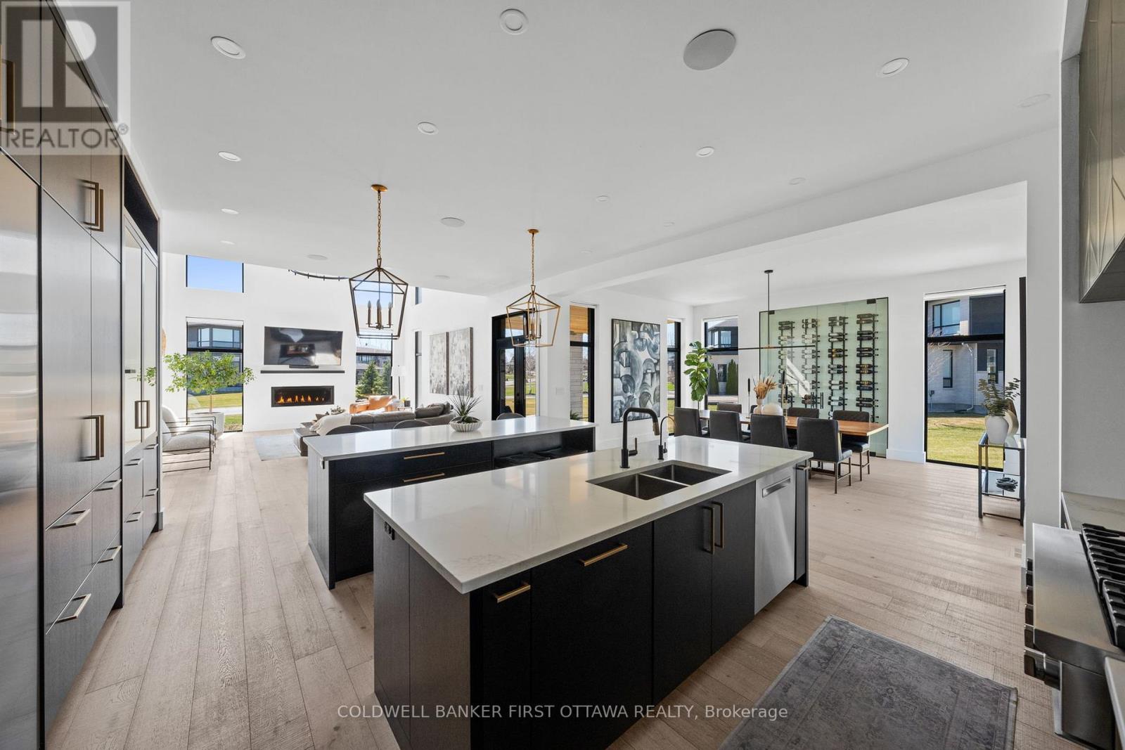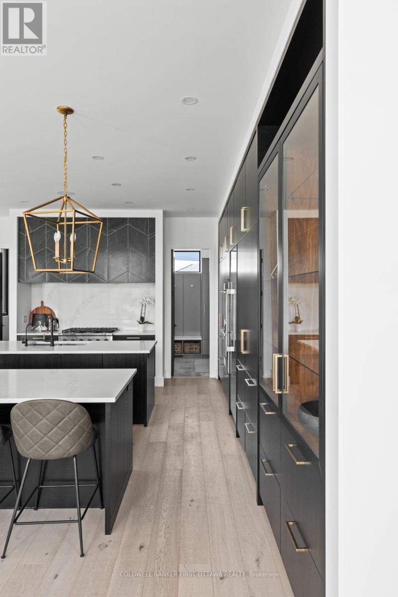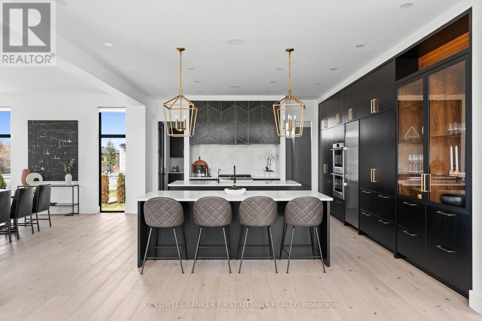 Welcome to 'The Monarch' on McManus, a custom-built residence curated by award-winning O'Keefe-Fiorenza Design Group & completed in 2021 by Relm Construction. Offers 5,600+ sq.ft. of living space w/ premium craftsmanship & attention to detail t/o. Step into a grand foyer & the sun-filled main lvl feat. 10 ft ceilings, wide-plank white oak hardwood & a striking open-concept layout anchored by the 20ft vaulted great room w/ gas fireplace, floating mantle & statement chandelier. The chef & entertaining-inspired kitchen is impressive, showcasing dual oversized islands (one is a true serving island seating for SIX) w/ quartz counters, custom cabinetry, high-end Fisher & Paykel appliances incl. a 6-burner gas range, double wall ovens & integrated fridge, along w/ a serving pantry, wine display & dining area w/ expansive windows. A private front office (or add'l bedroom) w/ floor-to-ceiling windows, a designer 3pc bath, WIC front closet, fully outfitted mudroom w/ custom storage & inside access to the oversized 3 car garage w/ 14ft ceilings. On the 2nd lvl, 9ft ceilings continue alongside a glass-railed private hallway overlooking the great room. The primary suite offers a private & luxe retreat w/ floor-to-ceiling windows, massive custom WIC w/ built-in shelving & drawers, & a luxurious 6pc ensuite feat. a standalone soaker tub, dual rain shower, floating vanity & radiant in-floor heating. Add'l bedrooms are ample in size, incl. a Cheater Ensuite & a separate Bed w/ Ensuite/Guest Suite, while a dedicated laundry suite & linen closet adds convenience. The finished LL expands the living space w/ a rec room feat. fireplace, home health & wellness rm, add'l bed, spa 3pc bath & inside access to garage. Exterior highlights incl. a striking stone/brick/stucco façade & extended driveway. This is a rare opportunity to own a thoughtfully & beautifully designed, turnkey home in a highly sought-after community of Manotick Estates. Love where you live with 'The Monarch'! (id:44758)