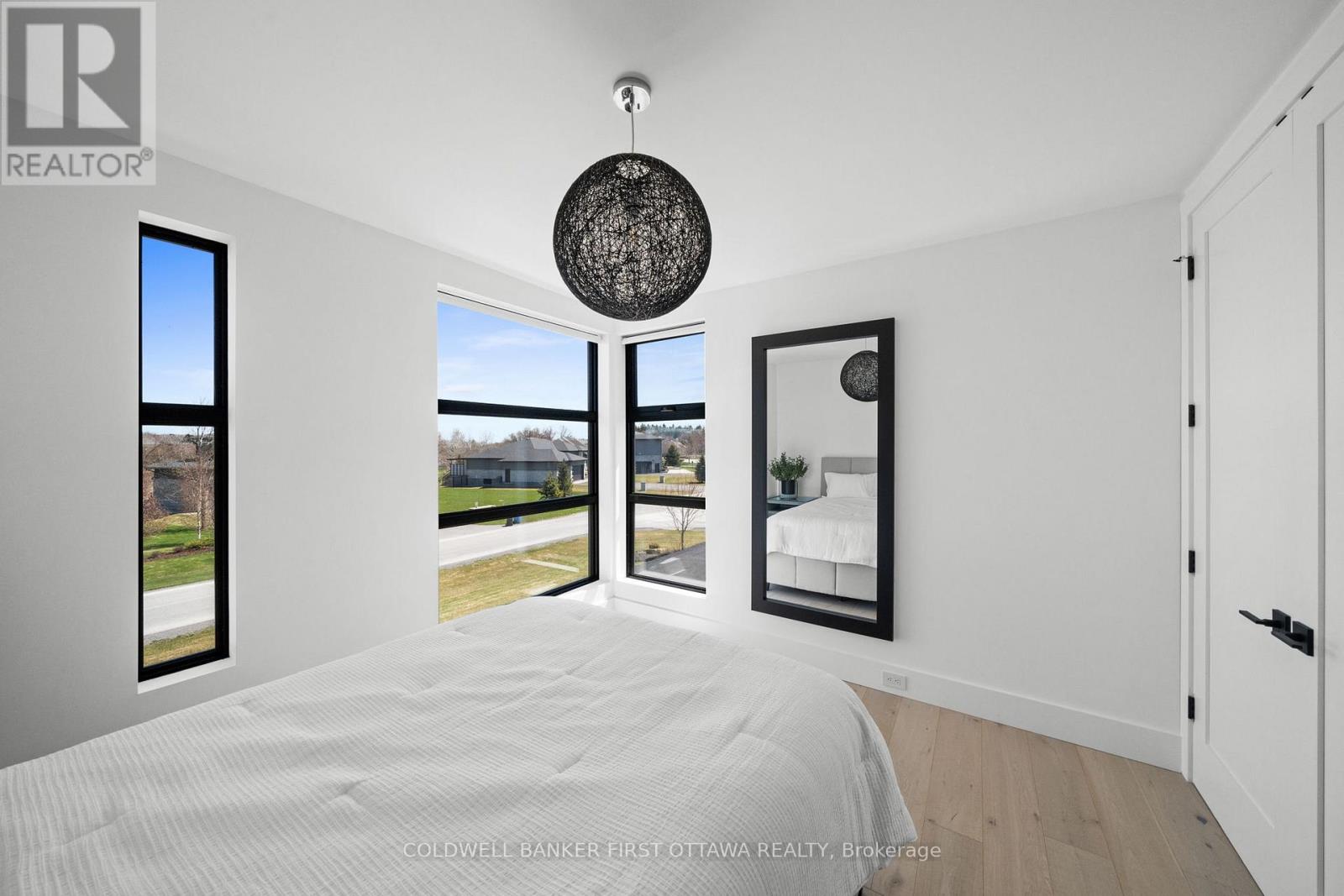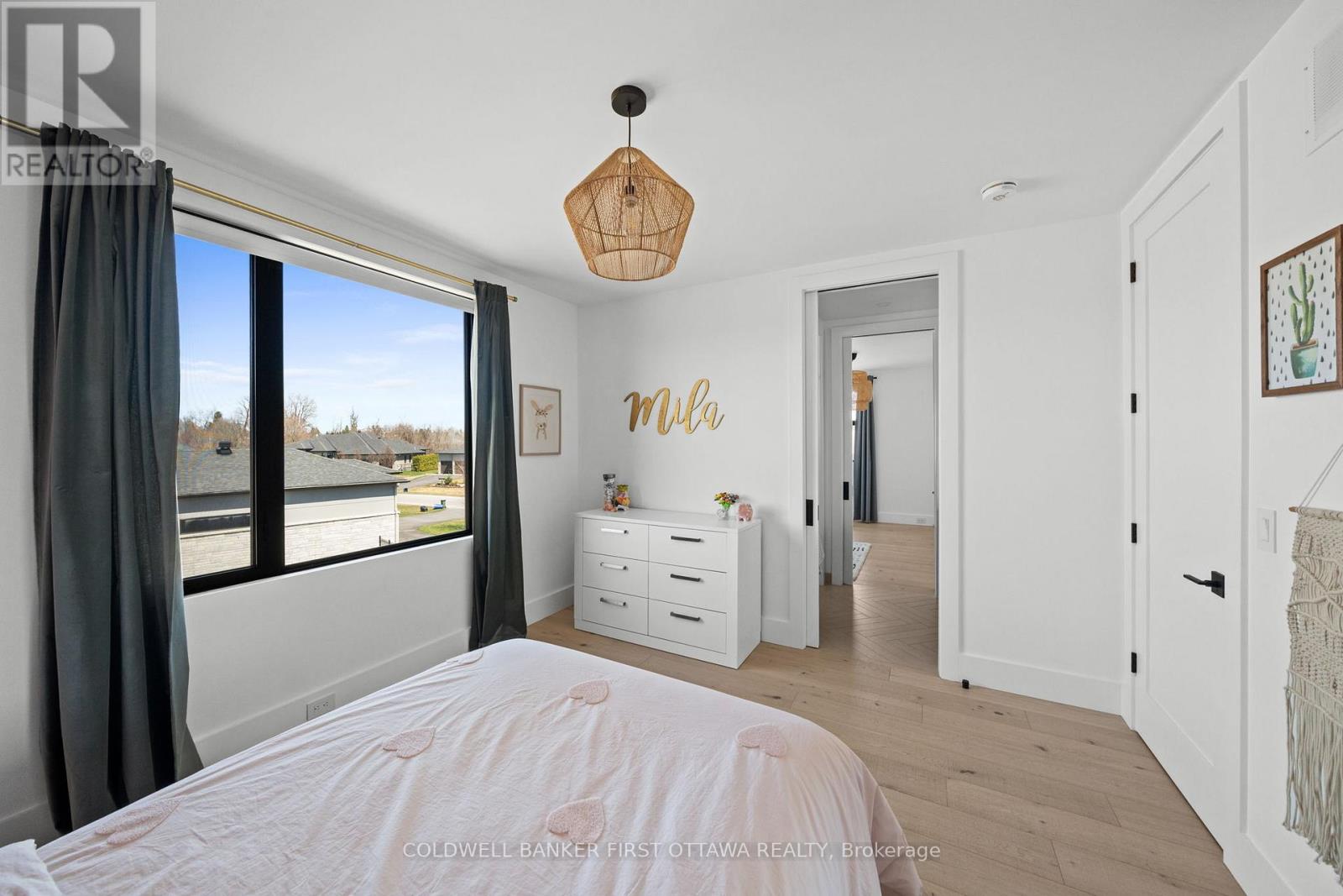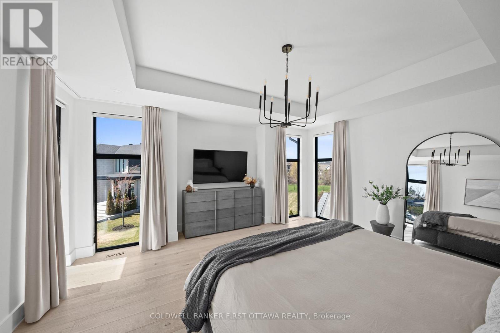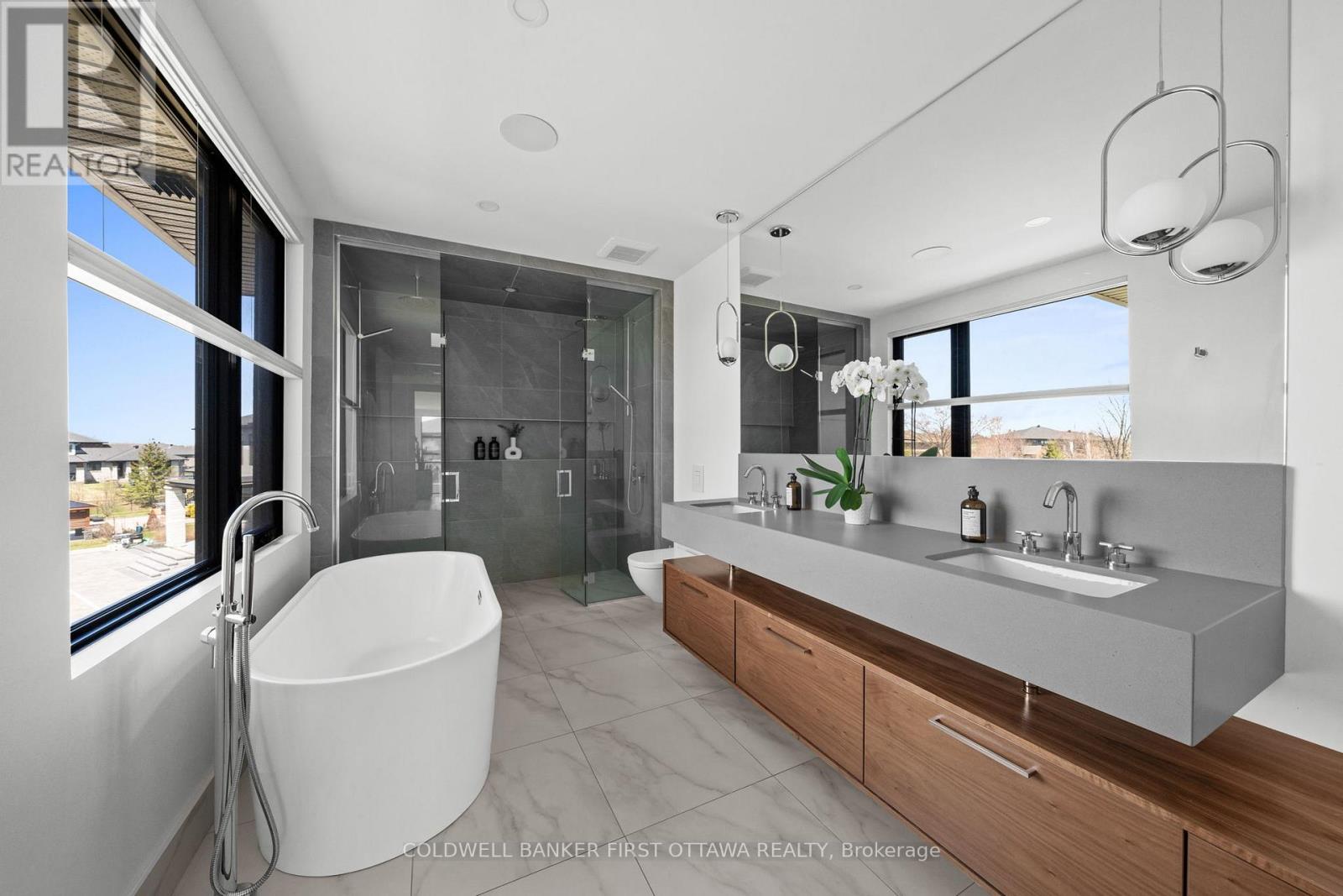 Welcome to 'The Monarch' on McManus, a custom-built residence curated by award-winning O'Keefe-Fiorenza Design Group & completed in 2021 by Relm Construction. Offers 5,600+ sq.ft. of living space w/ premium craftsmanship & attention to detail t/o. Step into a grand foyer & the sun-filled main lvl feat. 10 ft ceilings, wide-plank white oak hardwood & a striking open-concept layout anchored by the 20ft vaulted great room w/ gas fireplace, floating mantle & statement chandelier. The chef & entertaining-inspired kitchen is impressive, showcasing dual oversized islands (one is a true serving island seating for SIX) w/ quartz counters, custom cabinetry, high-end Fisher & Paykel appliances incl. a 6-burner gas range, double wall ovens & integrated fridge, along w/ a serving pantry, wine display & dining area w/ expansive windows. A private front office (or add'l bedroom) w/ floor-to-ceiling windows, a designer 3pc bath, WIC front closet, fully outfitted mudroom w/ custom storage & inside access to the oversized 3 car garage w/ 14ft ceilings. On the 2nd lvl, 9ft ceilings continue alongside a glass-railed private hallway overlooking the great room. The primary suite offers a private & luxe retreat w/ floor-to-ceiling windows, massive custom WIC w/ built-in shelving & drawers, & a luxurious 6pc ensuite feat. a standalone soaker tub, dual rain shower, floating vanity & radiant in-floor heating. Add'l bedrooms are ample in size, incl. a Cheater Ensuite & a separate Bed w/ Ensuite/Guest Suite, while a dedicated laundry suite & linen closet adds convenience. The finished LL expands the living space w/ a rec room feat. fireplace, home health & wellness rm, add'l bed, spa 3pc bath & inside access to garage. Exterior highlights incl. a striking stone/brick/stucco façade & extended driveway. This is a rare opportunity to own a thoughtfully & beautifully designed, turnkey home in a highly sought-after community of Manotick Estates. Love where you live with 'The Monarch'! (id:44758)