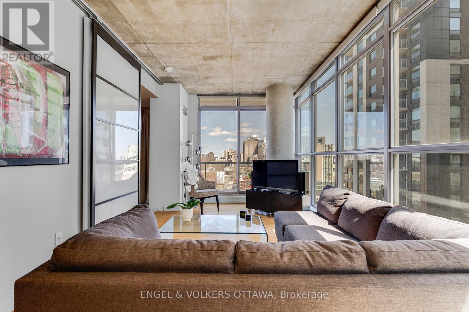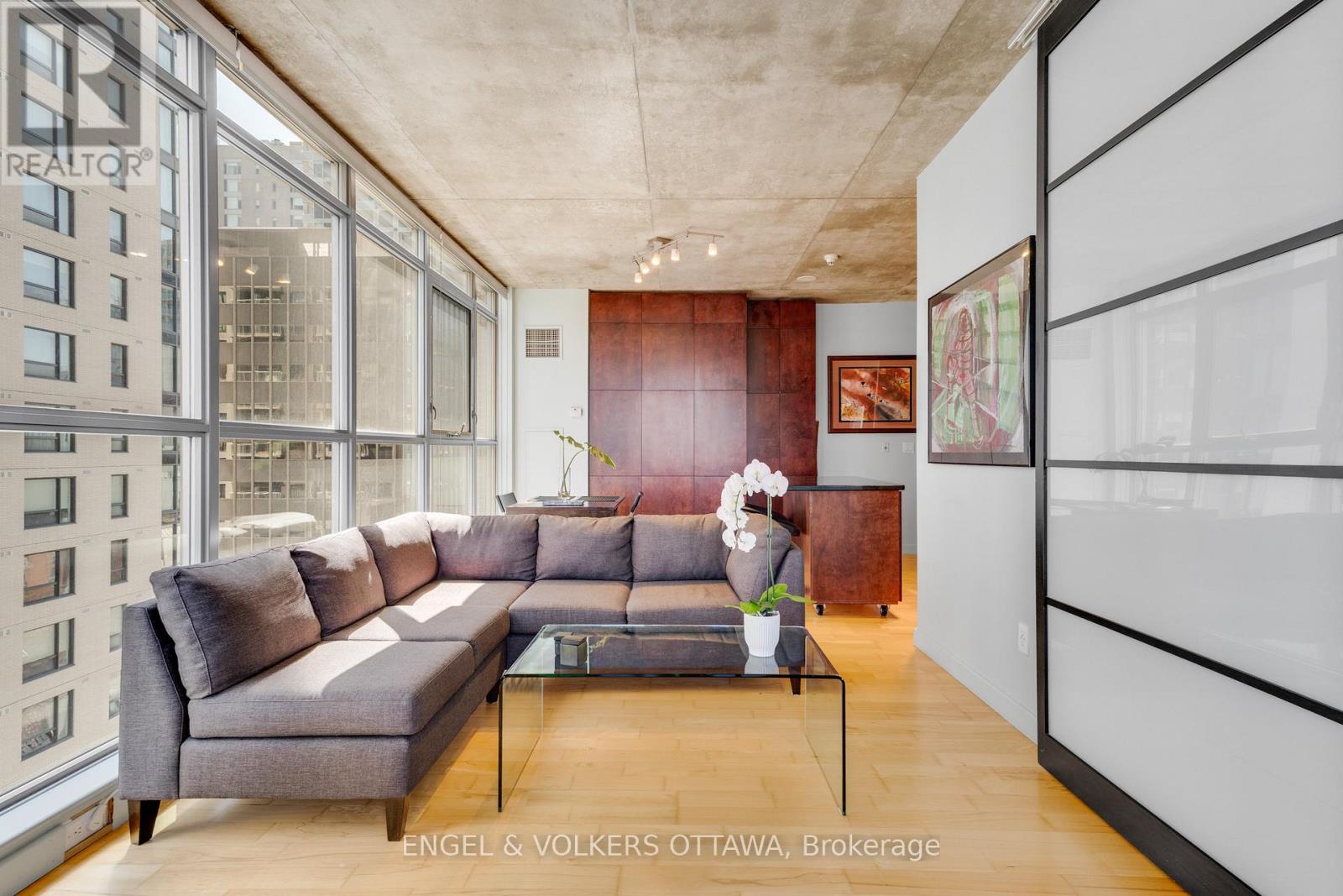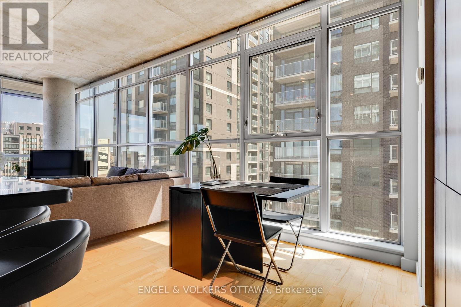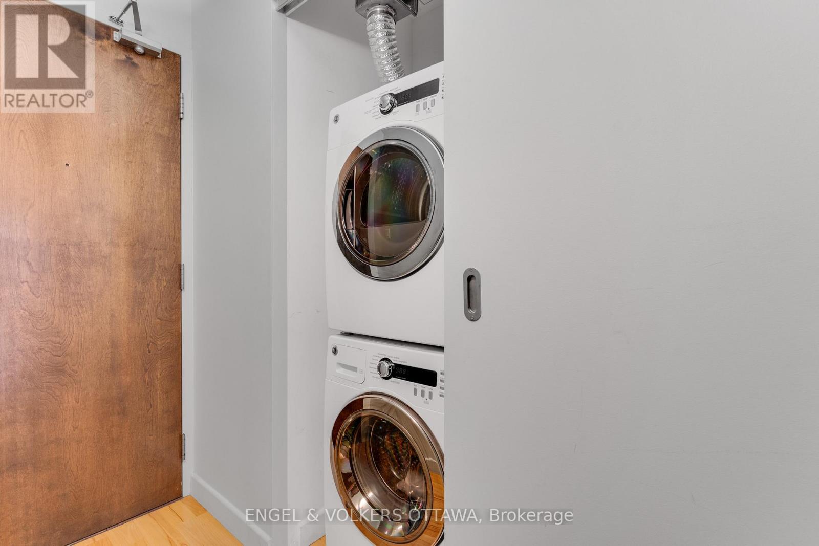 Welcome to this bright and spacious 1 bedroom + den condo at 179 George Street in the heart of Lower Town/Sandy Hill. Offering approximately 800-899 sq. ft., this south-east facing suite features an open balcony, in-suite laundry, and a comfortable layout ideal for both city living and working from home. Set in a well-managed brick and concrete building, this unit includes 1 owned underground parking space and a locker for added convenience. Monthly maintenance covers heat, hydro, and air conditioning, and the condo is being sold with flexible possession. Enjoy a prime downtown Ottawa location steps from the ByWard Market, shops, restaurants, transit, and everyday amenities. The suite includes appliances plus roller shades, making it move-in ready. (id:44758)