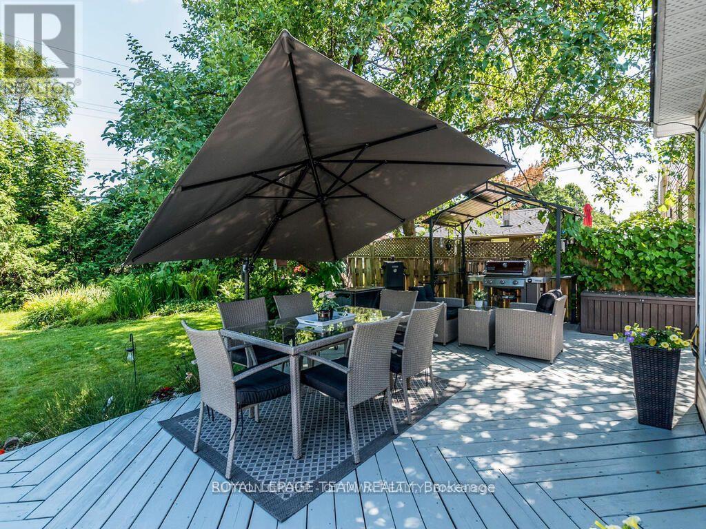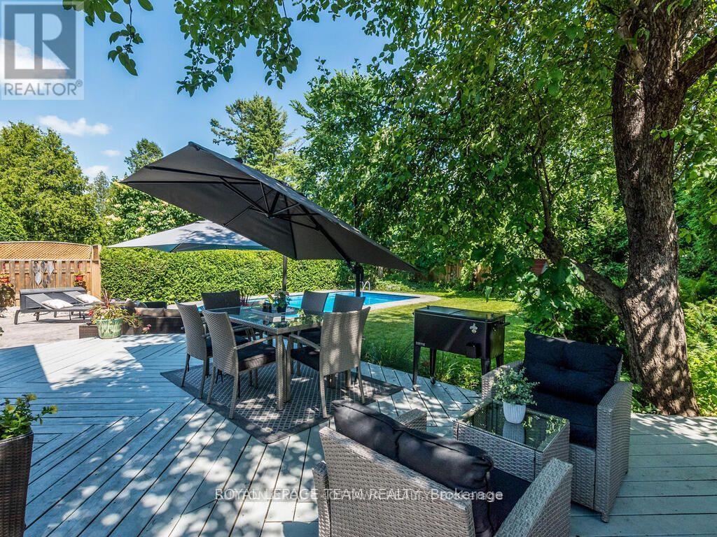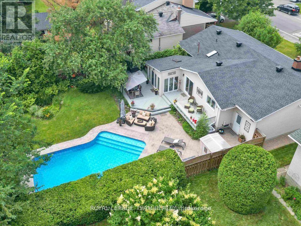 Classic charm meets modern luxury in this beautifully updated open-concept bungalow with a private backyard oasis. From the moment you step inside, oak hardwood floors, custom wainscoting, and an inviting living room with a traditional wood-burning fireplace set the tone. The chef-inspired kitchen is the heart of the home, featuring custom cabinetry, granite countertops, high-end stainless steel appliances, and an expansive island with prep sink and bar fridge. Elegant pendant lighting, specialized task lighting, and a dedicated coffee bar add both style and function. The space flows seamlessly into a bright 4-season sunroom with its own gas fireplace-perfect for year-round enjoyment. Premium window treatments and LED pot lights complete the space.The primary bedroom offers a peaceful retreat with a striking grasscloth accent wall and soft pot lighting. Two additional bedrooms are served by a spectacular spa-like main bathroom featuring heated soapstone floors, a walk-in shower with built-in bench, deep soaker tub, double sinks, and Corian countertops.The fully finished basement provides exceptional additional living space with plush newer carpeting and upgraded underpad. Highlights include a family/media room with projector and screen, dedicated music room, home gym area, fourth bedroom, and nearby three-piece bath. Ample storage includes a cedar closet, pantry, oversized laundry room, and spacious utility room.Outside, the landscaped backyard is a true retreat with two-tier decking, a heated in-ground saltwater pool with stamped concrete surround, relaxing hot tub, and BBQ gazebo-perfect for summer entertaining. Ideally located steps from the park and to everyday amenities, this exceptional home offers the perfect balance of comfort, style, and outdoor living. (id:44758)