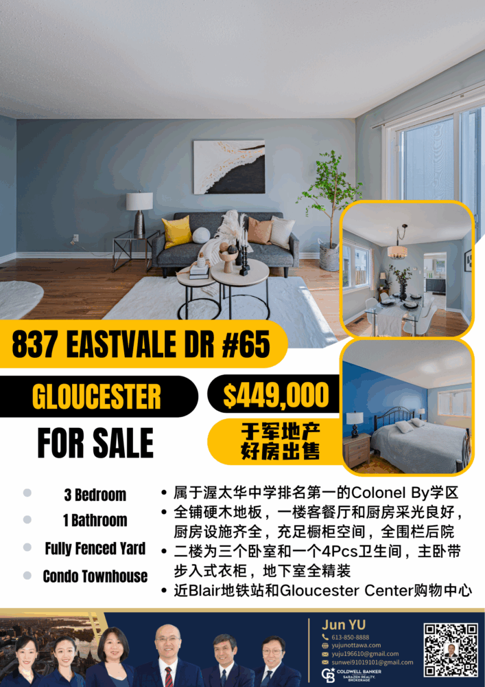 【于军地产 好房上市】位于Gloucester的精品联排别墅 🏡 65-837 Eastvale Dr #65 建筑年份:1971 🏙️ 维护良好的两层联排别墅,主层开放式布局,铺设硬木及复合地板,连接客厅与明亮餐厅。二楼全铺迷人硬木地板。 🍽 宽敞厨房与用餐区相连,提供充足橱柜空间。炉灶、冰箱、抽油烟机、洗衣机、烘干机等电器齐全。 🛏️ 楼上3间卧室,主卧带步入式衣帽间,与另两间卧室共用一间完整浴室。地下室已全面精装修,提供绝佳家庭娱乐空间。 🏡 位于Gloucester,临近安省排名第一的Colonel By SS,教育优势显著。步行可达即将开通的LRT轻轨站,交通便捷。社区公园环绕,生活设施如Metro、Costco等近在咫尺。公寓管理涵盖屋顶、门窗更换及除雪,无忧生活。 💲 Asking $449,000,自住投资的理想选择! 抓住机会,拥抱您的梦想生活!